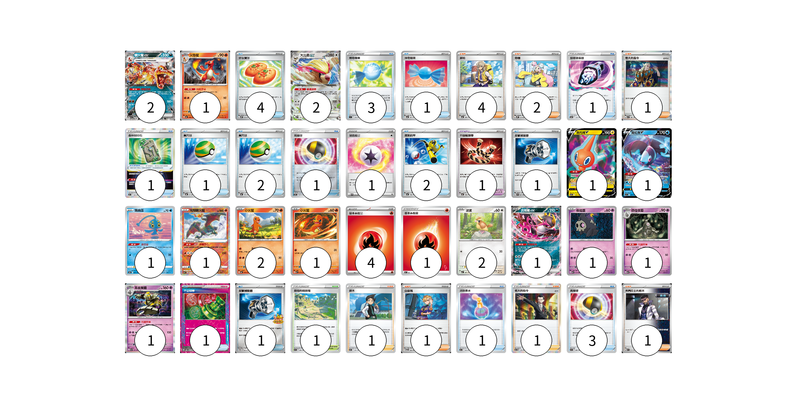 牌組構築方案 以此牌組為基礎新構築牌組 顯示卡面 顯示列表 寶可夢卡(18) 2 1 2 1 1 1 1 2 1 2 1 1 1 1 寶可夢道具(2) 1 1 物品卡(22) 4 3 1 1 1 2 1 2 1 1 1 1 3 支援者卡(11) 4 2 1 1 1 1 1 競技場卡(1) 1 能量卡(6) 1 4 1 寶可夢卡(18) 卡牌名稱 張數 卡牌名稱 張數 噴火龍ex SV4a 115/190 02 火恐龍 SV4a 026/190 01 大比鳥ex SV4a 139/190 02 洛托姆V S11 037/100 01 霓虹魚V S9 030/100 01 瑪納霏 S12a 029/172 01 光輝噴火龍 SVF 001/038 01 小火龍 SV4a 025/190 02 小火龍 SV3 012/108 01 波波 SV3 087/108 02 吉雉雞ex SV6a 038/064 01 夜巡靈 SV6a 018/064 01 彷徨夜靈 SV6a 019/064 01 黑夜魔靈 SV6a 020/064 01 寶可夢道具(2) 卡牌名稱 張數 卡牌名稱 張數 森林封印石 S12 092/098 01 不服輸頭帶 SV4a 168/190 01 物品卡(22) 卡牌名稱 張數 卡牌名稱 張數 好友寶芬 SV5K 063/071 04 神奇糖果 SI 376/414 03 神奇糖果 SV4a 163/190 01 放逐吸塵器 S12a 144/172 01 巢穴球 SVHK 012/022 01 巢穴球 SV4a 159/190 02 高級球 SO 020/030 01 厲害釣竿 SV4a 158/190 02 反擊捕捉器 SV4M 059/066 01 不公印章 SV5a 053/066 01 反擊捕捉器 SV-P 083/SV-P 01 消除香水 S9a 063/067 01 高級球 S9 089/100 03 支援者卡(11) 卡牌名稱 張數 卡牌名稱 張數 派帕 SV4a 180/190 04 奇樹 SVHK 019/022 02 老大的指令 SV4a 181/190 01 捩木 S11 097/100 01 白蕾雅 SV7 100/102 01 老大的指令(坂木) S4a 176/190 01 弗圖博士的劇本 SVK 034/042 01 競技場卡(1) 卡牌名稱 張數 卡牌名稱 張數 崩塌的競技場 S9 098/100 01 能量卡(6) 卡牌名稱 張數 卡牌名稱 張數 薄霧能量 SV5M 071/071 01 基本火能量 sv-p FIR 04 基本火能量 SH FIR 01 以此牌組為基礎新構築牌組 牌組編碼 NuqgyT-UzPUlq-BJduYj copy 列印牌組單 牌組編碼已複製 分享至SNS