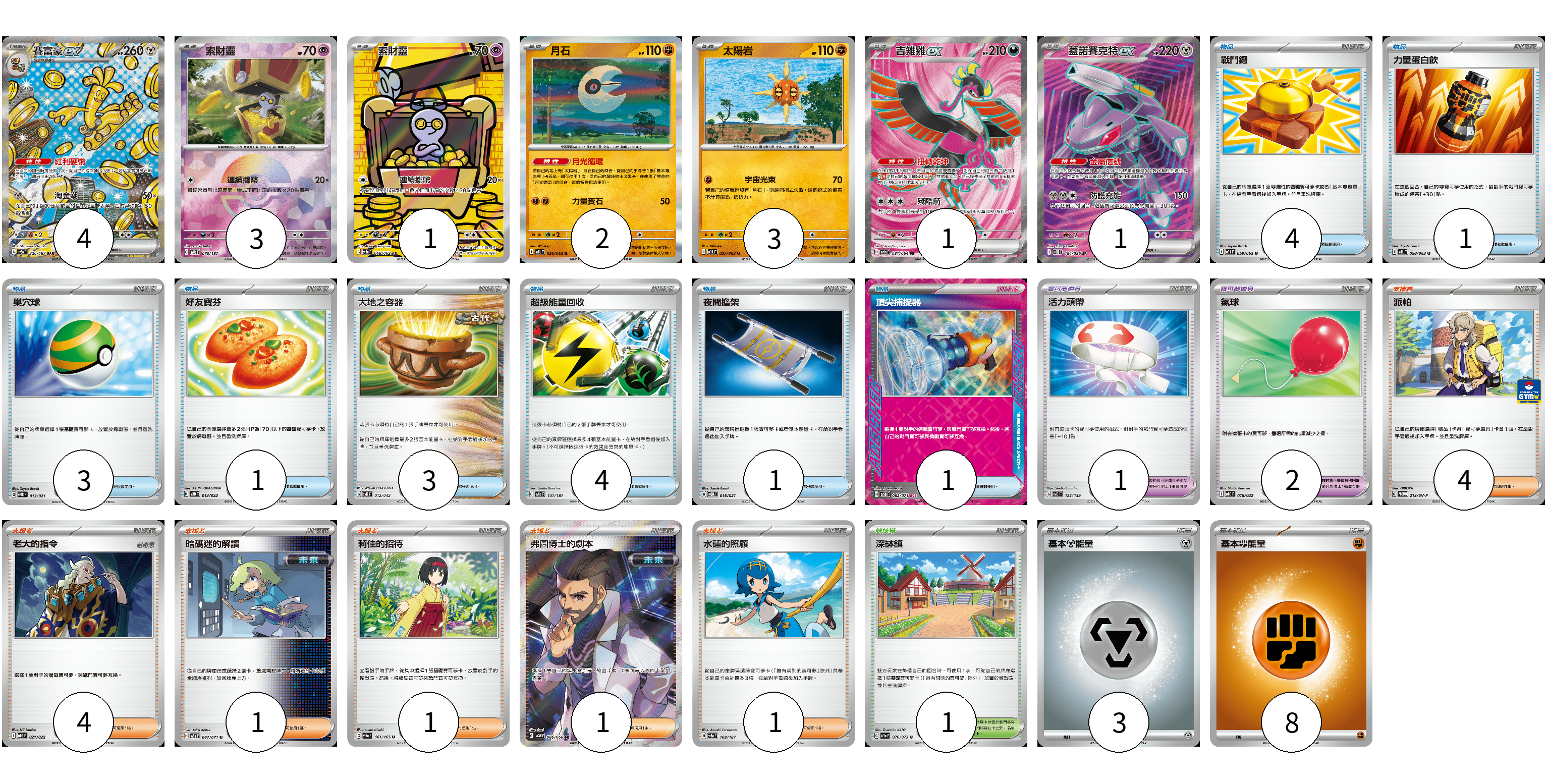 牌組構築方案 以此牌組為基礎新構築牌組 顯示卡面 顯示列表 寶可夢卡(15) 4 3 1 2 3 1 1 寶可夢道具(3) 1 2 物品卡(18) 4 1 3 1 3 4 1 1 支援者卡(12) 4 4 1 1 1 1 競技場卡(1) 1 能量卡(11) 3 8 寶可夢卡(15) 卡牌名稱 張數 卡牌名稱 張數 賽富豪ex SV8a 220/187 04 索財靈 SV8a 073/187 03 索財靈 SV3a 068/062 01 月石 M1L 026/063 02 太陽岩 M1L 027/063 03 吉雉雞ex SV6a 081/064 01 蓋諾賽克特ex SV11B 164/086 01 寶可夢道具(3) 卡牌名稱 張數 卡牌名稱 張數 活力頭帶 SVD 125/139 01 氣球 MBD 018/022 02 物品卡(18) 卡牌名稱 張數 卡牌名稱 張數 戰鬥鑼 M1L 059/063 04 力量蛋白飲 M1L 058/063 01 巢穴球 SVTR 013/021 03 好友寶芬 MBD 013/022 01 大地之容器 SVK 012/042 03 超級能量回收 SV8a 141/187 04 夜間擔架 SVOM 016/021 01 頂尖捕捉器 SV5M 062/071 01 支援者卡(12) 卡牌名稱 張數 卡牌名稱 張數 派帕 SV-P 213/SV-P 04 老大的指令 MBG 021/022 04 暗碼迷的解讀 SV5M 067/071 01 莉佳的招待 SV2a 161/165 01 弗圖博士的劇本 SV4M 086/066 01 水蓮的照顧 SV8a 168/187 01 競技場卡(1) 卡牌名稱 張數 卡牌名稱 張數 深缽鎮 SV1a 070/073 01 能量卡(11) 卡牌名稱 張數 卡牌名稱 張數 基本【鋼】能量 M-P MET 03 基本【鬥】能量 M-P FIG 08 以此牌組為基礎新構築牌組 牌組編碼 NyqmsH-JJFDqA-sLQsei copy 列印牌組單 牌組編碼已複製 分享至SNS