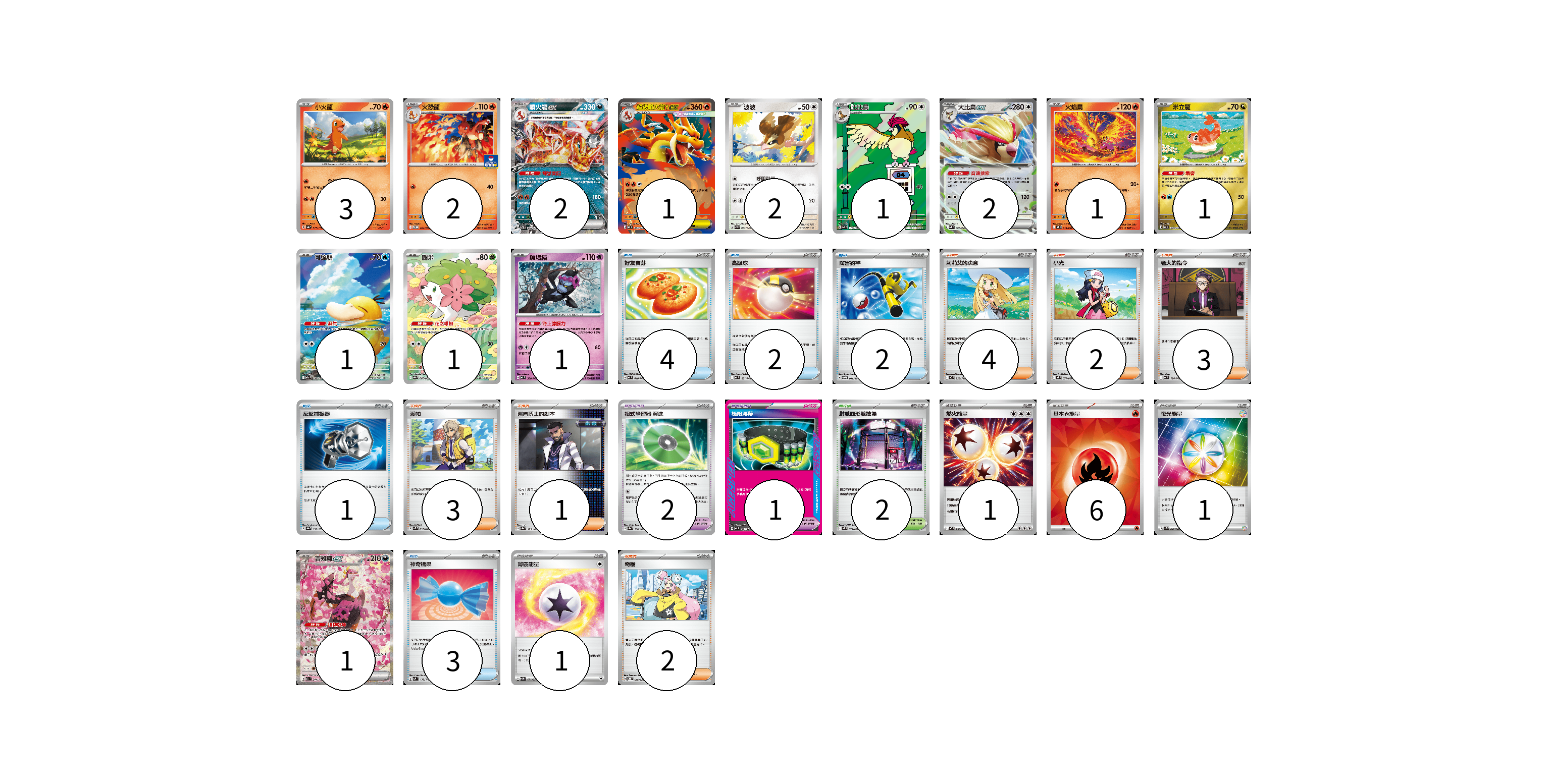 牌組構築方案 以此牌組為基礎新構築牌組 顯示卡面 顯示列表 寶可夢卡(19) 3 2 2 1 2 1 2 1 1 1 1 1 1 寶可夢道具(3) 2 1 物品卡(12) 4 2 2 1 3 支援者卡(15) 4 2 3 3 1 2 競技場卡(2) 2 能量卡(9) 1 6 1 1 寶可夢卡(19) 卡牌名稱 張數 卡牌名稱 張數 小火龍 SV4a 025/190 03 火恐龍 M-P 042/M-P 02 噴火龍ex SVTL 006/021 02 超級噴火龍Yex MC 085/742 01 波波 SVK 003/042 02 比比鳥 SV3 119/108 01 大比鳥ex SVK 005/042 02 火焰鳥 M2 014/080 01 米立龍 MC 549/742 01 可達鴨 M2a 199/193 01 謝米 SV9a 066/063 01 願增猿 MC 358/742 01 吉雉雞ex M2a 244/193 01 寶可夢道具(3) 卡牌名稱 張數 卡牌名稱 張數 招式學習器 演進 SV8a 160/187 02 極限腰帶 MC 691/742 01 物品卡(12) 卡牌名稱 張數 卡牌名稱 張數 好友寶芬 MC 648/742 04 高級球 MC 651/742 02 厲害釣竿 SVOM 011/021 02 反擊捕捉器 SV8a 139/187 01 神奇糖果 SVM 135/175 03 支援者卡(15) 卡牌名稱 張數 卡牌名稱 張數 莉莉艾的決意 MC 729/742 04 小光 M2 077/080 02 老大的指令 MC 724/742 03 派帕 SVK 035/042 03 弗圖博士的劇本 SV8a 175/187 01 奇樹 SVOD 016/020 02 競技場卡(2) 卡牌名稱 張數 卡牌名稱 張數 對戰圓形競技場 M2 079/080 02 能量卡(9) 卡牌名稱 張數 卡牌名稱 張數 燃火能量 MC 736/742 01 基本【火】能量 SVM FIR 06 夜光能量 SVK 042/042 01 薄霧能量 SV5M 071/071 01 以此牌組為基礎新構築牌組 牌組編碼 NzLViA-WvcJWN-DuPpAW copy 列印牌組單 牌組編碼已複製 分享至SNS