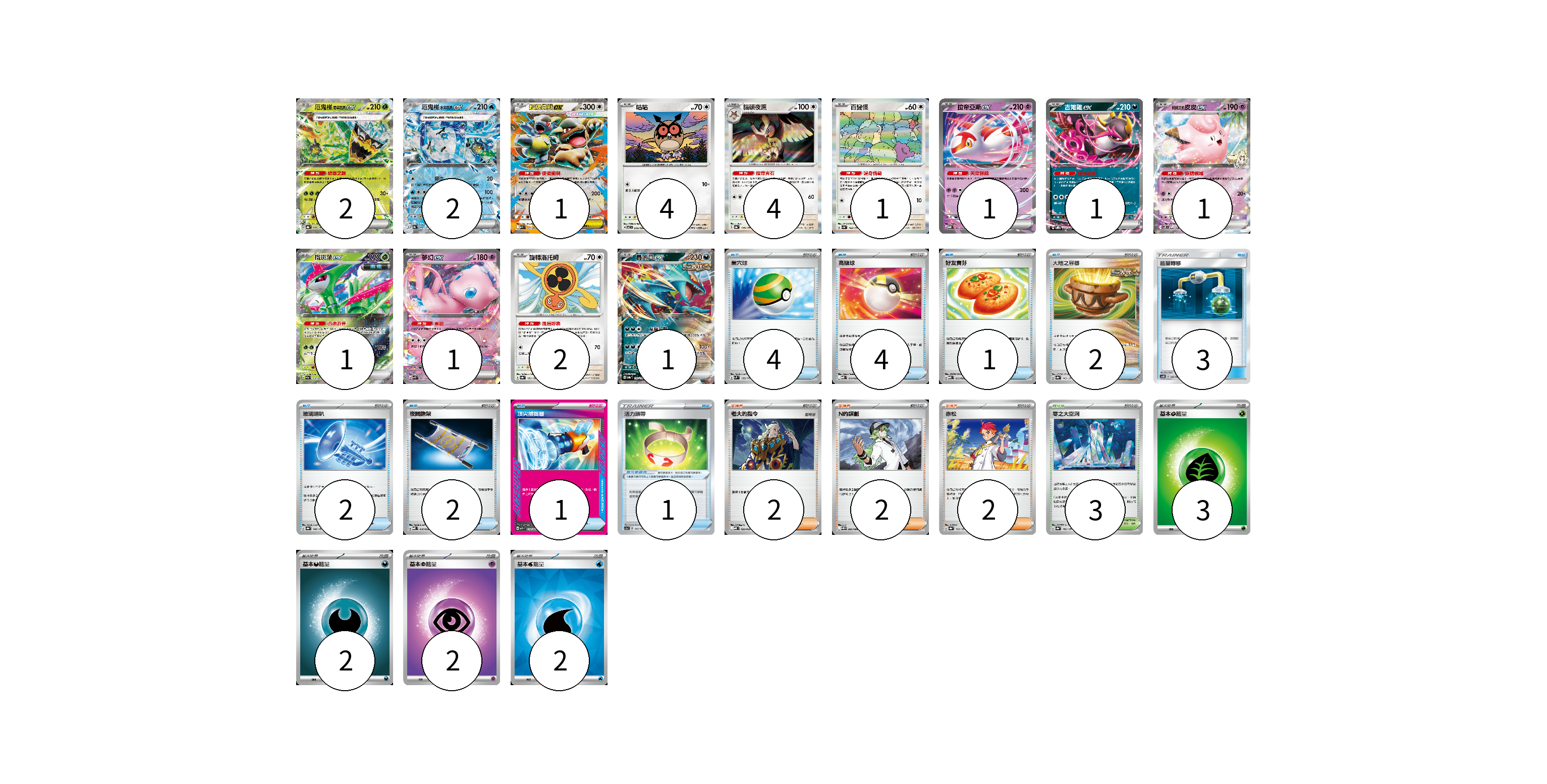 牌組構築方案 以此牌組為基礎新構築牌組 顯示卡面 顯示列表 寶可夢卡(22) 2 2 1 4 4 1 1 1 1 1 1 2 1 寶可夢道具(1) 1 物品卡(19) 4 4 1 2 3 2 2 1 支援者卡(6) 2 2 2 競技場卡(3) 3 能量卡(9) 3 2 2 2 寶可夢卡(22) 卡牌名稱 張數 卡牌名稱 張數 厄鬼椪 碧草面具ex SV8a 020/187 02 厄鬼椪 水井面具ex SV8a 050/187 02 超級袋獸ex M1S 051/063 01 咕咕 SV7 076/102 04 貓頭夜鷹 SV8a 128/187 04 百變怪 SV4a 144/190 01 拉帝亞斯ex MBD 003/022 01 吉雉雞ex SVOD 004/020 01 莉莉艾的皮皮ex SV9 033/100 01 鐵斑葉ex SV5M 016/071 01 夢幻ex SVK 001/042 01 旋轉洛托姆 SV8a 131/187 02 轟鳴月ex SV8a 101/187 01 寶可夢道具(1) 卡牌名稱 張數 卡牌名稱 張數 活力頭帶 SC1a 143/154 01 物品卡(19) 卡牌名稱 張數 卡牌名稱 張數 巢穴球 SVM 133/175 04 高級球 MBD 014/022 04 好友寶芬 MBD 013/022 01 大地之容器 SV8a 143/187 02 能量轉移 AS6D 142/168 03 玻璃喇叭 SV8a 140/187 02 夜間擔架 MBD 016/022 02 頂尖捕捉器 MBG 014/022 01 支援者卡(6) 卡牌名稱 張數 卡牌名稱 張數 老大的指令 MBD 020/022 02 N的謀劃 SV11B 083/086 02 赤松 SV8a 163/187 02 競技場卡(3) 卡牌名稱 張數 卡牌名稱 張數 零之大空洞 SV8a 182/187 03 能量卡(9) 卡牌名稱 張數 卡牌名稱 張數 基本【草】能量 M-P GRA 03 基本【惡】能量 M-P DAR 02 基本【超】能量 M-P PSY 02 基本【水】能量 SVK WAT 02 以此牌組為基礎新構築牌組 牌組編碼 OBVJvJ-CRGUok-MUAWFg copy 列印牌組單 牌組編碼已複製 分享至SNS