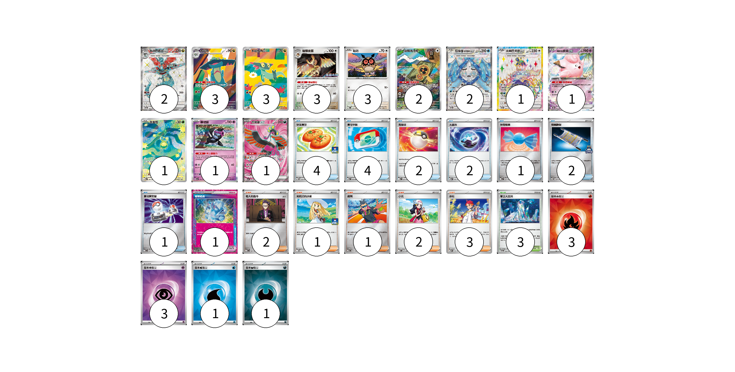 牌組構築方案 以此牌組為基礎新構築牌組 顯示卡面 顯示列表 寶可夢卡(23) 2 3 3 3 3 2 2 1 1 1 1 1 寶可夢道具(1) 1 物品卡(16) 4 4 2 2 1 2 1 支援者卡(9) 2 1 1 2 3 競技場卡(3) 3 能量卡(8) 3 3 1 1 寶可夢卡(23) 卡牌名稱 張數 卡牌名稱 張數 多龍巴魯托ex SV6 120/101 02 多龍奇 M2a 212/193 03 多龍梅西亞 M2a 211/193 03 貓頭夜鷹 SV-P 145/SV-P 03 咕咕 M2a 137/193 03 旋轉洛托姆 M2a 213/193 02 厄鬼椪 水井面具ex SV6 117/101 02 太樂巴戈斯ex SV7 122/102 01 莉莉艾的皮皮ex SV9 033/100 01 含羞苞 M2a 196/193 01 願增猿 SV8a 075/187 01 吉雉雞ex SV6a 081/064 01 寶可夢道具(1) 卡牌名稱 張數 卡牌名稱 張數 璀璨結晶 SV7 094/102 01 物品卡(16) 卡牌名稱 張數 卡牌名稱 張數 好友寶芬 SV-P 212/SV-P 04 寶可平板 M3 070/080 04 高級球 MC 651/742 02 太晶珠 SV8a 145/187 02 神奇糖果 MC 655/742 01 夜間擔架 SV-P 204/SV-P 02 寶可夢交替 MC 663/742 01 支援者卡(9) 卡牌名稱 張數 卡牌名稱 張數 老大的指令 MC 724/742 02 莉莉艾的決意 M-P 018/M-P 01 裁判 MC 711/742 01 小光 M2 077/080 02 赤松 SV8a 163/187 03 競技場卡(3) 卡牌名稱 張數 卡牌名稱 張數 零之大空洞 SV7 102/102 03 能量卡(8) 卡牌名稱 張數 卡牌名稱 張數 基本【火】能量 SVQL FIR 03 基本【超】能量 SVM PSY 03 基本【水】能量 SVM WAT 01 基本【惡】能量 SVOM DAR 01 以此牌組為基礎新構築牌組 牌組編碼 ODgRJJ-hwdxci-nTFhOM copy 列印牌組單 牌組編碼已複製 分享至SNS