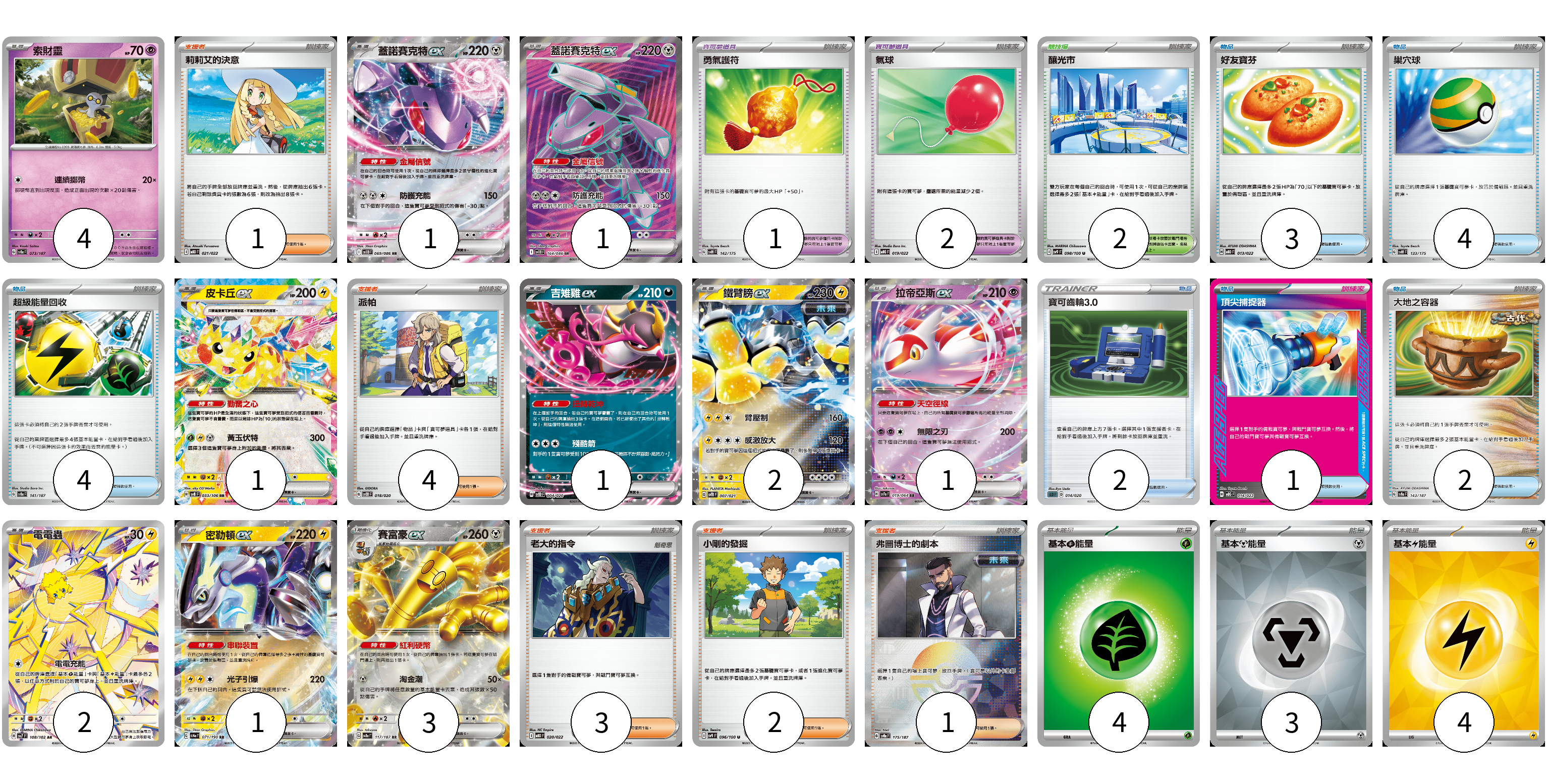 牌組構築方案 以此牌組為基礎新構築牌組 顯示卡面 顯示列表 寶可夢卡(17) 4 1 1 1 1 2 1 2 1 3 寶可夢道具(3) 1 2 物品卡(16) 3 4 4 2 1 2 支援者卡(11) 1 4 3 2 1 競技場卡(2) 2 能量卡(11) 4 3 4 寶可夢卡(17) 卡牌名稱 張數 卡牌名稱 張數 索財靈 SV8a 073/187 04 蓋諾賽克特ex SV11B 069/086 01 蓋諾賽克特ex SV11B 164/086 01 皮卡丘ex SV8 033/106 01 吉雉雞ex SVOD 004/020 01 鐵臂膀ex SVTR 007/021 02 拉帝亞斯ex SV7a 019/064 01 電電蟲 SV7 108/102 02 密勒頓ex SV4a 071/190 01 賽富豪ex SV8a 117/187 03 寶可夢道具(3) 卡牌名稱 張數 卡牌名稱 張數 勇氣護符 SVM 142/175 01 氣球 MBG 019/022 02 物品卡(16) 卡牌名稱 張數 卡牌名稱 張數 好友寶芬 MBD 013/022 03 巢穴球 SVM 133/175 04 超級能量回收 SV8a 141/187 04 寶可齒輪3.0 SLD 014/020 02 頂尖捕捉器 MBG 014/022 01 大地之容器 SV8a 143/187 02 支援者卡(11) 卡牌名稱 張數 卡牌名稱 張數 莉莉艾的決意 MBD 021/022 01 派帕 SVOD 018/020 04 老大的指令 MBD 020/022 03 小剛的發掘 SV9 096/100 02 弗圖博士的劇本 SV8a 175/187 01 競技場卡(2) 卡牌名稱 張數 卡牌名稱 張數 釀光市 SV9 098/100 02 能量卡(11) 卡牌名稱 張數 卡牌名稱 張數 基本【草】能量 M-P GRA 04 基本【鋼】能量 SVK MET 03 基本【雷】能量 SVK LIG 04 以此牌組為基礎新構築牌組 牌組編碼 ODghaa-HQuVVa-FFRAXM copy 列印牌組單 牌組編碼已複製 分享至SNS