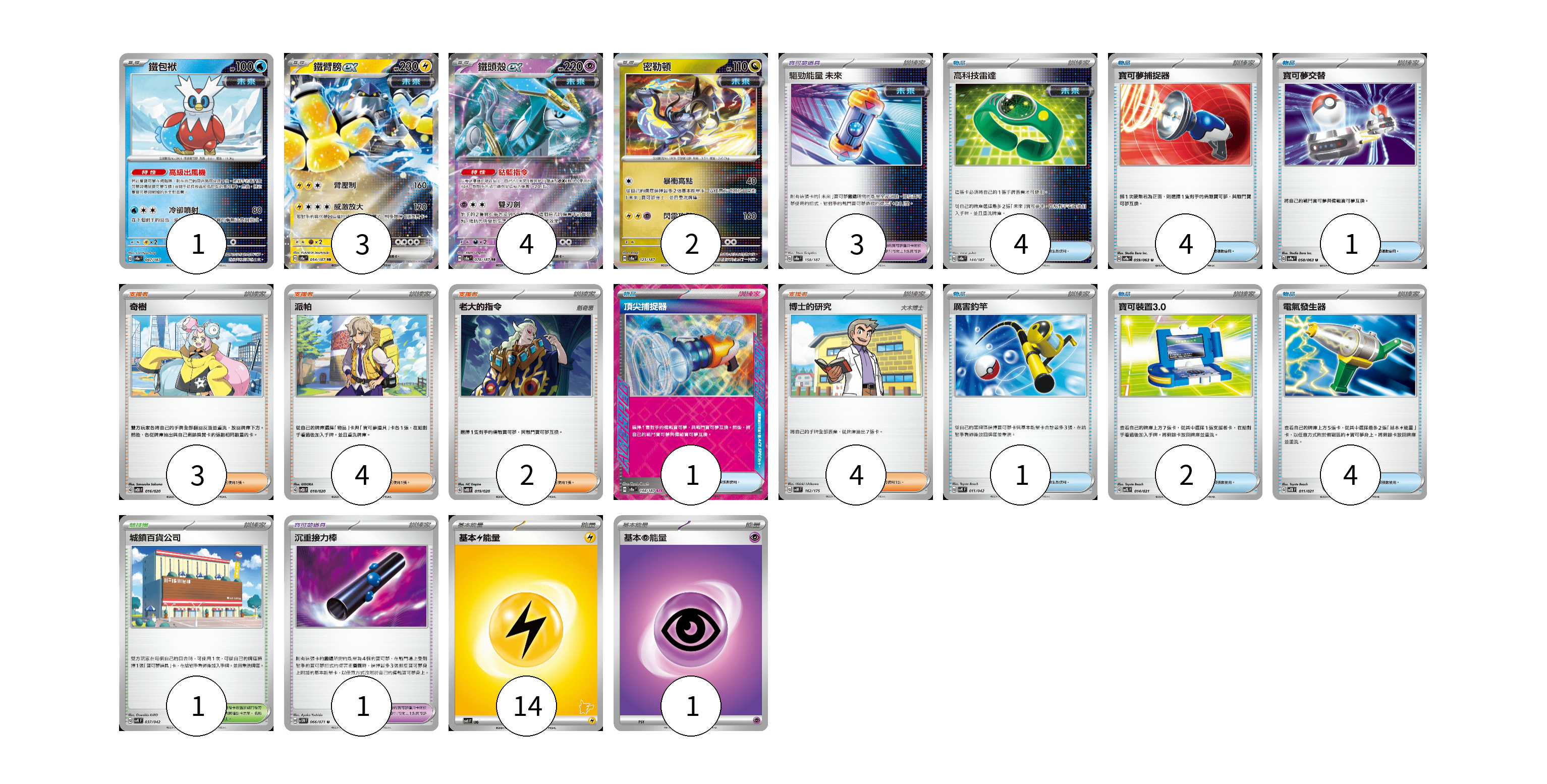 牌組構築方案 以此牌組為基礎新構築牌組 顯示卡面 顯示列表 寶可夢卡(10) 1 3 4 2 寶可夢道具(4) 3 1 物品卡(17) 4 4 1 1 1 2 4 支援者卡(13) 3 4 2 4 競技場卡(1) 1 能量卡(15) 14 1 寶可夢卡(10) 卡牌名稱 張數 卡牌名稱 張數 鐵包袱 SV8a 047/187 01 鐵臂膀ex SV8a 054/187 03 鐵頭殼ex SV8a 078/187 04 密勒頓 SV8a 123/187 02 寶可夢道具(4) 卡牌名稱 張數 卡牌名稱 張數 驅勁能量 未來 SV8a 158/187 03 沉重接力棒 SV5M 066/071 01 物品卡(17) 卡牌名稱 張數 卡牌名稱 張數 高科技雷達 SV8a 144/187 04 寶可夢捕捉器 SV9a 059/063 04 寶可夢交替 SV9a 058/063 01 頂尖捕捉器 SV8a 148/187 01 厲害釣竿 SVK 011/042 01 寶可裝置3.0 SVTL 014/021 02 電氣發生器 SVTR 011/021 04 支援者卡(13) 卡牌名稱 張數 卡牌名稱 張數 奇樹 SVOD 016/020 03 派帕 SVOD 018/020 04 老大的指令 SVOD 019/020 02 博士的研究 SVM 162/175 04 競技場卡(1) 卡牌名稱 張數 卡牌名稱 張數 城鎮百貨公司 SVK 037/042 01 能量卡(15) 卡牌名稱 張數 卡牌名稱 張數 基本【雷】能量 SVI LIG 14 基本【超】能量 SVTS PSY 01 以此牌組為基礎新構築牌組 牌組編碼 OEwhHN-nMQGWz-kcifuQ copy 列印牌組單 牌組編碼已複製 分享至SNS