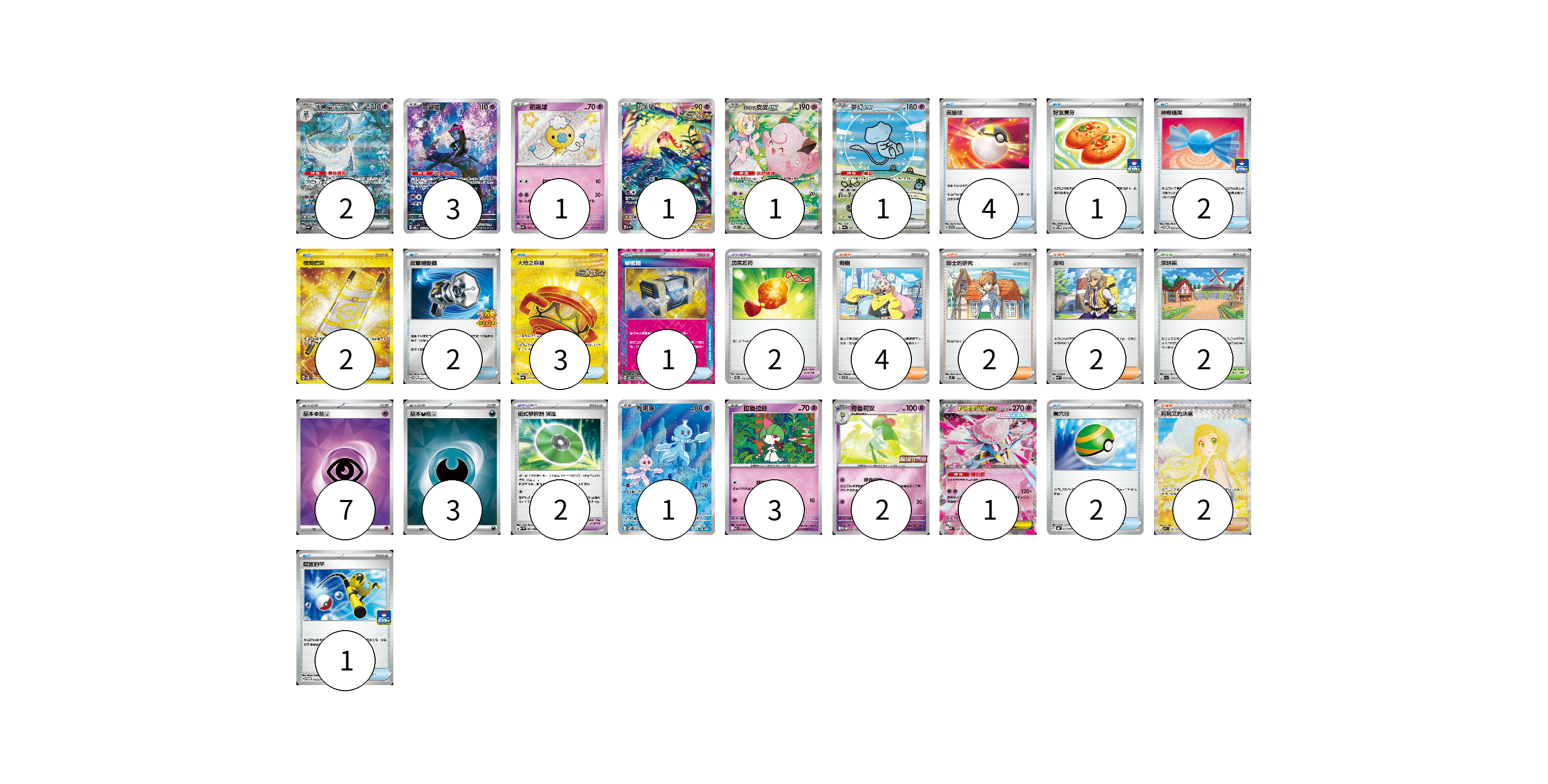 牌組構築方案 以此牌組為基礎新構築牌組 顯示卡面 顯示列表 寶可夢卡(16) 2 3 1 1 1 1 1 3 2 1 寶可夢道具(4) 2 2 物品卡(18) 4 1 2 2 2 3 1 2 1 支援者卡(10) 4 2 2 2 競技場卡(2) 2 能量卡(10) 7 3 寶可夢卡(16) 卡牌名稱 張數 卡牌名稱 張數 沙奈朵ex SV4a 348/190 02 願增猿 SV6 107/101 03 飄飄球 SV4a 260/190 01 吼叫尾 SV4K 071/066 01 莉莉艾的皮皮ex SV9 126/100 01 夢幻ex SV4a 347/190 01 輕飄飄 SV11W 124/086 01 拉魯拉絲 M1S 040/063 03 奇魯莉安 M-P 006/M-P 02 超級蒂安希ex MBD 006/022 01 寶可夢道具(4) 卡牌名稱 張數 卡牌名稱 張數 勇氣護符 SVEM 016/020 02 招式學習器 演進 SV4M 063/066 02 物品卡(18) 卡牌名稱 張數 卡牌名稱 張數 高級球 SVTG 013/019 04 好友寶芬 SV-P 212/SV-P 01 神奇糖果 SV-P 104/SV-P 02 夜間擔架 SV8 137/106 02 反擊捕捉器 SV-P 083/SV-P 02 大地之容器 SV6a 093/064 03 秘密箱 SV6 092/101 01 巢穴球 SVHK 012/022 02 厲害釣竿 SV-P 112/SV-P 01 支援者卡(10) 卡牌名稱 張數 卡牌名稱 張數 奇樹 SVTH 015/018 04 博士的研究 SVM 166/175 02 派帕 SVK 035/042 02 莉莉艾的決意 M1L 091/063 02 競技場卡(2) 卡牌名稱 張數 卡牌名稱 張數 深缽鎮 SV1a 070/073 02 能量卡(10) 卡牌名稱 張數 卡牌名稱 張數 基本【超】能量 SVOD PSY 07 基本【惡】能量 SVK DAR 03 以此牌組為基礎新構築牌組 牌組編碼 OFRDHt-pGeXQJ-sRTeXj copy 列印牌組單 牌組編碼已複製 分享至SNS