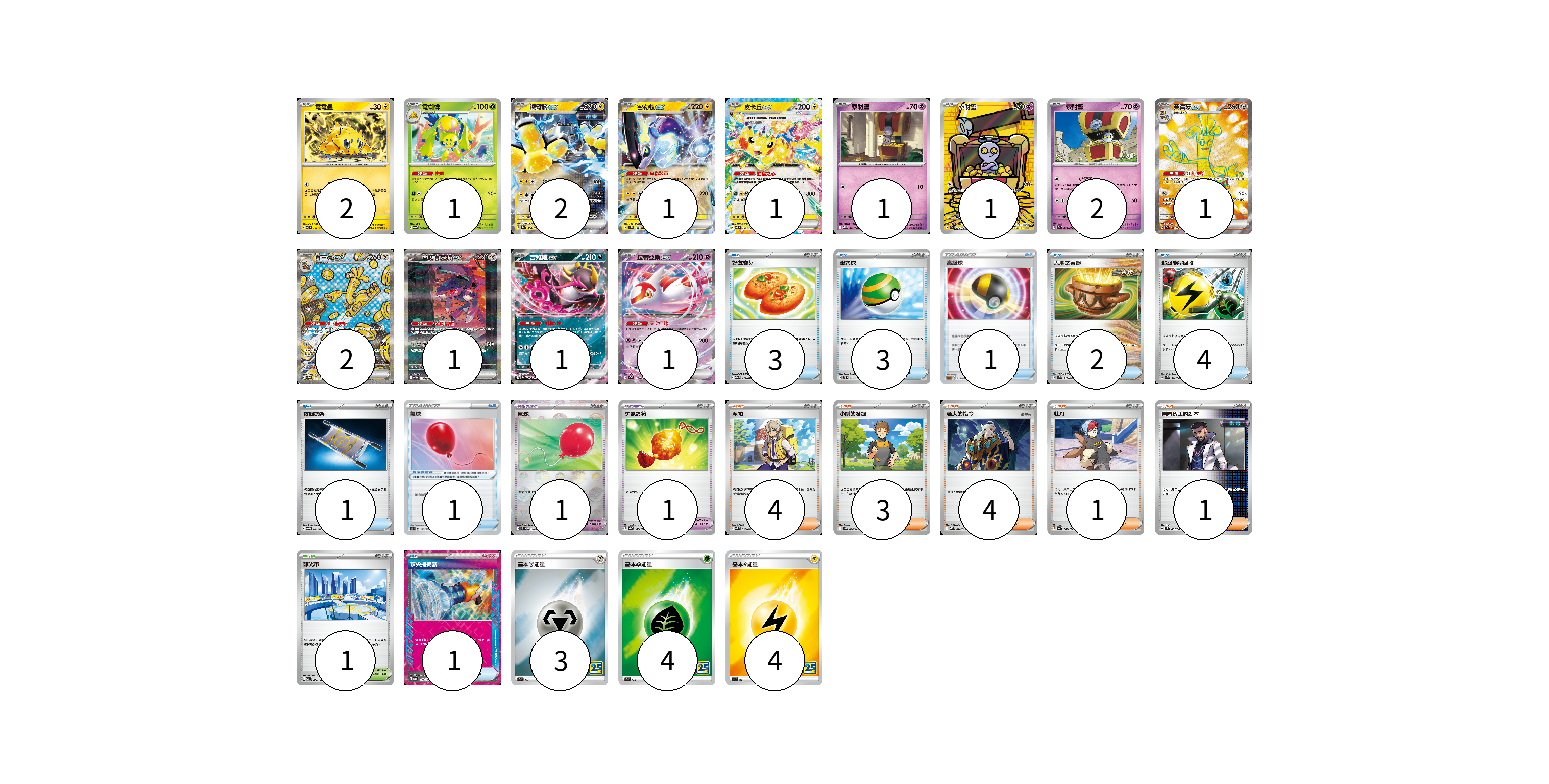 牌組構築方案 以此牌組為基礎新構築牌組 顯示卡面 顯示列表 寶可夢卡(17) 2 1 2 1 1 1 1 2 1 2 1 1 1 寶可夢道具(3) 1 1 1 物品卡(15) 3 3 1 2 4 1 1 支援者卡(13) 4 3 4 1 1 競技場卡(1) 1 能量卡(11) 3 4 4 寶可夢卡(17) 卡牌名稱 張數 卡牌名稱 張數 電電蟲 SV7 032/102 02 電蜘蛛 SV6a 002/064 01 鐵臂膀ex SV8a 054/187 02 密勒頓ex SV1V 037/078 01 皮卡丘ex SV8 033/106 01 索財靈 M1L 019/063 01 索財靈 SV3a 068/062 01 索財靈 SV7a 024/064 02 賽富豪ex SV3a 079/062 01 賽富豪ex SV8a 220/187 02 蓋諾賽克特ex SV11B 172/086 01 吉雉雞ex SV8a 104/187 01 拉帝亞斯ex SV7a 019/064 01 寶可夢道具(3) 卡牌名稱 張數 卡牌名稱 張數 氣球 S8b 145/184 01 氣球 SV11B 082/086 01 勇氣護符 SV4a 169/190 01 物品卡(15) 卡牌名稱 張數 卡牌名稱 張數 好友寶芬 MBG 011/022 03 巢穴球 SVTS 013/022 03 高級球 SLL 013/021 01 大地之容器 SVK 012/042 02 超級能量回收 SVK 010/042 04 夜間擔架 SVOM 016/021 01 頂尖捕捉器 SV8a 148/187 01 支援者卡(13) 卡牌名稱 張數 卡牌名稱 張數 派帕 SVK 035/042 04 小剛的發掘 SV9 096/100 03 老大的指令 MBD 020/022 04 牡丹 SV4a 182/190 01 弗圖博士的劇本 SV4M 065/066 01 競技場卡(1) 卡牌名稱 張數 卡牌名稱 張數 釀光市 SV9 098/100 01 能量卡(11) 卡牌名稱 張數 卡牌名稱 張數 基本鋼能量 S8a MET 03 基本草能量 S8a GRA 04 基本雷能量 S8a LIG 04 以此牌組為基礎新構築牌組 牌組編碼 OGQdyj-yyvJJE-DghAAf copy 列印牌組單 牌組編碼已複製 分享至SNS