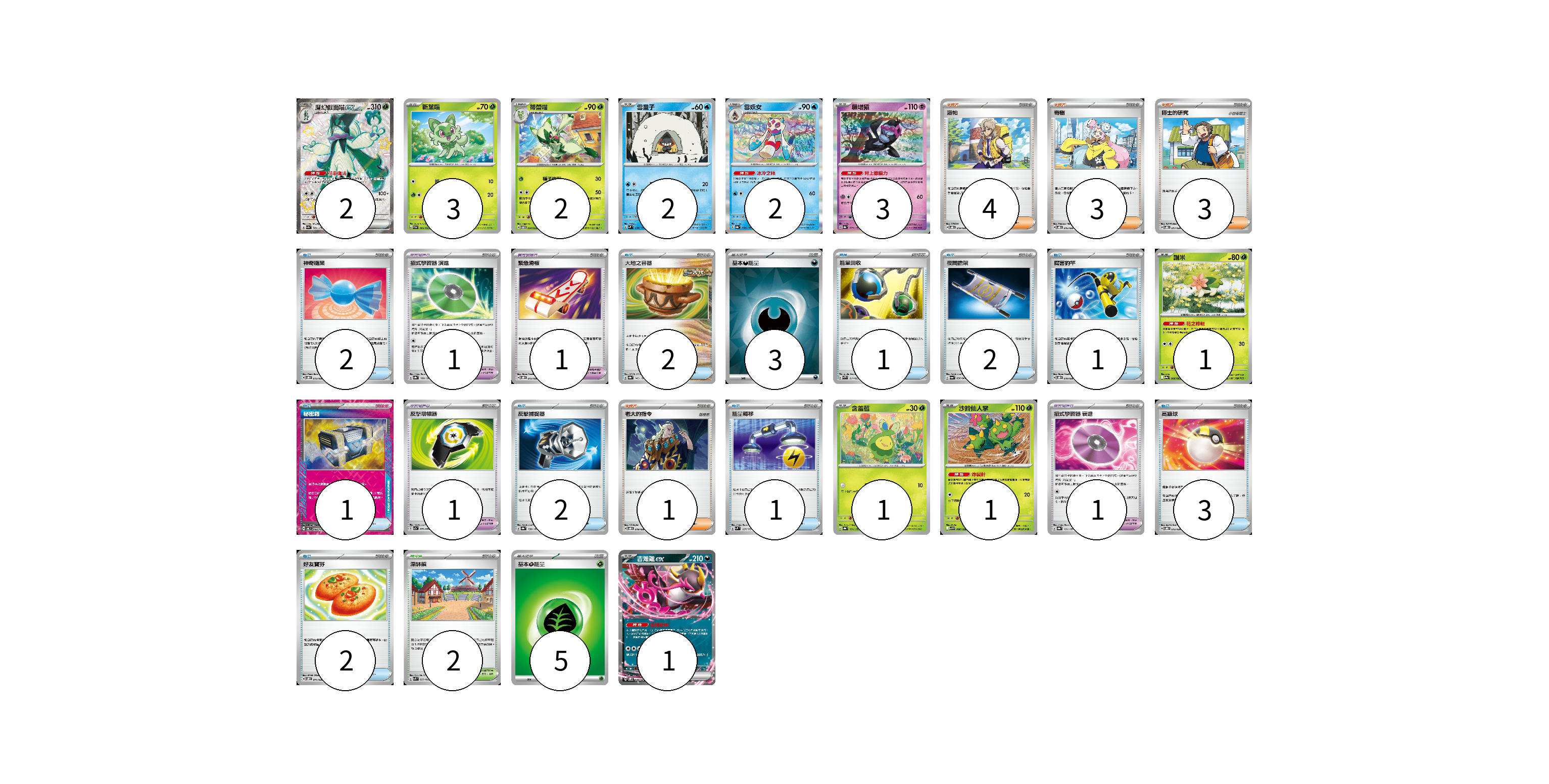牌組構築方案 以此牌組為基礎新構築牌組 顯示卡面 顯示列表 寶可夢卡(18) 2 3 2 2 2 3 1 1 1 1 寶可夢道具(4) 1 1 1 1 物品卡(17) 2 2 1 2 1 1 2 1 3 2 支援者卡(11) 4 3 3 1 競技場卡(2) 2 能量卡(8) 3 5 寶可夢卡(18) 卡牌名稱 張數 卡牌名稱 張數 魔幻假面喵ex SV4a 321/190 02 新葉喵 SVAM 004/023 03 蒂蕾喵 SVTM 004/022 02 雪童子 SVM 034/175 02 雪妖女 SV8a 038/187 02 願增猿 SV8a 075/187 03 謝米 SV9a 006/063 01 含羞苞 SV8a 001/187 01 沙鈴仙人掌 SV9 006/100 01 吉雉雞ex SVOM 009/021 01 寶可夢道具(4) 卡牌名稱 張數 卡牌名稱 張數 招式學習器 演進 SV8a 160/187 01 緊急滑板 SVOD 015/020 01 反擊增幅器 SV7a 059/064 01 招式學習器 衰退 SV8a 161/187 01 物品卡(17) 卡牌名稱 張數 卡牌名稱 張數 神奇糖果 SVOD 013/020 02 大地之容器 SV8a 143/187 02 能量回收 SVAW 011/023 01 夜間擔架 SV6a 056/064 02 厲害釣竿 SVOD 010/020 01 秘密箱 SV6 092/101 01 反擊捕捉器 SV8a 139/187 02 能量轉移 SVM 127/175 01 高級球 SVOD 012/020 03 好友寶芬 SVOD 011/020 02 支援者卡(11) 卡牌名稱 張數 卡牌名稱 張數 派帕 SVOD 018/020 04 奇樹 SVOD 016/020 03 博士的研究 SVOD 017/020 03 老大的指令 SVOD 019/020 01 競技場卡(2) 卡牌名稱 張數 卡牌名稱 張數 深缽鎮 SVK 039/042 02 能量卡(8) 卡牌名稱 張數 卡牌名稱 張數 基本【惡】能量 SVOM DAR 03 基本草能量 sv-p GRA 05 以此牌組為基礎新構築牌組 牌組編碼 OGmZpD-SpKDKE-qwebOI copy 列印牌組單 牌組編碼已複製 分享至SNS