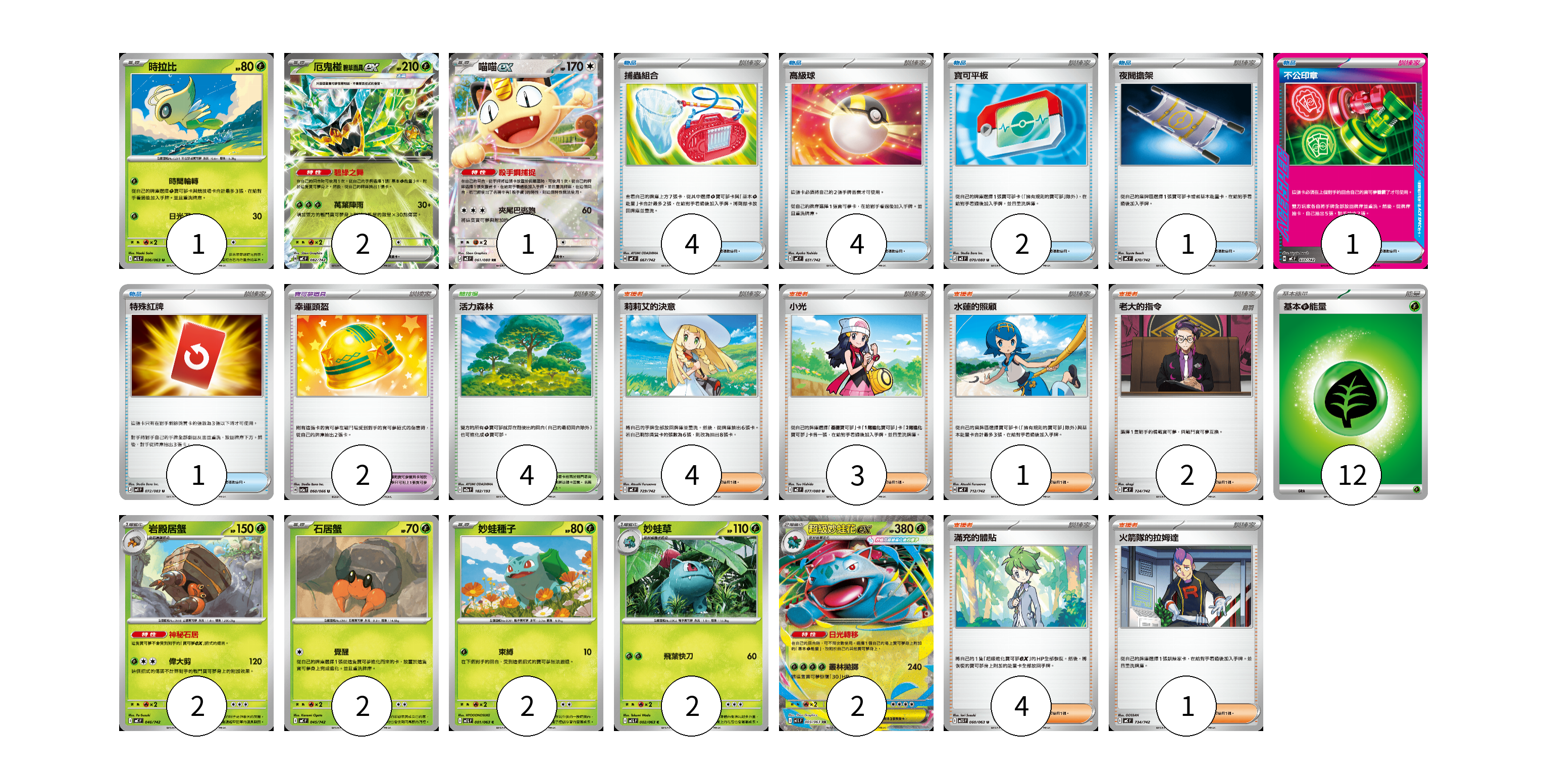 牌組構築方案 以此牌組為基礎新構築牌組 顯示卡面 顯示列表 寶可夢卡(14) 1 2 1 2 2 2 2 2 寶可夢道具(2) 2 物品卡(13) 4 4 2 1 1 1 支援者卡(15) 4 3 1 2 4 1 競技場卡(4) 4 能量卡(12) 12 寶可夢卡(14) 卡牌名稱 張數 卡牌名稱 張數 時拉比 M1L 006/063 01 厄鬼椪 碧草面具ex MC 082/742 02 喵喵ex M3 061/080 01 岩殿居蟹 MC 046/742 02 石居蟹 MC 045/742 02 妙蛙種子 M1L 001/063 02 妙蛙草 M1L 002/063 02 超級妙蛙花ex M1L 003/063 02 寶可夢道具(2) 卡牌名稱 張數 卡牌名稱 張數 幸運頭盔 SV5a 060/066 02 物品卡(13) 卡牌名稱 張數 卡牌名稱 張數 捕蟲組合 MC 667/742 04 高級球 MC 651/742 04 寶可平板 M3 070/080 02 夜間擔架 MC 670/742 01 不公印章 MC 633/742 01 特殊紅牌 M4 072/083 01 支援者卡(15) 卡牌名稱 張數 卡牌名稱 張數 莉莉艾的決意 MC 729/742 04 小光 M2 077/080 03 水蓮的照顧 MC 712/742 01 老大的指令 MC 724/742 02 滿充的體貼 M1S 060/063 04 火箭隊的拉姆達 MC 734/742 01 競技場卡(4) 卡牌名稱 張數 卡牌名稱 張數 活力森林 M2a 182/193 04 能量卡(12) 卡牌名稱 張數 卡牌名稱 張數 基本【草】能量 MJ GRA 12 以此牌組為基礎新構築牌組 牌組編碼 OHTzJC-HuqrfT-XKwErD copy 列印牌組單 牌組編碼已複製 分享至SNS