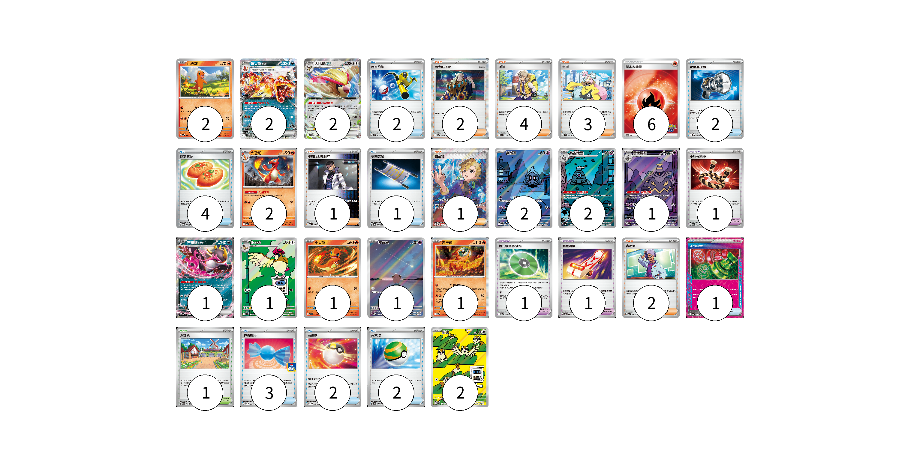牌組構築方案 以此牌組為基礎新構築牌組 顯示卡面 顯示列表 寶可夢卡(22) 2 2 2 2 2 2 2 1 1 1 1 1 1 2 寶可夢道具(3) 1 1 1 物品卡(15) 2 4 1 1 3 2 2 支援者卡(13) 2 4 3 1 1 2 競技場卡(1) 1 能量卡(6) 6 寶可夢卡(22) 卡牌名稱 張數 卡牌名稱 張數 小火龍 SV2a 004/165 02 噴火龍ex SV3 066/108 02 大比鳥ex SV3 089/108 02 厲害釣竿 SVEL 010/020 02 火恐龍 SV4a 026/190 02 夜巡靈 SV6a 068/064 02 彷徨夜靈 SV6a 069/064 02 黑夜魔靈 SV6a 070/064 01 吉雉雞ex SV6a 038/064 01 比比鳥 SV3 119/108 01 小火龍 SV3 012/108 01 皮寶寶 SV3 113/108 01 古玉魚 SV8a 025/187 01 波波 SV3 118/108 02 寶可夢道具(3) 卡牌名稱 張數 卡牌名稱 張數 不服輸頭帶 SV1S 073/078 01 招式學習器 演進 SV8a 160/187 01 緊急滑板 SVOD 015/020 01 物品卡(15) 卡牌名稱 張數 卡牌名稱 張數 反擊捕捉器 SV4M 059/066 02 好友寶芬 SV5K 063/071 04 夜間擔架 SV6a 056/064 01 不公印章 SV5a 053/066 01 神奇糖果 SV-P 104/SV-P 03 高級球 SVOD 012/020 02 巢穴球 SVM 133/175 02 支援者卡(13) 卡牌名稱 張數 卡牌名稱 張數 老大的指令 SV1a 069/073 02 派帕 SVD 137/139 04 奇樹 SVEL 016/020 03 弗圖博士的劇本 SVHM 021/022 01 白蕾雅 SV7 126/102 01 吉尼亞 SVD 129/139 02 競技場卡(1) 卡牌名稱 張數 卡牌名稱 張數 深缽鎮 SVK 039/042 01 能量卡(6) 卡牌名稱 張數 卡牌名稱 張數 基本火能量 S10b FIR 06 以此牌組為基礎新構築牌組 牌組編碼 OIFDpN-fFRexM-dvZXTn copy 列印牌組單 牌組編碼已複製 分享至SNS