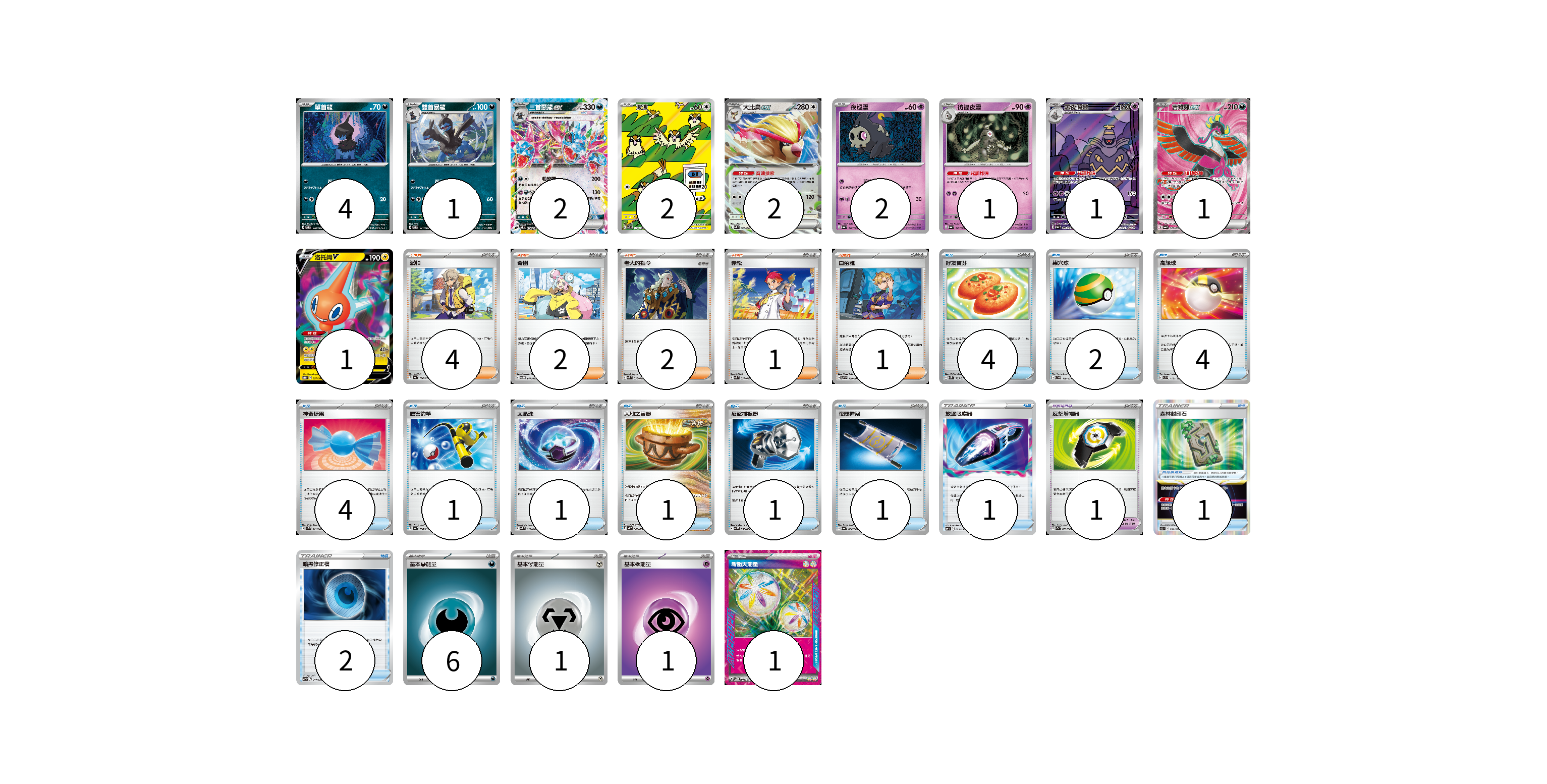 牌組構築方案 以此牌組為基礎新構築牌組 顯示卡面 顯示列表 寶可夢卡(17) 4 1 2 2 2 2 1 1 1 1 寶可夢道具(2) 1 1 物品卡(22) 4 2 4 4 1 1 1 1 1 1 2 支援者卡(10) 4 2 2 1 1 能量卡(9) 6 1 1 1 寶可夢卡(17) 卡牌名稱 張數 卡牌名稱 張數 單首龍 SV8 070/106 04 雙首暴龍 SV8 071/106 01 三首惡龍ex SV8 072/106 02 波波 SV3 118/108 02 大比鳥ex SVK 005/042 02 夜巡靈 SV6a 018/064 02 彷徨夜靈 SV6a 019/064 01 黑夜魔靈 SV6a 070/064 01 吉雉雞ex SV6a 081/064 01 洛托姆V S11 037/100 01 寶可夢道具(2) 卡牌名稱 張數 卡牌名稱 張數 反擊增幅器 SV7a 059/064 01 森林封印石 S12 092/098 01 物品卡(22) 卡牌名稱 張數 卡牌名稱 張數 好友寶芬 SV5K 063/071 04 巢穴球 SVD 118/139 02 高級球 SVD 119/139 04 神奇糖果 SVK 019/042 04 厲害釣竿 SV4a 158/190 01 太晶珠 SVK 013/042 01 大地之容器 SV4K 060/066 01 反擊捕捉器 SV4M 059/066 01 夜間擔架 SV6a 056/064 01 放逐吸塵器 SVF 023/038 01 暗黑修正檔 SVF 014/038 02 支援者卡(10) 卡牌名稱 張數 卡牌名稱 張數 派帕 SV4a 180/190 04 奇樹 SVTM 017/022 02 老大的指令 SVK 036/042 02 赤松 SVK 027/042 01 白蕾雅 SV7 100/102 01 能量卡(9) 卡牌名稱 張數 卡牌名稱 張數 基本惡能量 sv-p DAR 06 基本鋼能量 sv-p MET 01 基本超能量 sv-p PSY 01 新衝天能量 SV5K 071/071 01 以此牌組為基礎新構築牌組 牌組編碼 OIKcZf-nyCvFQ-kiKpNm copy 列印牌組單 牌組編碼已複製 分享至SNS
