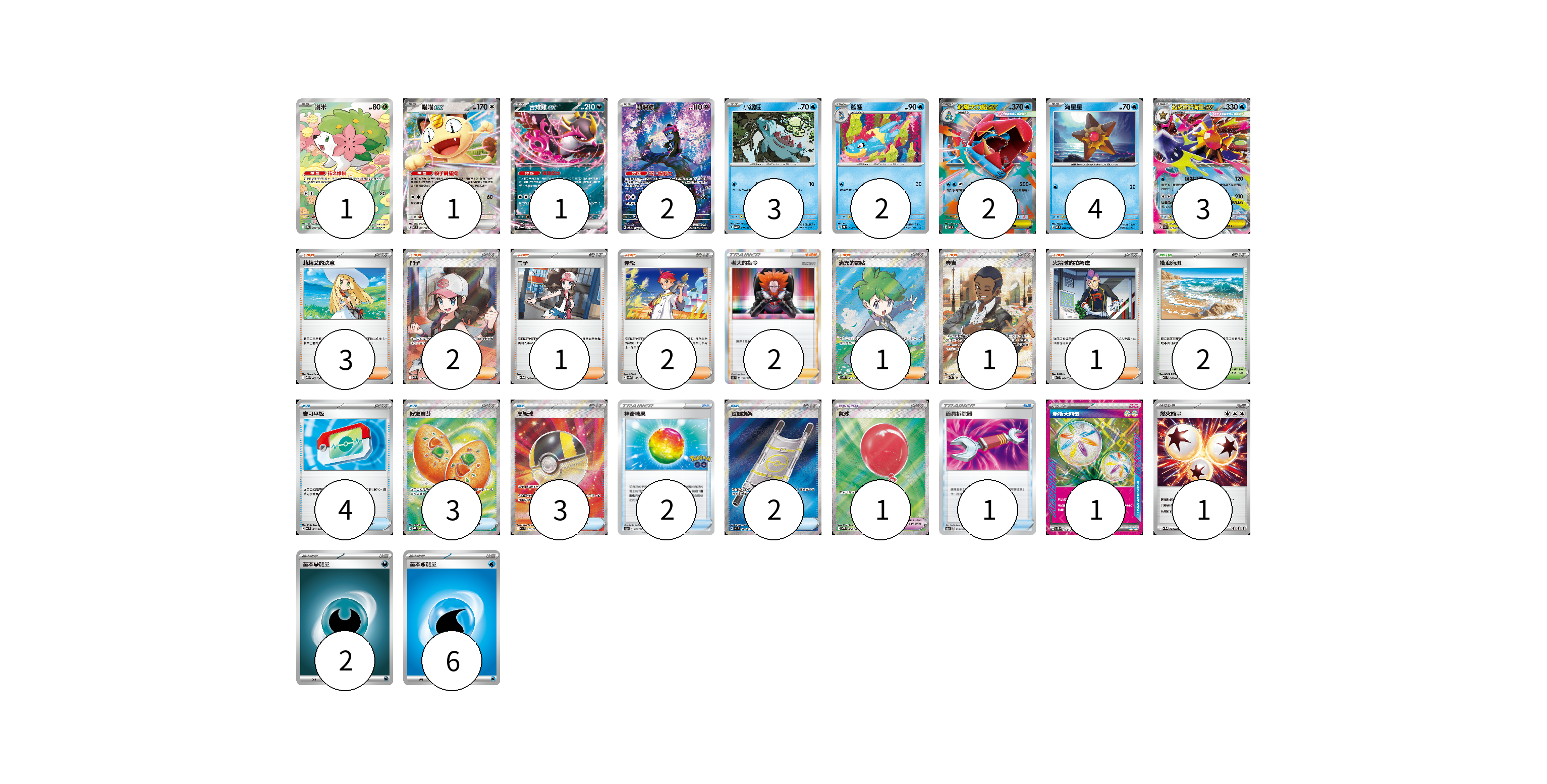 牌組構築方案 以此牌組為基礎新構築牌組 顯示卡面 顯示列表 寶可夢卡(19) 1 1 1 2 3 2 2 4 3 寶可夢道具(1) 1 物品卡(15) 4 3 3 2 2 1 支援者卡(13) 3 2 1 2 2 1 1 1 競技場卡(2) 2 能量卡(10) 1 1 2 6 寶可夢卡(19) 卡牌名稱 張數 卡牌名稱 張數 謝米 SV9a 066/063 01 喵喵ex M3 061/080 01 吉雉雞ex SV6a 038/064 01 願增猿 SV6 107/101 02 小鋸鱷 SV5K 013/071 03 藍鱷 SV5K 014/071 02 超級大力鱷ex MC 169/742 02 海星星 M3 020/080 04 超級寶石海星ex M3 021/080 03 寶可夢道具(1) 卡牌名稱 張數 卡牌名稱 張數 氣球 M1L 084/063 01 物品卡(15) 卡牌名稱 張數 卡牌名稱 張數 寶可平板 MC 662/742 04 好友寶芬 M1S 081/063 03 高級球 M2a 216/193 03 神奇糖果 S10b 066/071 02 夜間擔架 M1L 083/063 02 道具拆除器 S8b 138/184 01 支援者卡(13) 卡牌名稱 張數 卡牌名稱 張數 莉莉艾的決意 M1L 062/063 03 鬥子 SV11W 166/086 02 鬥子 SV11W 085/086 01 赤松 SV8a 163/187 02 老大的指令(弗拉達利) S8b 158/184 02 滿充的體貼 M1S 085/063 01 賽吉 SV5M 091/071 01 火箭隊的拉姆達 SV10 094/098 01 競技場卡(2) 卡牌名稱 張數 卡牌名稱 張數 衝浪海灘 M1S 062/063 02 能量卡(10) 卡牌名稱 張數 卡牌名稱 張數 新衝天能量 SV5K 071/071 01 燃火能量 SV11W 086/086 01 基本惡能量 sv-p DAR 02 基本水能量 sv-p WAT 06 以此牌組為基礎新構築牌組 牌組編碼 OJNkCW-owxPHu-PtTEZA copy 列印牌組單 牌組編碼已複製 分享至SNS