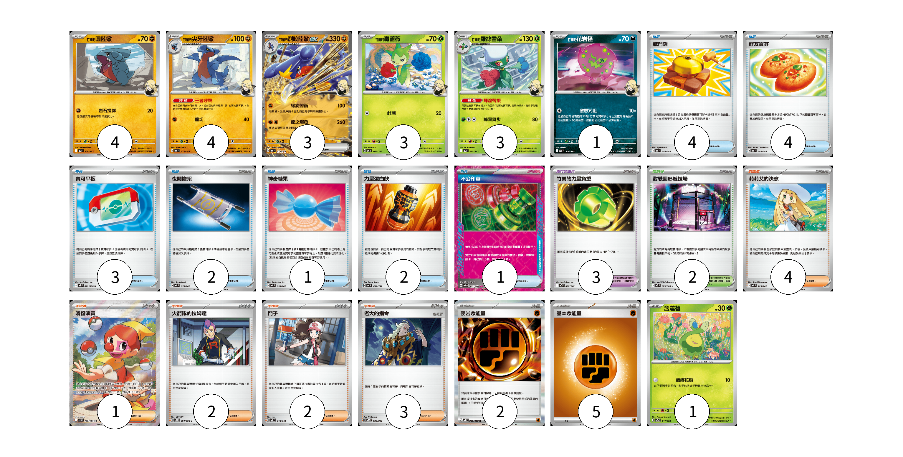 牌組構築方案 以此牌組為基礎新構築牌組 顯示卡面 顯示列表 寶可夢卡(19) 4 4 3 3 3 1 1 寶可夢道具(3) 3 物品卡(17) 4 4 3 2 1 2 1 支援者卡(12) 4 1 2 2 3 競技場卡(2) 2 能量卡(7) 2 5 寶可夢卡(19) 卡牌名稱 張數 卡牌名稱 張數 <竹蘭的>圓陸鯊 MC 376/742 04 <竹蘭的>尖牙陸鯊 MC 377/742 04 <竹蘭的>烈咬陸鯊ex MC 378/742 03 竹蘭的毒薔薇 MC 032/742 03 <竹蘭的>羅絲雷朵 MC 033/742 03 <竹蘭的>花岩怪 M2a 108/193 01 含羞苞 M2a 011/193 01 寶可夢道具(3) 卡牌名稱 張數 卡牌名稱 張數 竹蘭的力量負重 MC 682/742 03 物品卡(17) 卡牌名稱 張數 卡牌名稱 張數 戰鬥鑼 MC 654/742 04 好友寶芬 MC 648/742 04 寶可平板 M3 070/080 03 夜間擔架 MC 670/742 02 神奇糖果 MC 655/742 01 力量蛋白飲 MC 652/742 02 不公印章 SV5a 053/066 01 支援者卡(12) 卡牌名稱 張數 卡牌名稱 張數 莉莉艾的決意 MC 729/742 04 滑稽演員 SV11W 165/086 01 火箭隊的拉姆達 SV10 094/098 02 鬥子 MC 718/742 02 老大的指令 MBD 020/022 03 競技場卡(2) 卡牌名稱 張數 卡牌名稱 張數 對戰圓形競技場 M2 079/080 02 能量卡(7) 卡牌名稱 張數 卡牌名稱 張數 硬岩【鬥】能量 M3 080/080 02 基本【鬥】能量 MC FIG 05 以此牌組為基礎新構築牌組 牌組編碼 OKIqKq-fgjcYV-NXZHfb copy 列印牌組單 牌組編碼已複製 分享至SNS