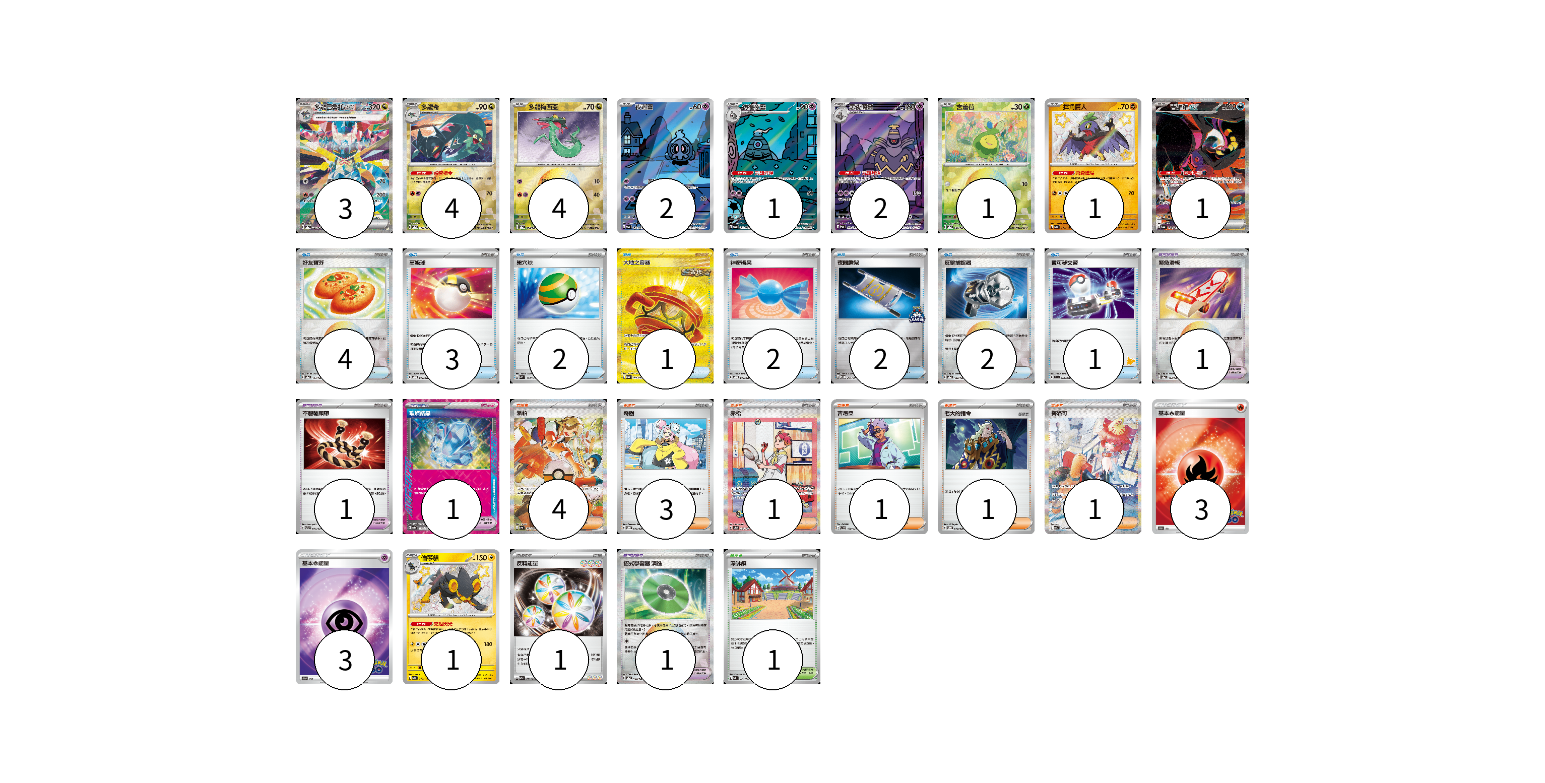 牌組構築方案 以此牌組為基礎新構築牌組 顯示卡面 顯示列表 寶可夢卡(20) 3 4 4 2 1 2 1 1 1 1 寶可夢道具(4) 1 1 1 1 物品卡(17) 4 3 2 1 2 2 2 1 支援者卡(11) 4 3 1 1 1 1 競技場卡(1) 1 能量卡(7) 3 3 1 寶可夢卡(20) 卡牌名稱 張數 卡牌名稱 張數 多龍巴魯托ex SV8a 221/187 03 多龍奇 SV8a 119/187 04 多龍梅西亞 SV8a 118/187 04 夜巡靈 SV6a 068/064 02 彷徨夜靈 SV6a 069/064 01 黑夜魔靈 SV6a 070/064 02 含羞苞 SV8a 001/187 01 摔角鷹人 SV4a 282/190 01 吉雉雞ex SV6a 089/064 01 倫琴貓 SV4a 242/190 01 寶可夢道具(4) 卡牌名稱 張數 卡牌名稱 張數 緊急滑板 SV8a 153/187 01 不服輸頭帶 SVTL 016/021 01 璀璨結晶 SV8a 152/187 01 招式學習器 演進 SV8a 160/187 01 物品卡(17) 卡牌名稱 張數 卡牌名稱 張數 好友寶芬 SV8a 147/187 04 高級球 SVOD 012/020 03 巢穴球 SVM 133/175 02 大地之容器 SV6a 093/064 01 神奇糖果 SVOD 013/020 02 夜間擔架 SV-P 204/SV-P 02 反擊捕捉器 SV8a 139/187 02 寶可夢交替 SVI 054/066 01 支援者卡(11) 卡牌名稱 張數 卡牌名稱 張數 派帕 SV4a 353/190 04 奇樹 SVOD 016/020 03 赤松 SV8a 227/187 01 吉尼亞 SVD 129/139 01 老大的指令 SVOD 019/020 01 梅洛可 SV4K 092/066 01 競技場卡(1) 卡牌名稱 張數 卡牌名稱 張數 深缽鎮 SVK 039/042 01 能量卡(7) 卡牌名稱 張數 卡牌名稱 張數 基本火能量 S10b FIR 03 基本超能量 S10b PSY 03 反轉能量 SVK 041/042 01 以此牌組為基礎新構築牌組 牌組編碼 OKSQCE-BcObkf-VxctXR copy 列印牌組單 牌組編碼已複製 分享至SNS
