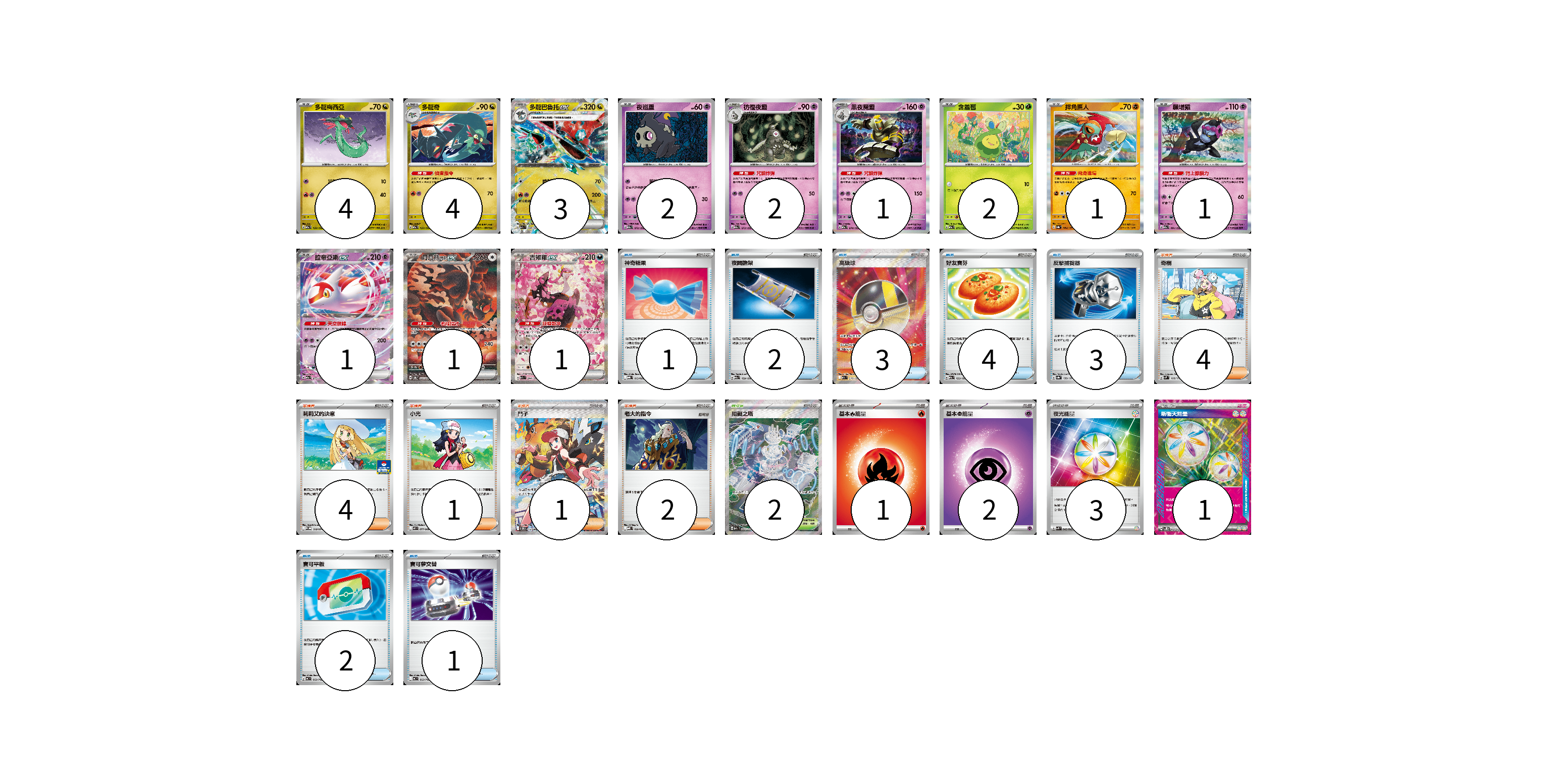 牌組構築方案 以此牌組為基礎新構築牌組 顯示卡面 顯示列表 寶可夢卡(23) 4 4 3 2 2 1 2 1 1 1 1 1 物品卡(16) 1 2 3 4 3 2 1 支援者卡(12) 4 4 1 1 2 競技場卡(2) 2 能量卡(7) 1 2 3 1 寶可夢卡(23) 卡牌名稱 張數 卡牌名稱 張數 多龍梅西亞 M2a 132/193 04 多龍奇 M2a 133/193 04 多龍巴魯托ex M2a 134/193 03 夜巡靈 M2a 072/193 02 彷徨夜靈 M2a 073/193 02 黑夜魔靈 M2a 074/193 01 含羞苞 M2a 011/193 02 摔角鷹人 SV8a 084/187 01 願增猿 M2a 081/193 01 拉帝亞斯ex M2a 075/193 01 月月熊 赫月ex SV8a 225/187 01 吉雉雞ex M2a 244/193 01 物品卡(16) 卡牌名稱 張數 卡牌名稱 張數 神奇糖果 MBG 013/022 01 夜間擔架 M2a 159/193 02 高級球 M2a 216/193 03 好友寶芬 M2a 153/193 04 反擊捕捉器 SV8a 139/187 03 寶可平板 MC 662/742 02 寶可夢交替 MC 663/742 01 支援者卡(12) 卡牌名稱 張數 卡牌名稱 張數 奇樹 SVM 160/175 04 莉莉艾的決意 M-P 018/M-P 04 小光 M2 077/080 01 鬥子 SV11W 173/086 01 老大的指令 MBD 020/022 02 競技場卡(2) 卡牌名稱 張數 卡牌名稱 張數 阻礙之塔 M2a 222/193 02 能量卡(7) 卡牌名稱 張數 卡牌名稱 張數 基本【火】能量 M-P FIR 01 基本【超】能量 MBD PSY 02 夜光能量 SVK 042/042 03 新衝天能量 SV5K 071/071 01 以此牌組為基礎新構築牌組 牌組編碼 OKaLvX-lGtPAd-COfWbA copy 列印牌組單 牌組編碼已複製 分享至SNS