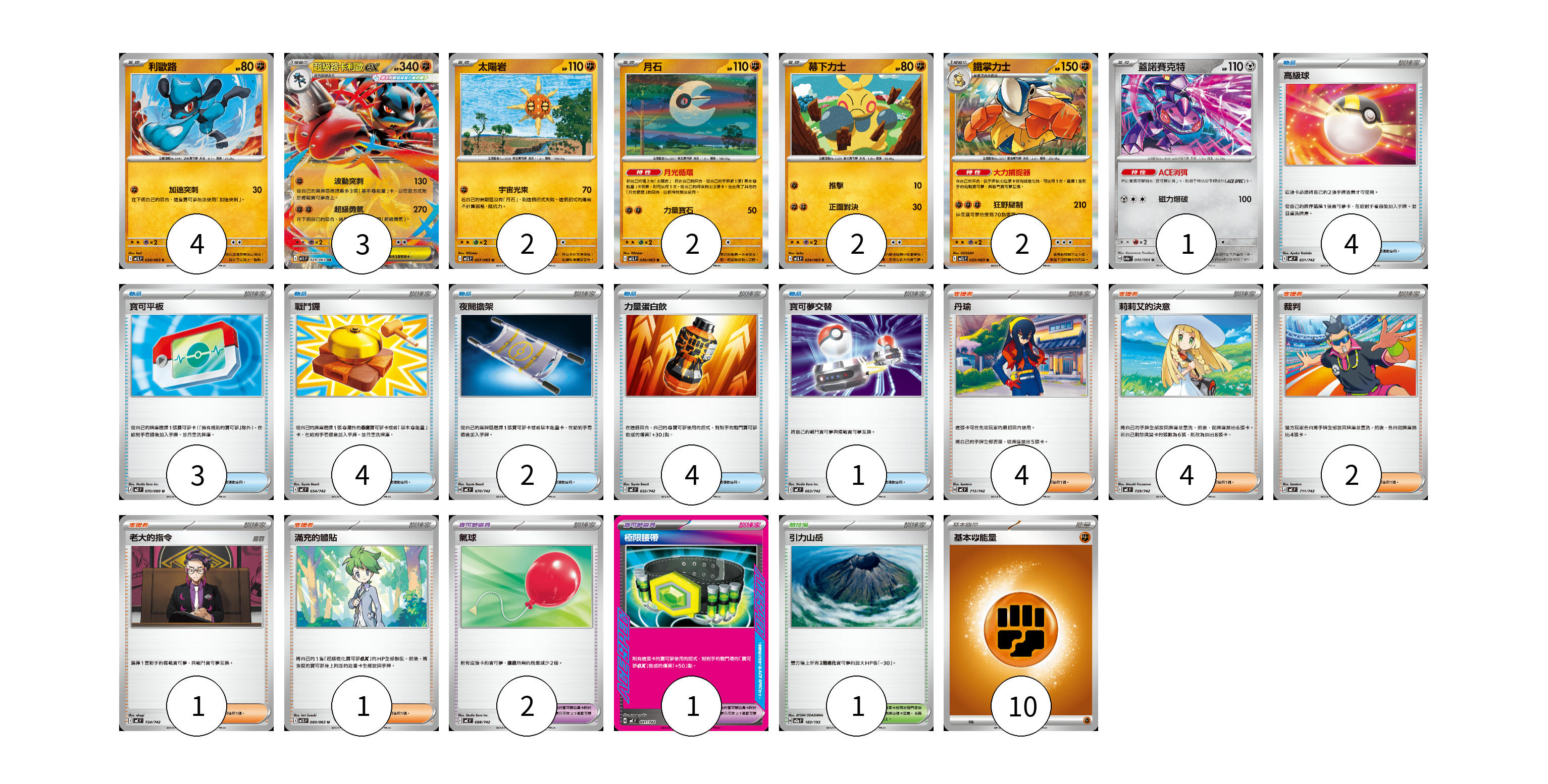 牌組構築方案 以此牌組為基礎新構築牌組 顯示卡面 顯示列表 寶可夢卡(16) 4 3 2 2 2 2 1 寶可夢道具(3) 2 1 物品卡(18) 4 3 4 2 4 1 支援者卡(12) 4 4 2 1 1 競技場卡(1) 1 能量卡(10) 10 寶可夢卡(16) 卡牌名稱 張數 卡牌名稱 張數 利歐路 M1L 028/063 04 超級路卡利歐ex M1L 029/063 03 太陽岩 M1L 027/063 02 月石 M1L 026/063 02 幕下力士 M1L 024/063 02 鐵掌力士 M1L 025/063 02 蓋諾賽克特 SV6a 040/064 01 寶可夢道具(3) 卡牌名稱 張數 卡牌名稱 張數 氣球 MC 688/742 02 極限腰帶 MC 691/742 01 物品卡(18) 卡牌名稱 張數 卡牌名稱 張數 高級球 MC 651/742 04 寶可平板 M3 070/080 03 戰鬥鑼 MC 654/742 04 夜間擔架 MC 670/742 02 力量蛋白飲 MC 652/742 04 寶可夢交替 MC 663/742 01 支援者卡(12) 卡牌名稱 張數 卡牌名稱 張數 丹瑜 MC 715/742 04 莉莉艾的決意 MC 729/742 04 裁判 MC 711/742 02 老大的指令 MC 724/742 01 滿充的體貼 M1S 060/063 01 競技場卡(1) 卡牌名稱 張數 卡牌名稱 張數 引力山岳 M2a 183/193 01 能量卡(10) 卡牌名稱 張數 卡牌名稱 張數 基本【鬥】能量 MC FIG 10 以此牌組為基礎新構築牌組 牌組編碼 OLFpXi-KocFVt-xHvoxZ copy 列印牌組單 牌組編碼已複製 分享至SNS