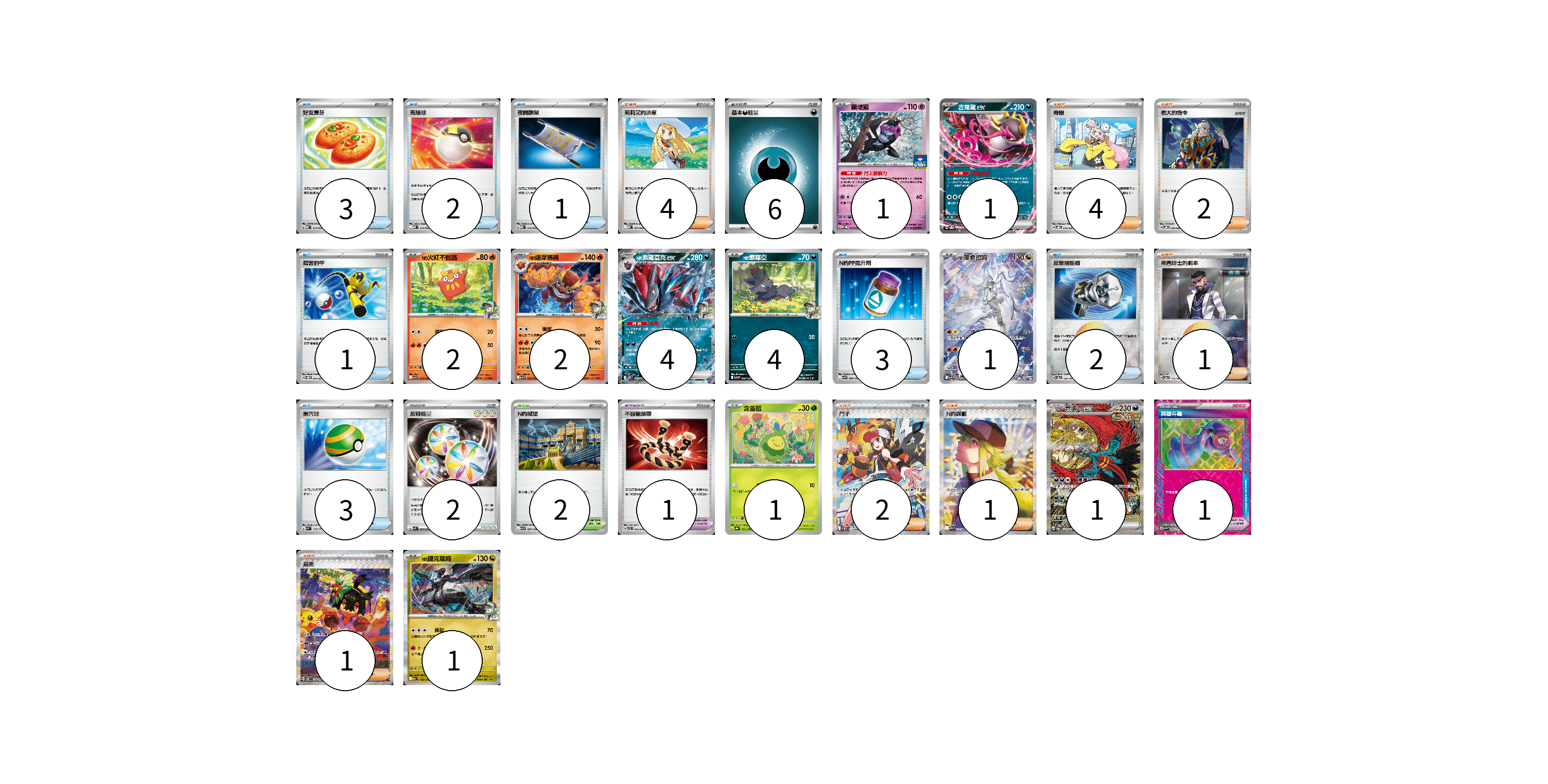牌組構築方案 以此牌組為基礎新構築牌組 顯示卡面 顯示列表 寶可夢卡(18) 1 1 2 2 4 4 1 1 1 1 寶可夢道具(2) 1 1 物品卡(15) 3 2 1 1 3 2 3 支援者卡(15) 4 4 2 1 2 1 1 競技場卡(2) 2 能量卡(8) 6 2 寶可夢卡(18) 卡牌名稱 張數 卡牌名稱 張數 願增猿 M-P 014/M-P 01 吉雉雞ex SVOD 004/020 01 N的火紅不倒翁 SV9 015/100 02 N的達摩狒狒 SV9 016/100 02 N的索羅亞克ex SV9 061/100 04 N的索羅亞 SV9 060/100 04 N的萊希拉姆 SV9 109/100 01 含羞苞 SV8a 001/187 01 轟鳴月ex SV8a 218/187 01 N的捷克羅姆 M2a 129/193 01 寶可夢道具(2) 卡牌名稱 張數 卡牌名稱 張數 不服輸頭帶 SVTL 016/021 01 英雄斗篷 SV5M 064/071 01 物品卡(15) 卡牌名稱 張數 卡牌名稱 張數 好友寶芬 MBD 013/022 03 高級球 MBD 014/022 02 夜間擔架 MBD 016/022 01 厲害釣竿 SVOM 011/021 01 N的PP提升劑 SV9 089/100 03 反擊捕捉器 SV8a 139/187 02 巢穴球 SVM 133/175 03 支援者卡(15) 卡牌名稱 張數 卡牌名稱 張數 莉莉艾的決意 MBD 021/022 04 奇樹 SVOD 016/020 04 老大的指令 SVOD 019/020 02 弗圖博士的劇本 SV8a 175/187 01 鬥子 SV11W 173/086 02 N的謀劃 SV11B 173/086 01 烏栗 SV6 129/101 01 競技場卡(2) 卡牌名稱 張數 卡牌名稱 張數 N的城堡 SV9 097/100 02 能量卡(8) 卡牌名稱 張數 卡牌名稱 張數 基本【惡】能量 MBG DAR 06 反轉能量 SVK 041/042 02 以此牌組為基礎新構築牌組 牌組編碼 OLORyJ-wEKycD-ftPKUi copy 列印牌組單 牌組編碼已複製 分享至SNS