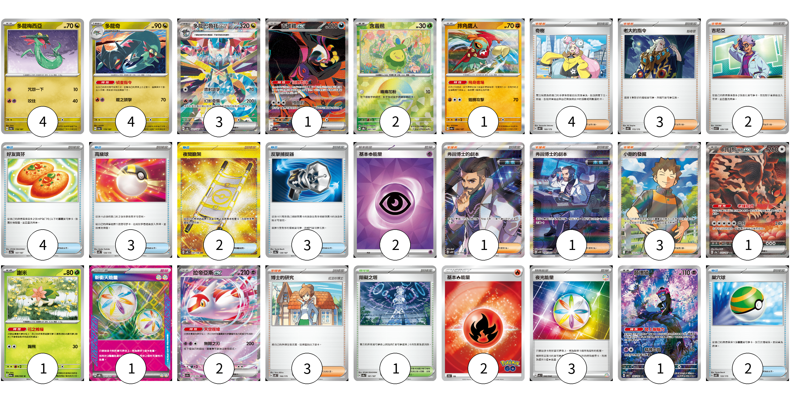 牌組構築方案 以此牌組為基礎新構築牌組 顯示卡面 顯示列表 寶可夢卡(20) 4 4 3 1 2 1 1 1 2 1 物品卡(14) 4 3 2 3 2 支援者卡(17) 4 3 2 1 1 3 3 競技場卡(1) 1 能量卡(8) 2 1 2 3 寶可夢卡(20) 卡牌名稱 張數 卡牌名稱 張數 多龍梅西亞 SV8a 118/187 04 多龍奇 SV8a 119/187 04 多龍巴魯托ex SV8a 221/187 03 吉雉雞ex SV6a 089/064 01 含羞苞 SV8a 001/187 02 摔角鷹人 SV8a 084/187 01 月月熊 赫月ex SV8a 225/187 01 謝米 SV9a 006/063 01 拉帝亞斯ex SV7a 019/064 02 願增猿 SV6 107/101 01 物品卡(14) 卡牌名稱 張數 卡牌名稱 張數 好友寶芬 SV8a 147/187 04 高級球 SVM 134/175 03 夜間擔架 SV8 137/106 02 反擊捕捉器 SV8a 139/187 03 巢穴球 SVM 133/175 02 支援者卡(17) 卡牌名稱 張數 卡牌名稱 張數 奇樹 SVM 160/175 04 老大的指令 SVM 172/175 03 吉尼亞 SVD 129/139 02 弗圖博士的劇本 SV4M 086/066 01 弗圖博士的劇本 SV4M 091/066 01 小剛的發掘 SV9 123/100 03 博士的研究 SVM 166/175 03 競技場卡(1) 卡牌名稱 張數 卡牌名稱 張數 阻礙之塔 SV8a 181/187 01 能量卡(8) 卡牌名稱 張數 卡牌名稱 張數 基本【超】能量 SVK PSY 02 新衝天能量 SV5K 071/071 01 基本火能量 S10b FIR 02 夜光能量 SVK 042/042 03 以此牌組為基礎新構築牌組 牌組編碼 OPCrpn-AgdtnX-acTaNY copy 列印牌組單 牌組編碼已複製 分享至SNS