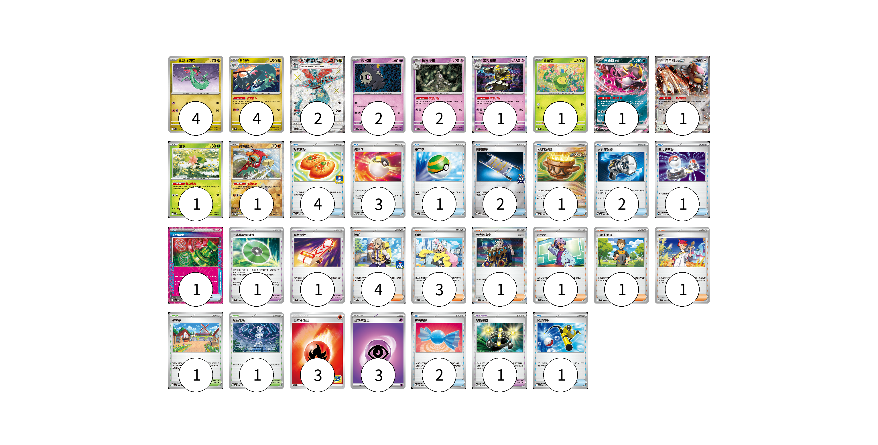 牌組構築方案 以此牌組為基礎新構築牌組 顯示卡面 顯示列表 寶可夢卡(20) 4 4 2 2 2 1 1 1 1 1 1 寶可夢道具(3) 1 1 1 物品卡(18) 4 3 1 2 1 2 1 1 2 1 支援者卡(11) 4 3 1 1 1 1 競技場卡(2) 1 1 能量卡(6) 3 3 寶可夢卡(20) 卡牌名稱 張數 卡牌名稱 張數 多龍梅西亞 SV8a 118/187 04 多龍奇 SV8a 119/187 04 多龍巴魯托ex SV6 120/101 02 夜巡靈 SV8a 064/187 02 彷徨夜靈 SV8a 065/187 02 黑夜魔靈 SV8a 066/187 01 含羞苞 SV8a 001/187 01 吉雉雞ex SV8a 104/187 01 月月熊 赫月ex SV8a 134/187 01 謝米 SV9a 006/063 01 摔角鷹人 SV8a 084/187 01 寶可夢道具(3) 卡牌名稱 張數 卡牌名稱 張數 招式學習器 演進 SV8a 160/187 01 緊急滑板 SV8a 153/187 01 學習裝置 SVTM 016/022 01 物品卡(18) 卡牌名稱 張數 卡牌名稱 張數 好友寶芬 SV-P 212/SV-P 04 高級球 SVD 119/139 03 巢穴球 SV4a 159/190 01 夜間擔架 SV-P 204/SV-P 02 大地之容器 SV8a 143/187 01 反擊捕捉器 SV8a 139/187 02 寶可夢交替 SVOD 014/020 01 不公印章 SV5a 053/066 01 神奇糖果 SVOM 014/021 02 厲害釣竿 SVK 011/042 01 支援者卡(11) 卡牌名稱 張數 卡牌名稱 張數 派帕 SV-P 213/SV-P 04 奇樹 SVTS 018/022 03 老大的指令 SV4a 181/190 01 吉尼亞 SV1S 074/078 01 小剛的發掘 SV9 096/100 01 赤松 SV8a 163/187 01 競技場卡(2) 卡牌名稱 張數 卡牌名稱 張數 深缽鎮 SV4a 185/190 01 阻礙之塔 SV8a 181/187 01 能量卡(6) 卡牌名稱 張數 卡牌名稱 張數 基本火能量 S8a FIR 03 基本超能量 sv-p PSY 03 以此牌組為基礎新構築牌組 牌組編碼 OPNqWw-MuSfrk-TuXLIz copy 列印牌組單 牌組編碼已複製 分享至SNS