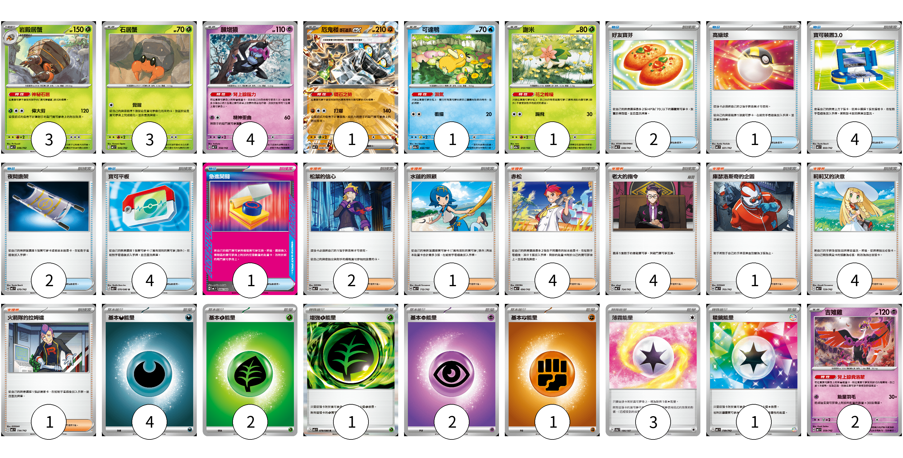 牌組構築方案 以此牌組為基礎新構築牌組 顯示卡面 顯示列表 寶可夢卡(15) 3 3 4 1 1 1 2 物品卡(14) 2 1 4 2 4 1 支援者卡(17) 2 1 4 4 1 4 1 能量卡(14) 4 2 1 2 1 3 1 寶可夢卡(15) 卡牌名稱 張數 卡牌名稱 張數 岩殿居蟹 MC 046/742 03 石居蟹 MC 045/742 03 願增猿 MC 358/742 04 厄鬼椪 礎石面具ex MC 428/742 01 可達鴨 M2a 032/193 01 謝米 M2a 012/193 01 吉雉雞 MC 359/742 02 物品卡(14) 卡牌名稱 張數 卡牌名稱 張數 好友寶芬 MC 648/742 02 高級球 MC 651/742 01 寶可裝置3.0 MC 660/742 04 夜間擔架 MC 670/742 02 寶可平板 M3 070/080 04 急進開關 MC 646/742 01 支援者卡(17) 卡牌名稱 張數 卡牌名稱 張數 松葉的信心 MC 727/742 02 水蓮的照顧 MC 712/742 01 赤松 MC 696/742 04 老大的指令 MC 724/742 04 庫瑟洛斯奇的企圖 MC 705/742 01 莉莉艾的決意 MC 729/742 04 火箭隊的拉姆達 MC 734/742 01 能量卡(14) 卡牌名稱 張數 卡牌名稱 張數 基本【惡】能量 MC DAR 04 基本【草】能量 MJ GRA 02 增強【草】能量 M3 078/080 01 基本【超】能量 MC PSY 02 基本【鬥】能量 MC FIG 01 薄霧能量 SV8a 186/187 03 稜鏡能量 MC 739/742 01 以此牌組為基礎新構築牌組 牌組編碼 OQKkSk-jmdXTn-HyqBbf copy 列印牌組單 牌組編碼已複製 分享至SNS