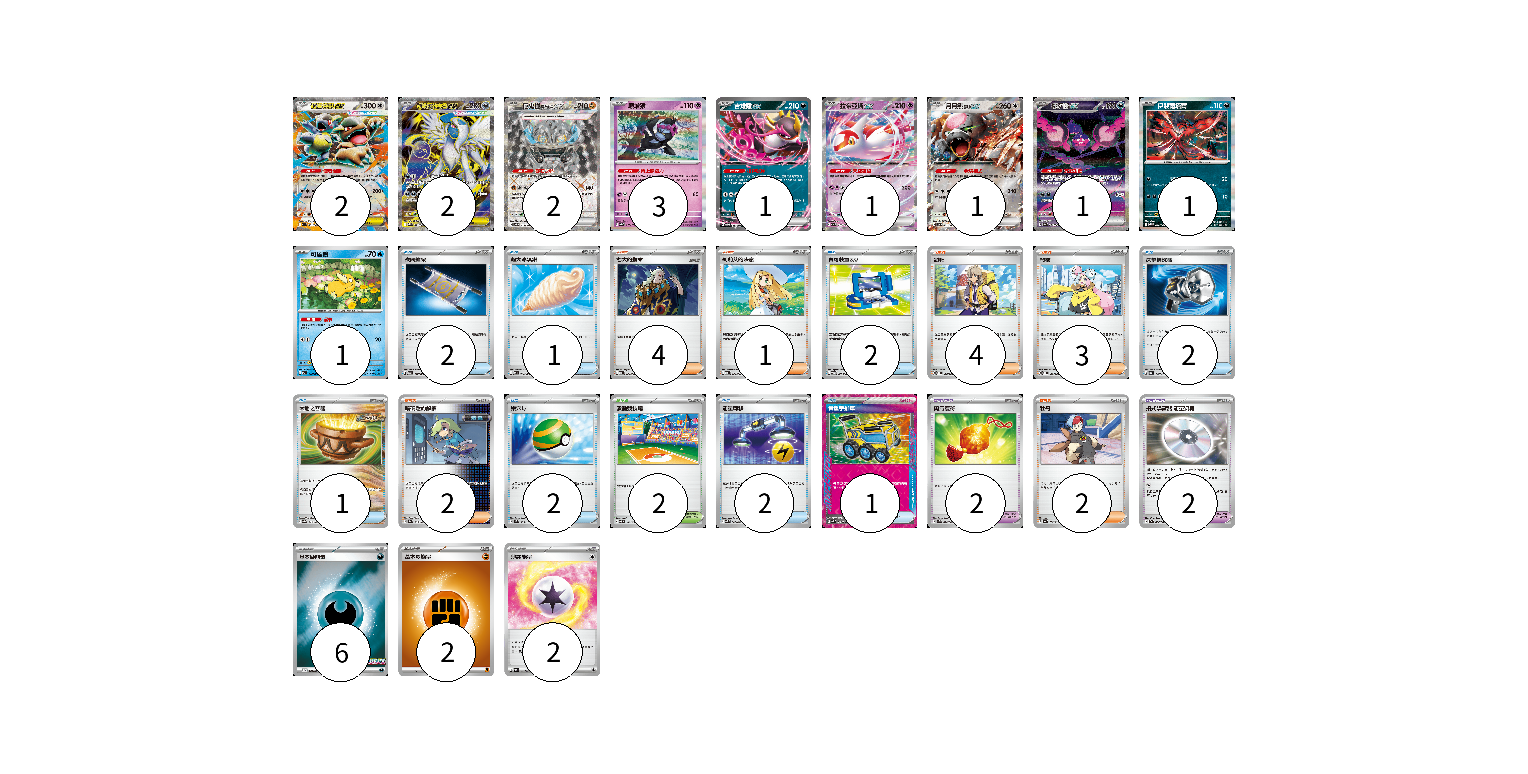 牌組構築方案 以此牌組為基礎新構築牌組 顯示卡面 顯示列表 寶可夢卡(15) 2 2 2 3 1 1 1 1 1 1 寶可夢道具(4) 2 2 物品卡(13) 2 1 2 2 1 2 2 1 支援者卡(16) 4 1 4 3 2 2 競技場卡(2) 2 能量卡(10) 6 2 2 寶可夢卡(15) 卡牌名稱 張數 卡牌名稱 張數 超級袋獸ex M1S 051/063 02 超級阿勃梭魯ex M1L 079/063 02 厄鬼椪 礎石面具ex SV6 119/101 02 願增猿 SV8a 075/187 03 吉雉雞ex SVOD 004/020 01 拉帝亞斯ex M2a 075/193 01 月月熊 赫月 ex SV5a 052/066 01 桃歹郎ex SV6a 090/064 01 伊裴爾塔爾 M1L 040/063 01 可達鴨 M2a 032/193 01 寶可夢道具(4) 卡牌名稱 張數 卡牌名稱 張數 勇氣護符 SVK 024/042 02 招式學習器 能量渦輪 SV3a 056/062 02 物品卡(13) 卡牌名稱 張數 卡牌名稱 張數 夜間擔架 M2a 159/193 02 超大冰淇淋 M2 073/080 01 寶可裝置3.0 SV11B 081/086 02 反擊捕捉器 SV8a 139/187 02 大地之容器 SV8a 143/187 01 巢穴球 SVM 133/175 02 能量轉移 SVK 008/042 02 貴重手推車 SVK 020/042 01 支援者卡(16) 卡牌名稱 張數 卡牌名稱 張數 老大的指令 MBD 020/022 04 莉莉艾的決意 MBG 022/022 01 派帕 SVOD 018/020 04 奇樹 SVOD 016/020 03 暗碼迷的解讀 SV8a 165/187 02 牡丹 SV4a 182/190 02 競技場卡(2) 卡牌名稱 張數 卡牌名稱 張數 激動競技場 SV8 105/106 02 能量卡(10) 卡牌名稱 張數 卡牌名稱 張數 基本【惡】能量 M-P 034/M-P 06 基本【鬥】能量 M-P FIG 02 薄霧能量 SV5M 071/071 02 以此牌組為基礎新構築牌組 牌組編碼 OQmPDE-djcqhx-YnmwTB copy 列印牌組單 牌組編碼已複製 分享至SNS