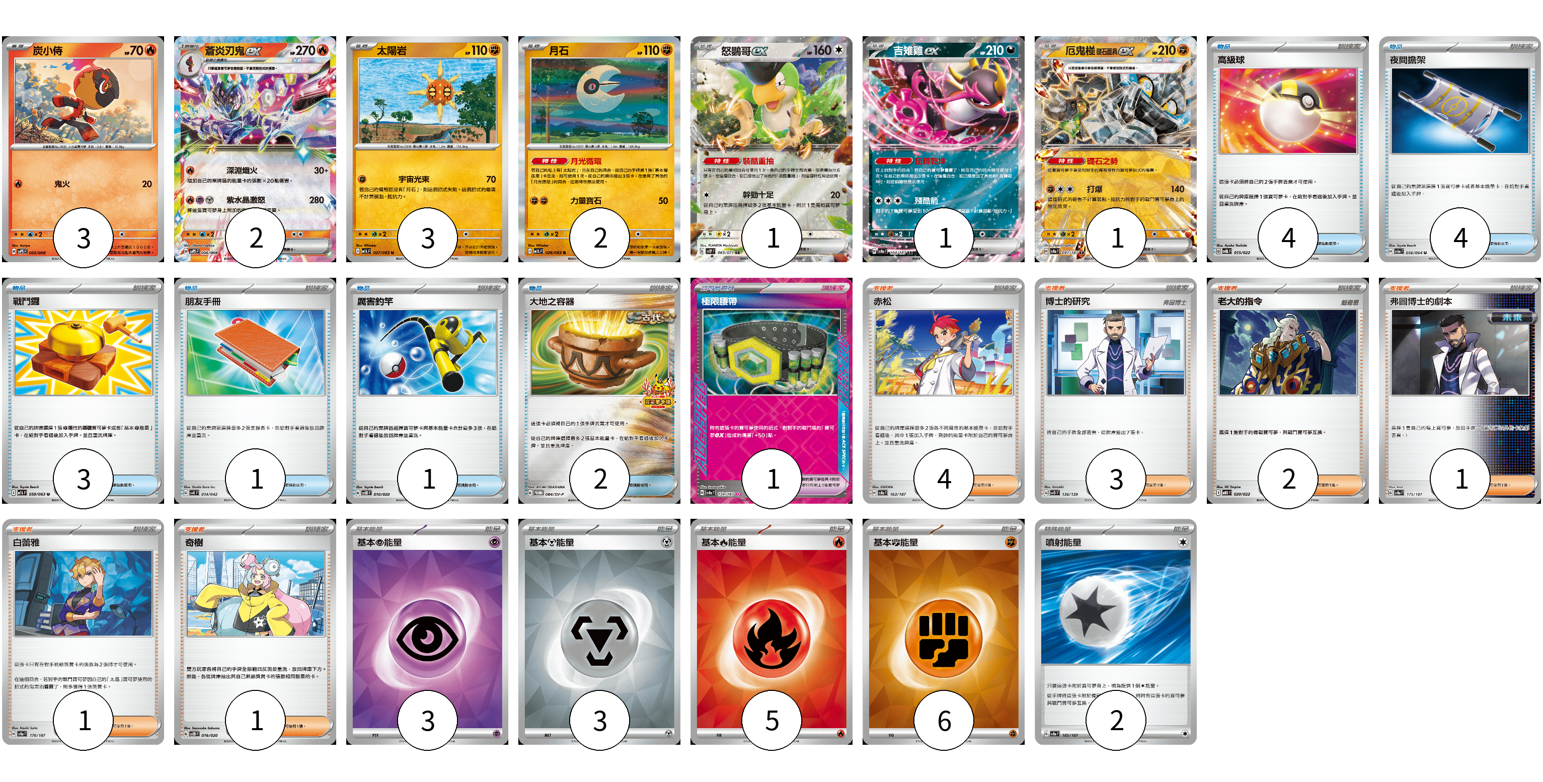 牌組構築方案 以此牌組為基礎新構築牌組 顯示卡面 顯示列表 寶可夢卡(13) 3 2 3 2 1 1 1 寶可夢道具(1) 1 物品卡(15) 4 4 3 1 1 2 支援者卡(12) 4 3 2 1 1 1 能量卡(19) 3 3 5 6 2 寶可夢卡(13) 卡牌名稱 張數 卡牌名稱 張數 炭小侍 SVPS 005/008 03 蒼炎刃鬼ex SVPS 006/008 02 太陽岩 M1L 027/063 03 月石 M1L 026/063 02 怒鸚哥ex SV2P 065/071 01 吉雉雞ex SV8a 104/187 01 厄鬼椪 礎石面具ex SV8a 091/187 01 寶可夢道具(1) 卡牌名稱 張數 卡牌名稱 張數 極限腰帶 SV8a 159/187 01 物品卡(15) 卡牌名稱 張數 卡牌名稱 張數 高級球 SVQL 015/022 04 夜間擔架 SV6a 056/064 04 戰鬥鑼 M1L 059/063 03 朋友手冊 SVK 014/042 01 厲害釣竿 SVOD 010/020 01 大地之容器 SV-P 084/SV-P 02 支援者卡(12) 卡牌名稱 張數 卡牌名稱 張數 赤松 SV8a 163/187 04 博士的研究(弗圖博士) SVD 136/139 03 老大的指令 MBD 020/022 02 弗圖博士的劇本 SV8a 175/187 01 白蕾雅 SV8a 176/187 01 奇樹 SVOD 016/020 01 能量卡(19) 卡牌名稱 張數 卡牌名稱 張數 基本【超】能量 SVK PSY 03 基本【鋼】能量 SVOD MET 03 基本【火】能量 SVM FIR 05 基本【鬥】能量 SVM FIG 06 噴射能量 SV8a 185/187 02 以此牌組為基礎新構築牌組 牌組編碼 OSwxuE-RkIEnH-RvcRIq copy 列印牌組單 牌組編碼已複製 分享至SNS