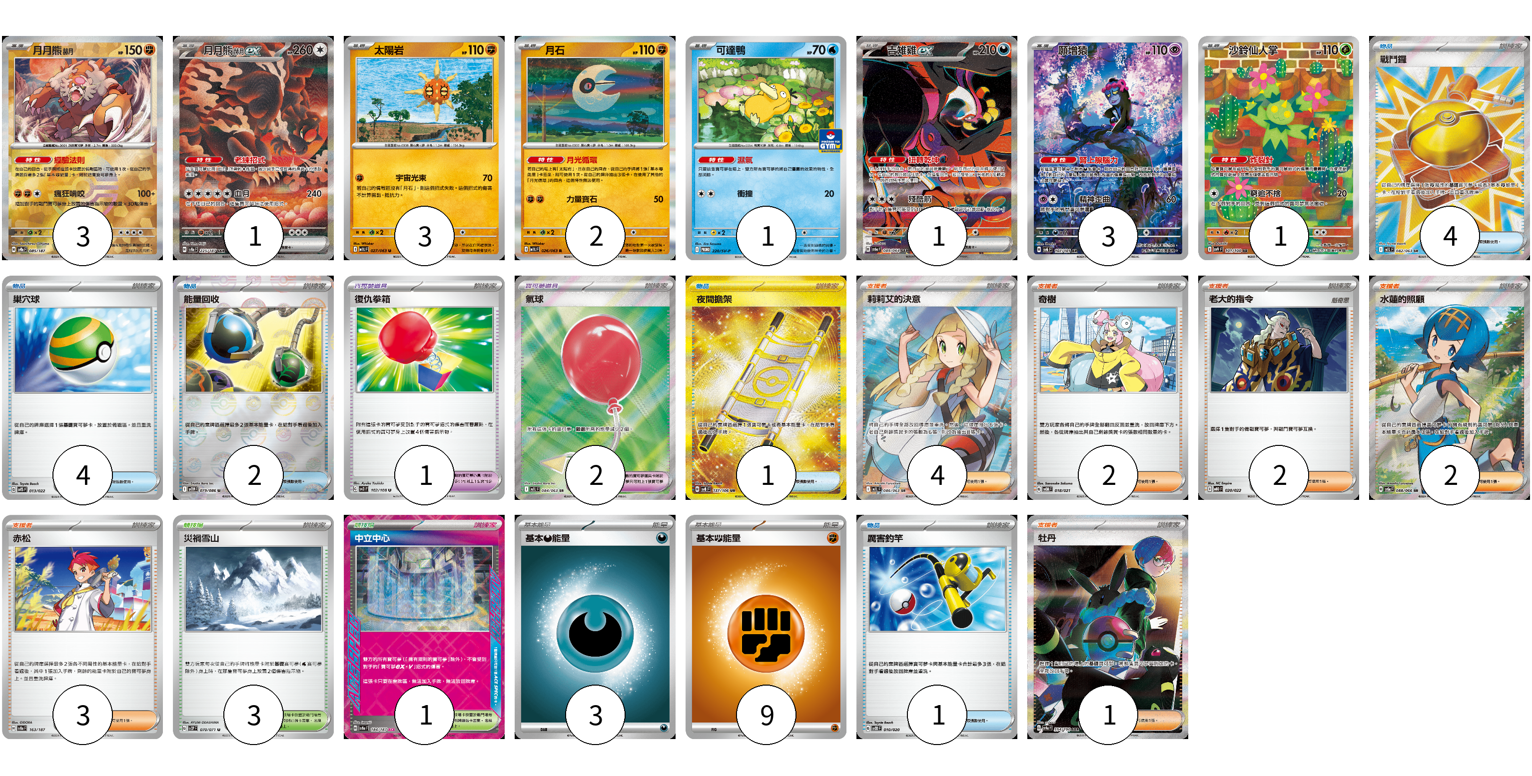 牌組構築方案 以此牌組為基礎新構築牌組 顯示卡面 顯示列表 寶可夢卡(15) 3 1 3 2 1 1 3 1 寶可夢道具(3) 1 2 物品卡(12) 4 4 2 1 1 支援者卡(14) 4 2 2 2 3 1 競技場卡(4) 3 1 能量卡(12) 3 9 寶可夢卡(15) 卡牌名稱 張數 卡牌名稱 張數 月月熊 赫月 SV8a 085/187 03 月月熊 赫月ex SV8a 225/187 01 太陽岩 M1L 027/063 03 月石 M1L 026/063 02 可達鴨 SV-P 220/SV-P 01 吉雉雞ex SV6a 089/064 01 願增猿 SV6 107/101 03 沙鈴仙人掌 SV9 101/100 01 寶可夢道具(3) 卡牌名稱 張數 卡牌名稱 張數 復仇拳箱 SV3 102/108 01 氣球 M1L 084/063 02 物品卡(12) 卡牌名稱 張數 卡牌名稱 張數 戰鬥鑼 M1L 082/063 04 巢穴球 SVTS 013/022 04 能量回收 SV11W 079/086 02 夜間擔架 SV8 137/106 01 厲害釣竿 SVOD 010/020 01 支援者卡(14) 卡牌名稱 張數 卡牌名稱 張數 莉莉艾的決意 M1L 086/063 04 奇樹 SVOM 018/021 02 老大的指令 MBD 020/022 02 水蓮的照顧 SV5a 088/066 02 赤松 SV8a 163/187 03 牡丹 SV4a 354/190 01 競技場卡(4) 卡牌名稱 張數 卡牌名稱 張數 災禍雪山 SV2P 070/071 03 中立中心 SV8a 184/187 01 能量卡(12) 卡牌名稱 張數 卡牌名稱 張數 基本【惡】能量 MBG DAR 03 基本【鬥】能量 M-P FIG 09 以此牌組為基礎新構築牌組 牌組編碼 OTCTUW-jgmorq-IPBjxZ copy 列印牌組單 牌組編碼已複製 分享至SNS