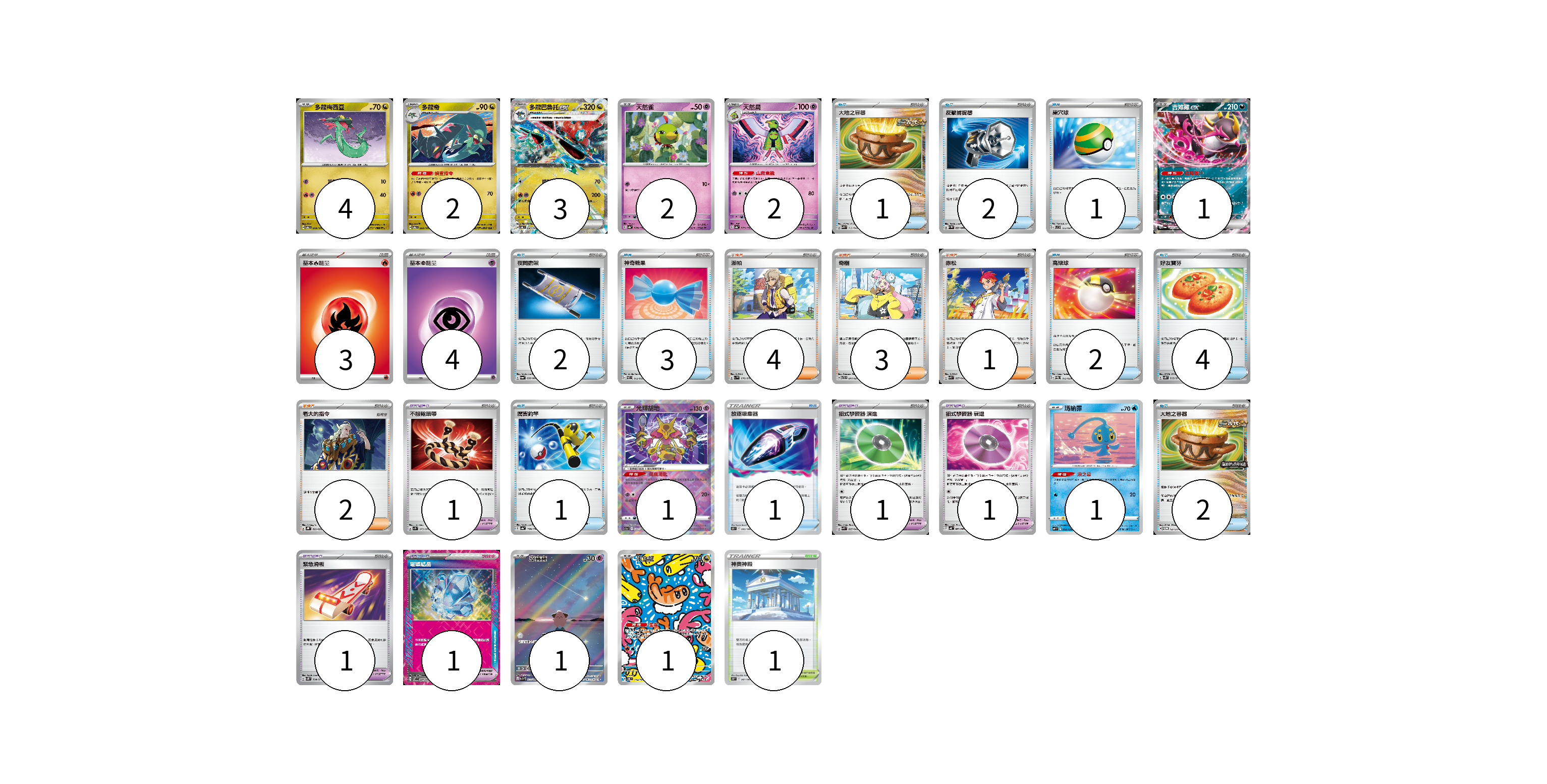 牌組構築方案 以此牌組為基礎新構築牌組 顯示卡面 顯示列表 寶可夢卡(18) 4 2 3 2 2 1 1 1 1 1 寶可夢道具(5) 1 1 1 1 1 物品卡(19) 1 2 1 2 3 2 4 1 1 2 支援者卡(10) 4 3 1 2 競技場卡(1) 1 能量卡(7) 3 4 寶可夢卡(18) 卡牌名稱 張數 卡牌名稱 張數 多龍梅西亞 SV6 079/101 04 多龍奇 SV6 080/101 02 多龍巴魯托ex SV6 081/101 03 天然雀 SV4a 078/190 02 天然鳥 SV4a 079/190 02 吉雉雞ex SV6a 038/064 01 光輝胡地 S11a 031/068 01 瑪納霏 SVF 003/038 01 皮寶寶 SV3 113/108 01 米立龍 SV6 112/101 01 寶可夢道具(5) 卡牌名稱 張數 卡牌名稱 張數 不服輸頭帶 SV1S 073/078 01 招式學習器 演進 SVK 025/042 01 招式學習器 衰退 SV4K 063/066 01 緊急滑板 SV5K 064/071 01 璀璨結晶 SV7 094/102 01 物品卡(19) 卡牌名稱 張數 卡牌名稱 張數 大地之容器 SVK 012/042 01 反擊捕捉器 SV4M 059/066 02 巢穴球 SVC 013/021 01 夜間擔架 SV6a 056/064 02 神奇糖果 SVEL 013/020 03 高級球 SVEM 013/020 02 好友寶芬 SV5K 063/071 04 厲害釣竿 SV4a 158/190 01 放逐吸塵器 S11 093/100 01 大地之容器 SV-P 137/SV-P 02 支援者卡(10) 卡牌名稱 張數 卡牌名稱 張數 派帕 SV1V 076/078 04 奇樹 SVTR 017/021 03 赤松 SVK 027/042 01 老大的指令 SVHK 022/022 02 競技場卡(1) 卡牌名稱 張數 卡牌名稱 張數 神奧神殿 S10P 067/067 01 能量卡(7) 卡牌名稱 張數 卡牌名稱 張數 基本火能量 sv-p FIR 03 基本超能量 sv-p PSY 04 以此牌組為基礎新構築牌組 牌組編碼 OTIgxX-dEYSlS-TIpVxb copy 列印牌組單 牌組編碼已複製 分享至SNS