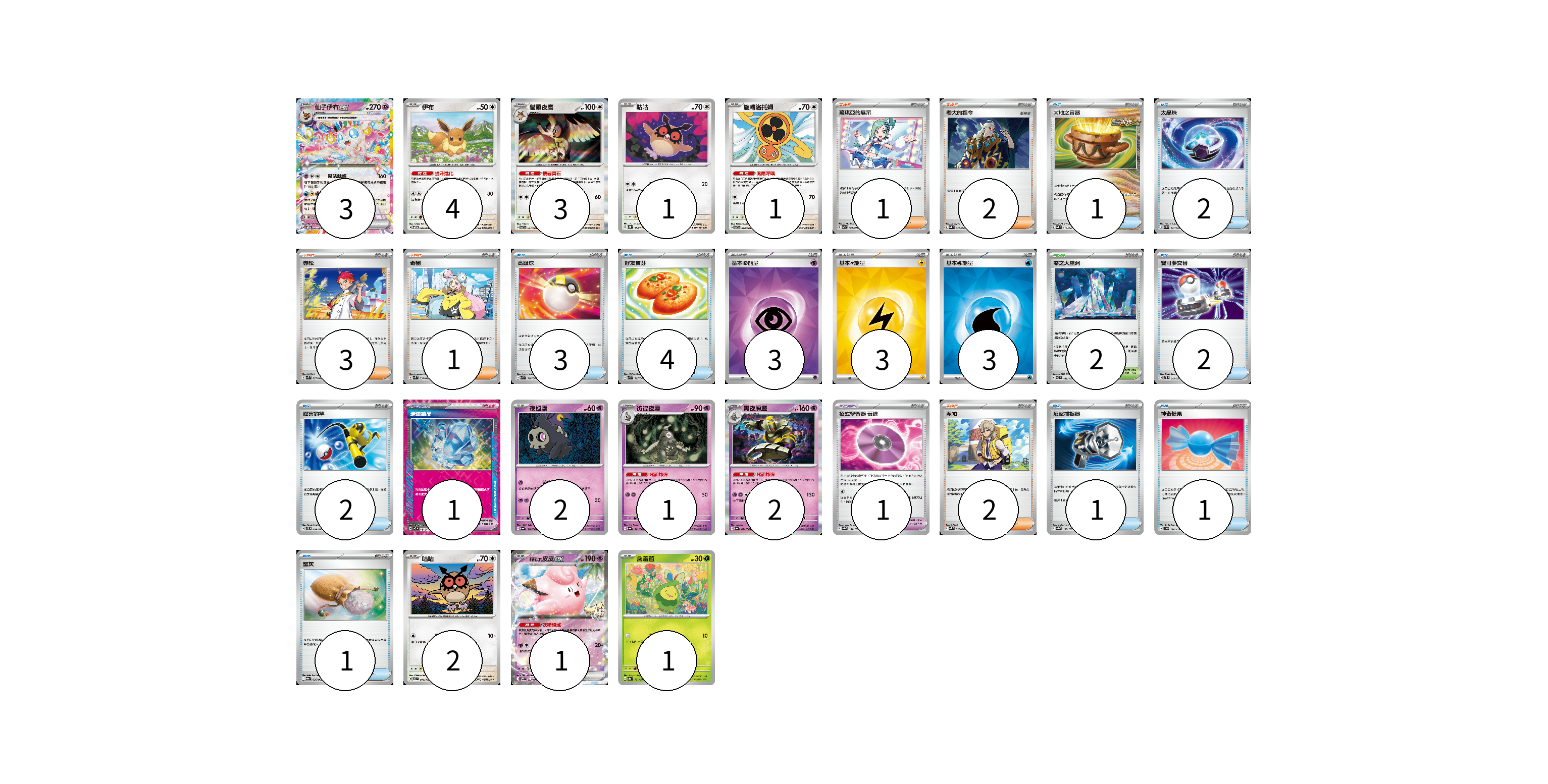 牌組構築方案 以此牌組為基礎新構築牌組 顯示卡面 顯示列表 寶可夢卡(21) 3 4 3 1 1 2 1 2 2 1 1 寶可夢道具(2) 1 1 物品卡(17) 1 2 3 4 2 2 1 1 1 支援者卡(9) 1 2 3 1 2 競技場卡(2) 2 能量卡(9) 3 3 3 寶可夢卡(21) 卡牌名稱 張數 卡牌名稱 張數 仙子伊布ex SVPN 005/008 03 伊布 SVPN 008/008 04 貓頭夜鷹 SV7 077/102 03 咕咕 SV5K 054/071 01 旋轉洛托姆 SV7 080/102 01 夜巡靈 SV6a 018/064 02 彷徨夜靈 SV6a 019/064 01 黑夜魔靈 SV6a 020/064 02 咕咕 SV7 076/102 02 莉莉艾的皮皮ex SV9 033/100 01 含羞苞 SV8a 001/187 01 寶可夢道具(2) 卡牌名稱 張數 卡牌名稱 張數 璀璨結晶 SV7 094/102 01 招式學習器 衰退 SV8a 161/187 01 物品卡(17) 卡牌名稱 張數 卡牌名稱 張數 大地之容器 SVK 012/042 01 太晶珠 SVK 013/042 02 高級球 SVK 018/042 03 好友寶芬 SVK 015/042 04 寶可夢交替 SVTL 015/021 02 厲害釣竿 SVTL 009/021 02 反擊捕捉器 SV8a 139/187 01 神奇糖果 SVD 120/139 01 聖灰 SV9a 056/063 01 支援者卡(9) 卡牌名稱 張數 卡牌名稱 張數 琉琪亞的展示 SV7a 063/064 01 老大的指令 SVK 036/042 02 赤松 SVK 027/042 03 奇樹 SVK 031/042 01 派帕 SVK 035/042 02 競技場卡(2) 卡牌名稱 張數 卡牌名稱 張數 零之大空洞 SV7 102/102 02 能量卡(9) 卡牌名稱 張數 卡牌名稱 張數 基本【超】能量 SVK PSY 03 基本【雷】能量 SVK LIG 03 基本【水】能量 SVK WAT 03 以此牌組為基礎新構築牌組 牌組編碼 OThiwL-KvtOiR-JlgVFh copy 列印牌組單 牌組編碼已複製 分享至SNS