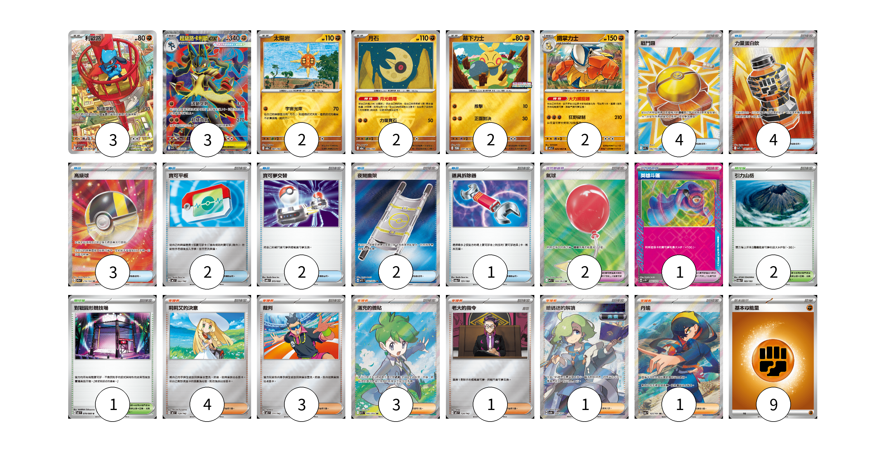 牌組構築方案 以此牌組為基礎新構築牌組 顯示卡面 顯示列表 寶可夢卡(14) 3 3 2 2 2 2 寶可夢道具(3) 2 1 物品卡(18) 4 4 3 2 2 2 1 支援者卡(13) 4 3 3 1 1 1 競技場卡(3) 2 1 能量卡(9) 9 寶可夢卡(14) 卡牌名稱 張數 卡牌名稱 張數 利歐路 M1L 068/063 03 超級路卡利歐ex M1L 078/063 03 太陽岩 M2a 087/193 02 月石 M2a 086/193 02 幕下力士 M-P 007/M-P 02 鐵掌力士 M1L 025/063 02 寶可夢道具(3) 卡牌名稱 張數 卡牌名稱 張數 氣球 M1L 084/063 02 英雄斗篷 SV5M 064/071 01 物品卡(18) 卡牌名稱 張數 卡牌名稱 張數 戰鬥鑼 M1L 082/063 04 力量蛋白飲 M1L 081/063 04 高級球 M2a 216/193 03 寶可平板 MC 662/742 02 寶可夢交替 MBG 015/022 02 夜間擔架 M1L 083/063 02 道具拆除器 M2a 151/193 01 支援者卡(13) 卡牌名稱 張數 卡牌名稱 張數 莉莉艾的決意 MC 729/742 04 裁判 MC 711/742 03 滿充的體貼 M1S 085/063 03 老大的指令 MC 724/742 01 暗碼迷的解讀 SV5M 090/071 01 丹瑜 SV6 123/101 01 競技場卡(3) 卡牌名稱 張數 卡牌名稱 張數 引力山岳 M2a 183/193 02 對戰圓形競技場 M2 079/080 01 能量卡(9) 卡牌名稱 張數 卡牌名稱 張數 基本【鬥】能量 MC FIG 09 以此牌組為基礎新構築牌組 牌組編碼 OYPoBN-miwJos-paQzXK copy 列印牌組單 牌組編碼已複製 分享至SNS