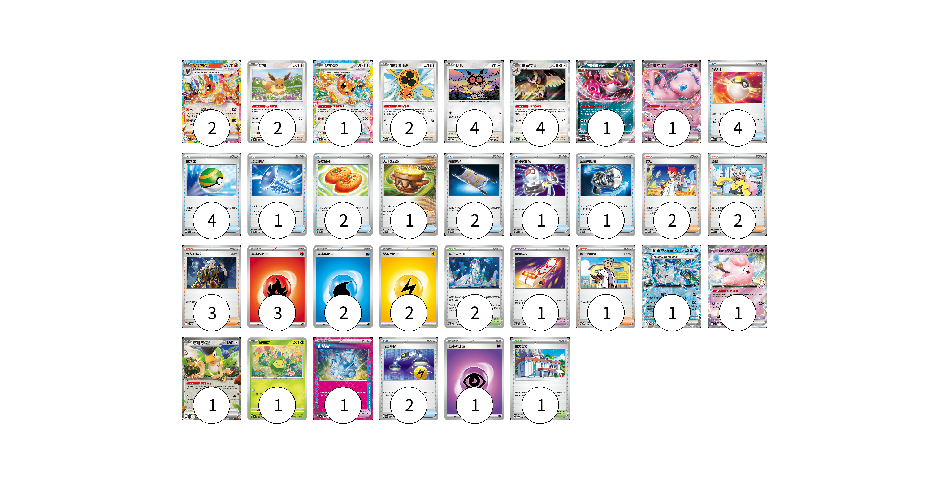 牌組構築方案 以此牌組為基礎新構築牌組 顯示卡面 顯示列表 寶可夢卡(21) 2 2 1 2 4 4 1 1 1 1 1 1 寶可夢道具(2) 1 1 物品卡(18) 4 4 1 2 1 2 1 1 2 支援者卡(8) 2 2 3 1 競技場卡(3) 2 1 能量卡(8) 3 2 2 1 寶可夢卡(21) 卡牌名稱 張數 卡牌名稱 張數 火伊布ex SV8a 022/187 02 伊布 SV8a 125/187 02 伊布ex SV8a 126/187 01 旋轉洛托姆 SV8a 131/187 02 咕咕 SV7 076/102 04 貓頭夜鷹 SV8a 128/187 04 吉雉雞ex SV8a 104/187 01 夢幻ex SVK 001/042 01 厄鬼椪 水井面具ex SV8a 050/187 01 莉莉艾的皮皮ex SV9 033/100 01 怒鸚哥ex SVK 006/042 01 含羞苞 SV8a 001/187 01 寶可夢道具(2) 卡牌名稱 張數 卡牌名稱 張數 緊急滑板 SV8a 153/187 01 璀璨結晶 SV8a 152/187 01 物品卡(18) 卡牌名稱 張數 卡牌名稱 張數 高級球 SVM 134/175 04 巢穴球 SVM 133/175 04 玻璃喇叭 SV8a 140/187 01 好友寶芬 SV8a 147/187 02 大地之容器 SV8a 143/187 01 夜間擔架 SV8a 151/187 02 寶可夢交替 SVM 136/175 01 反擊捕捉器 SV8a 139/187 01 能量轉移 SVM 127/175 02 支援者卡(8) 卡牌名稱 張數 卡牌名稱 張數 赤松 SV8a 163/187 02 奇樹 SVM 160/175 02 老大的指令 SVM 172/175 03 博士的研究 SVM 162/175 01 競技場卡(3) 卡牌名稱 張數 卡牌名稱 張數 零之大空洞 SV8a 182/187 02 居民會館 SV5a 065/066 01 能量卡(8) 卡牌名稱 張數 卡牌名稱 張數 基本火能量 sv-p FIR 03 基本水能量 sv-p WAT 02 基本雷能量 sv-p LIG 02 基本超能量 sv-p PSY 01 以此牌組為基礎新構築牌組 牌組編碼 OdHHUp-YtbEoU-sIsfgi copy 列印牌組單 牌組編碼已複製 分享至SNS