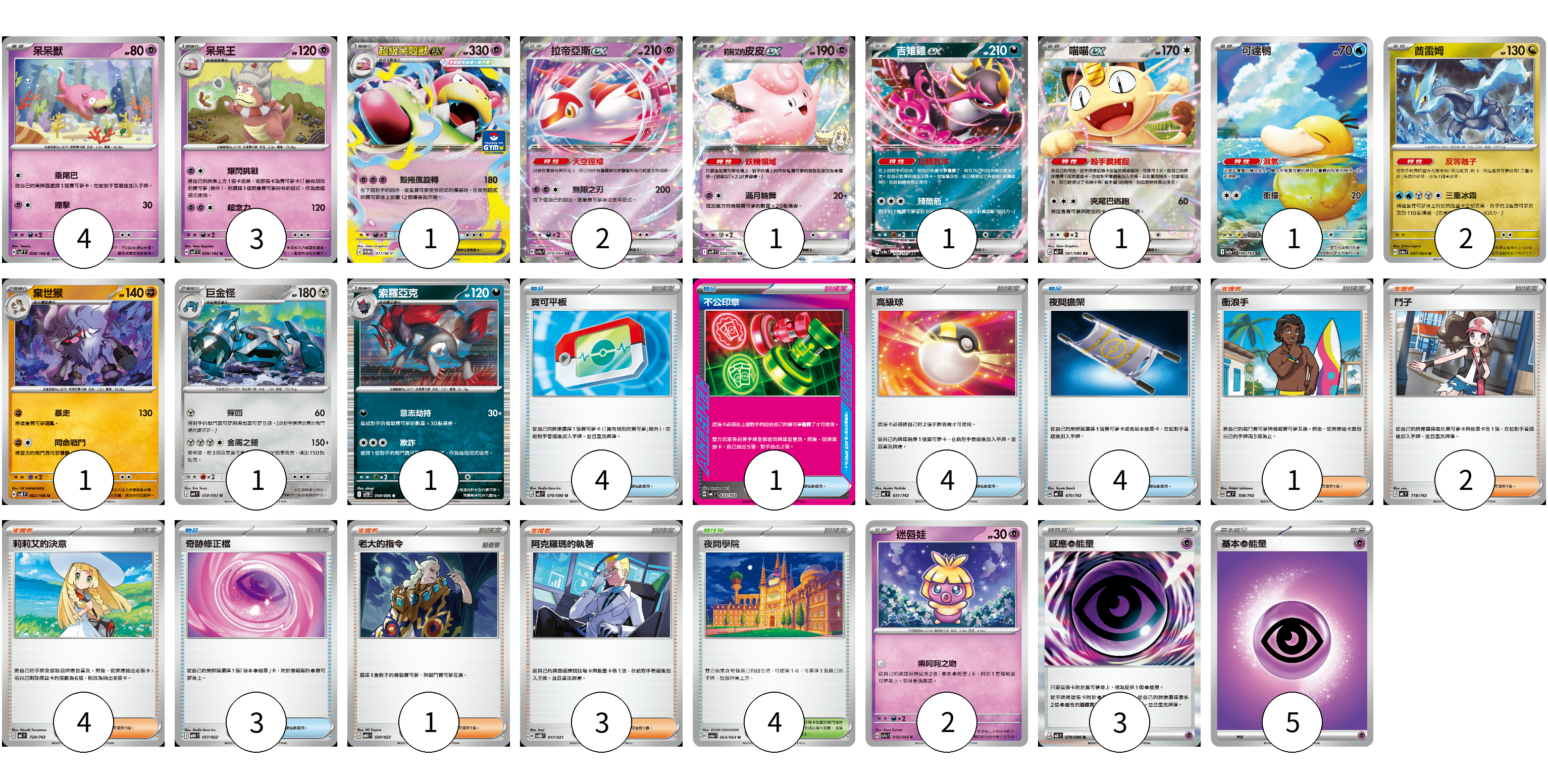牌組構築方案 以此牌組為基礎新構築牌組 顯示卡面 顯示列表 寶可夢卡(21) 4 3 1 2 1 1 1 1 2 1 1 1 2 物品卡(16) 4 1 4 4 3 支援者卡(11) 1 2 4 1 3 競技場卡(4) 4 能量卡(8) 3 5 寶可夢卡(21) 卡牌名稱 張數 卡牌名稱 張數 呆呆獸 SV7 038/102 04 呆呆王 SV7 039/102 03 超級呆殼獸ex M-P 077/M-P 01 拉帝亞斯ex SV7a 019/064 02 莉莉艾的皮皮ex SV9 033/100 01 吉雉雞ex SV8a 104/187 01 喵喵ex M3 061/080 01 可達鴨 M2a 199/193 01 酋雷姆 SV6a 047/064 02 棄世猴 SV8 062/106 01 巨金怪 M4 059/083 01 索羅亞克 SV11W 059/086 01 迷唇娃 SV7a 018/064 02 物品卡(16) 卡牌名稱 張數 卡牌名稱 張數 寶可平板 M3 070/080 04 不公印章 MC 633/742 01 高級球 MC 651/742 04 夜間擔架 MC 670/742 04 奇跡修正檔 MBD 017/022 03 支援者卡(11) 卡牌名稱 張數 卡牌名稱 張數 衝浪手 MC 708/742 01 鬥子 MC 718/742 02 莉莉艾的決意 MC 729/742 04 老大的指令 MBD 020/022 01 阿克羅瑪的執著 SVOM 017/021 03 競技場卡(4) 卡牌名稱 張數 卡牌名稱 張數 夜間學院 SV6a 064/064 04 能量卡(8) 卡牌名稱 張數 卡牌名稱 張數 感應【超】能量 M3 079/080 03 基本【超】能量 M-P PSY 05 以此牌組為基礎新構築牌組 牌組編碼 OfhAdv-oQTTYy-tFHfKP copy 列印牌組單 牌組編碼已複製 分享至SNS