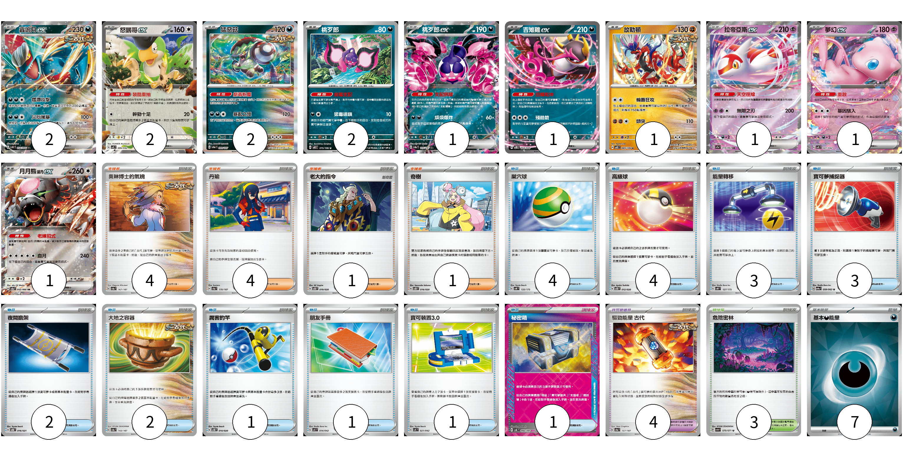 牌組構築方案 以此牌組為基礎新構築牌組 顯示卡面 顯示列表 寶可夢卡(14) 2 2 2 2 1 1 1 1 1 1 寶可夢道具(4) 4 物品卡(22) 4 4 3 3 2 2 1 1 1 1 支援者卡(10) 4 4 1 1 競技場卡(3) 3 能量卡(7) 7 寶可夢卡(14) 卡牌名稱 張數 卡牌名稱 張數 轟鳴月ex SV4K 054/066 02 怒鸚哥ex SVK 006/042 02 猛惡菇 SV8a 099/187 02 桃歹郎 SV8 075/106 02 桃歹郎ex SV8a 105/187 01 吉雉雞ex SVOD 004/020 01 故勒頓 SV8 069/106 01 拉帝亞斯ex SV7a 019/064 01 夢幻ex SVK 001/042 01 月月熊 赫月 ex SV5a 052/066 01 寶可夢道具(4) 卡牌名稱 張數 卡牌名稱 張數 驅勁能量 古代 SV8a 157/187 04 物品卡(22) 卡牌名稱 張數 卡牌名稱 張數 巢穴球 SVM 133/175 04 高級球 SVOD 012/020 04 能量轉移 SVM 127/175 03 寶可夢捕捉器 SV9a 059/063 03 夜間擔架 SVOM 016/021 02 大地之容器 SV8a 143/187 02 厲害釣竿 SVOD 010/020 01 朋友手冊 SVK 014/042 01 寶可裝置3.0 SVK 021/042 01 秘密箱 SV6 092/101 01 支援者卡(10) 卡牌名稱 張數 卡牌名稱 張數 奧琳博士的氣魄 SV8a 167/187 04 丹瑜 SV8a 170/187 04 老大的指令 SVOD 019/020 01 奇樹 SVOD 016/020 01 競技場卡(3) 卡牌名稱 張數 卡牌名稱 張數 危險密林 SV5K 070/071 03 能量卡(7) 卡牌名稱 張數 卡牌名稱 張數 基本【惡】能量 SVOM DAR 07 以此牌組為基礎新構築牌組 牌組編碼 OhywyA-kwIzZj-FEmBwp copy 列印牌組單 牌組編碼已複製 分享至SNS