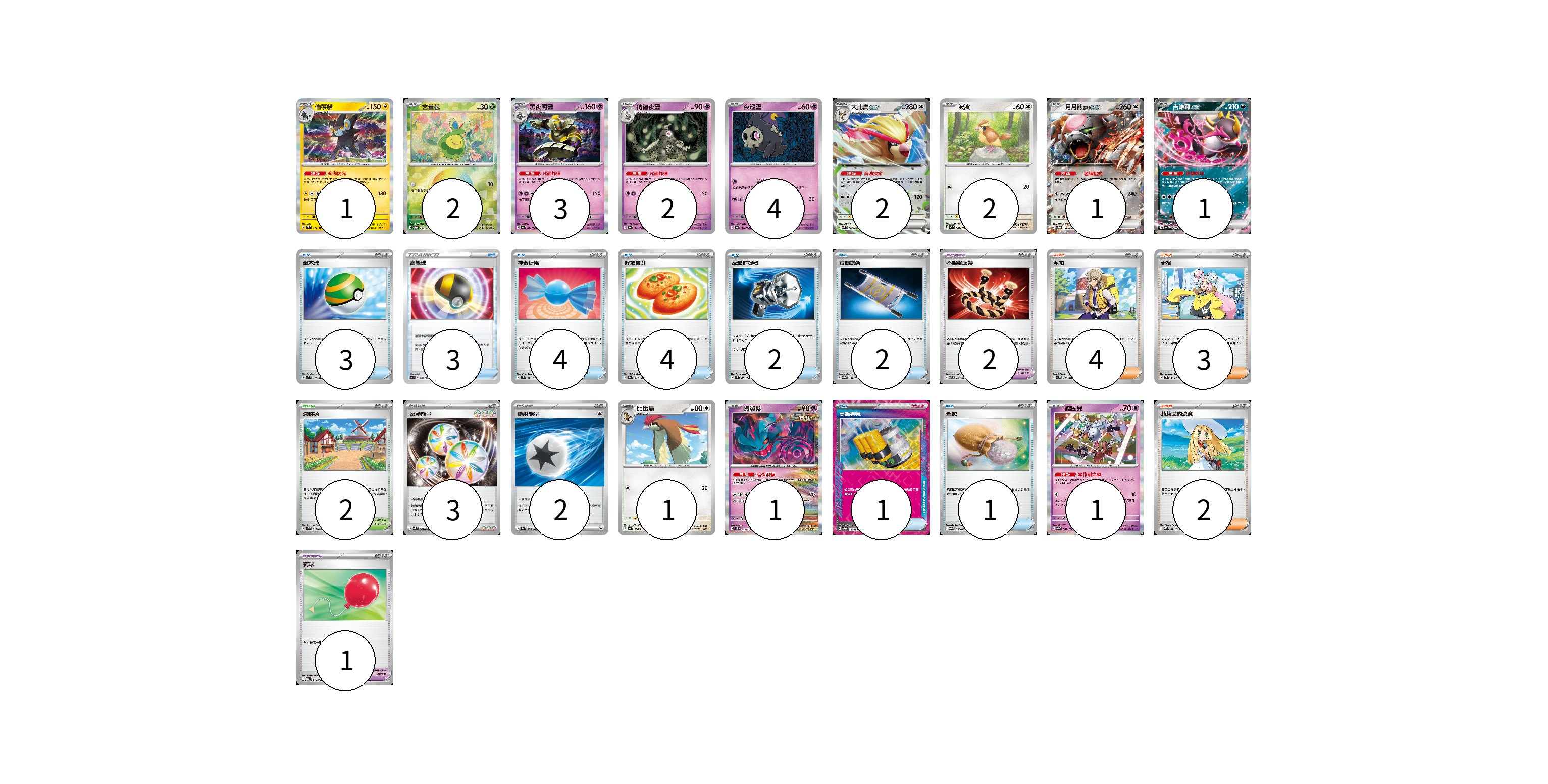 牌組構築方案 以此牌組為基礎新構築牌組 顯示卡面 顯示列表 寶可夢卡(21) 1 2 3 2 4 2 2 1 1 1 1 1 寶可夢道具(3) 2 1 物品卡(20) 3 3 4 4 2 2 1 1 支援者卡(9) 4 3 2 競技場卡(2) 2 能量卡(5) 3 2 寶可夢卡(21) 卡牌名稱 張數 卡牌名稱 張數 倫琴貓 SV2D 021/071 01 含羞苞 SV8a 001/187 02 黑夜魔靈 SV6a 020/064 03 彷徨夜靈 SV6a 019/064 02 夜巡靈 SV6a 018/064 04 大比鳥ex SVK 005/042 02 波波 SV3 087/108 02 月月熊 赫月 ex SV5a 052/066 01 吉雉雞ex SV6a 038/064 01 比比鳥 SV4a 138/190 01 振翼髮 SV5K 033/071 01 鑰圈兒 SV4a 087/190 01 寶可夢道具(3) 卡牌名稱 張數 卡牌名稱 張數 不服輸頭帶 SVTL 016/021 02 氣球 MBD 018/022 01 物品卡(20) 卡牌名稱 張數 卡牌名稱 張數 巢穴球 SV1S 070/078 03 高級球 S9 089/100 03 神奇糖果 SV1V 072/078 04 好友寶芬 SV8a 147/187 04 反擊捕捉器 SV4M 059/066 02 夜間擔架 SV8a 151/187 02 高級香氛 SV5a 055/066 01 聖灰 SV9a 056/063 01 支援者卡(9) 卡牌名稱 張數 卡牌名稱 張數 派帕 SV1V 076/078 04 奇樹 SV2D 069/071 03 莉莉艾的決意 MBD 021/022 02 競技場卡(2) 卡牌名稱 張數 卡牌名稱 張數 深缽鎮 SVK 039/042 02 能量卡(5) 卡牌名稱 張數 卡牌名稱 張數 反轉能量 SVK 041/042 03 噴射能量 SV8a 185/187 02 以此牌組為基礎新構築牌組 牌組編碼 OiGjmY-pSlvVQ-hFERFb copy 列印牌組單 牌組編碼已複製 分享至SNS