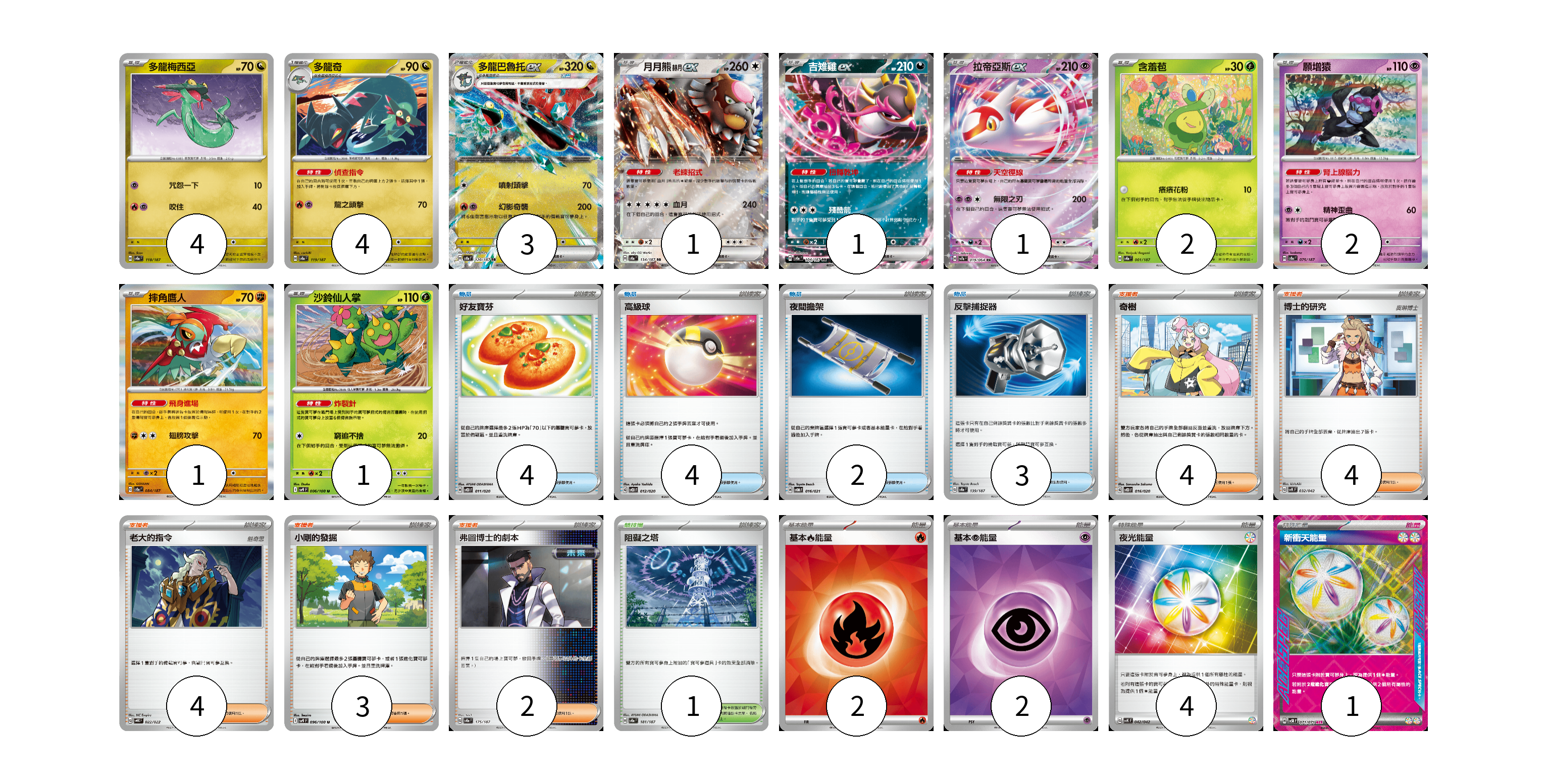 牌組構築方案 以此牌組為基礎新構築牌組 顯示卡面 顯示列表 寶可夢卡(20) 4 4 3 1 1 1 2 2 1 1 物品卡(13) 4 4 2 3 支援者卡(17) 4 4 4 3 2 競技場卡(1) 1 能量卡(9) 2 2 4 1 寶可夢卡(20) 卡牌名稱 張數 卡牌名稱 張數 多龍梅西亞 SV8a 118/187 04 多龍奇 SV8a 119/187 04 多龍巴魯托ex SV8a 120/187 03 月月熊 赫月ex SV8a 134/187 01 吉雉雞ex SV8a 104/187 01 拉帝亞斯ex SV7a 019/064 01 含羞苞 SV8a 001/187 02 願增猿 SV8a 075/187 02 摔角鷹人 SV8a 084/187 01 沙鈴仙人掌 SV9 006/100 01 物品卡(13) 卡牌名稱 張數 卡牌名稱 張數 好友寶芬 SVOD 011/020 04 高級球 SVOD 012/020 04 夜間擔架 SVOM 016/021 02 反擊捕捉器 SV8a 139/187 03 支援者卡(17) 卡牌名稱 張數 卡牌名稱 張數 奇樹 SVOD 016/020 04 博士的研究 SVK 032/042 04 老大的指令 SVHK 022/022 04 小剛的發掘 SV9 096/100 03 弗圖博士的劇本 SV8a 175/187 02 競技場卡(1) 卡牌名稱 張數 卡牌名稱 張數 阻礙之塔 SV8a 181/187 01 能量卡(9) 卡牌名稱 張數 卡牌名稱 張數 基本【火】能量 SVM FIR 02 基本【超】能量 SVM PSY 02 夜光能量 SVK 042/042 04 新衝天能量 SV5K 071/071 01 以此牌組為基礎新構築牌組 牌組編碼 OimuIu-HwAwmX-lkEyrO copy 列印牌組單 牌組編碼已複製 分享至SNS