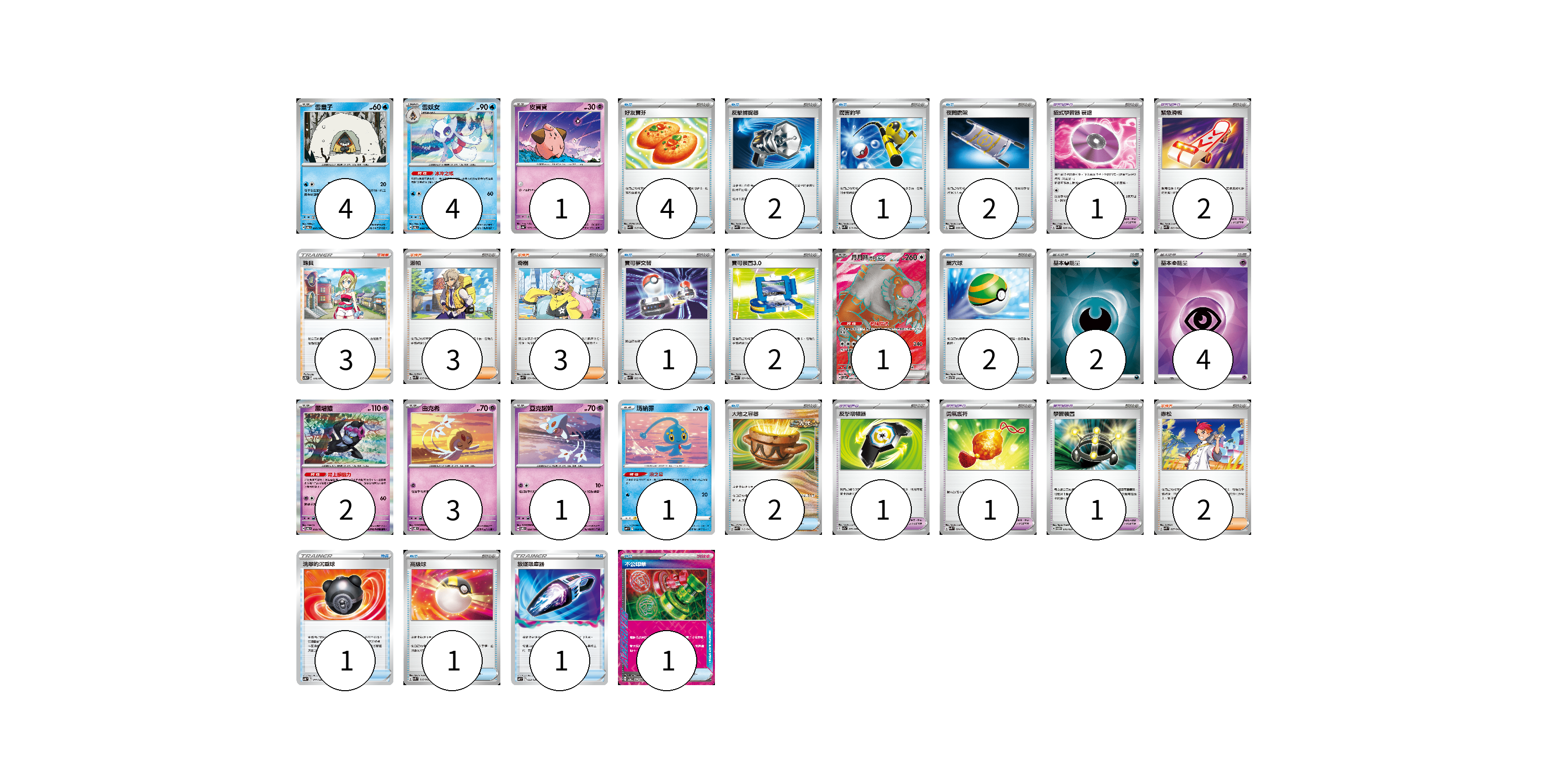 牌組構築方案 以此牌組為基礎新構築牌組 顯示卡面 顯示列表 寶可夢卡(17) 4 4 1 1 2 3 1 1 寶可夢道具(6) 1 2 1 1 1 物品卡(20) 4 2 1 2 1 2 2 2 1 1 1 1 支援者卡(11) 3 3 3 2 能量卡(6) 2 4 寶可夢卡(17) 卡牌名稱 張數 卡牌名稱 張數 雪童子 SV6 031/101 04 雪妖女 SV6 033/101 04 皮寶寶 SV4a 077/190 01 月月熊 赫月 ex SV5a 084/066 01 願增猿 SV6 055/101 02 由克希 SV8 048/106 03 亞克諾姆 SV8 050/106 01 瑪納霏 SVF 003/038 01 寶可夢道具(6) 卡牌名稱 張數 卡牌名稱 張數 招式學習器 衰退 SVK 026/042 01 緊急滑板 SVK 023/042 02 反擊增幅器 SV7a 059/064 01 勇氣護符 SVK 024/042 01 學習裝置 SVTM 016/022 01 物品卡(20) 卡牌名稱 張數 卡牌名稱 張數 好友寶芬 SVK 015/042 04 反擊捕捉器 SVK 009/042 02 厲害釣竿 SVK 011/042 01 夜間擔架 SV6a 056/064 02 寶可夢交替 SVK 022/042 01 寶可裝置3.0 SVK 021/042 02 巢穴球 SVTH 010/018 02 大地之容器 SVK 012/042 02 洗翠的沉重球 SVB 014/028 01 高級球 SVK 018/042 01 放逐吸塵器 SVF 023/038 01 不公印章 SV5a 053/066 01 支援者卡(11) 卡牌名稱 張數 卡牌名稱 張數 珠貝 SVTG 016/019 03 派帕 SVK 035/042 03 奇樹 SVK 031/042 03 赤松 SVK 027/042 02 能量卡(6) 卡牌名稱 張數 卡牌名稱 張數 基本【惡】能量 SVK DAR 02 基本【超】能量 SVK PSY 04 以此牌組為基礎新構築牌組 牌組編碼 OjSOMX-ATUskH-FWtdyR copy 列印牌組單 牌組編碼已複製 分享至SNS