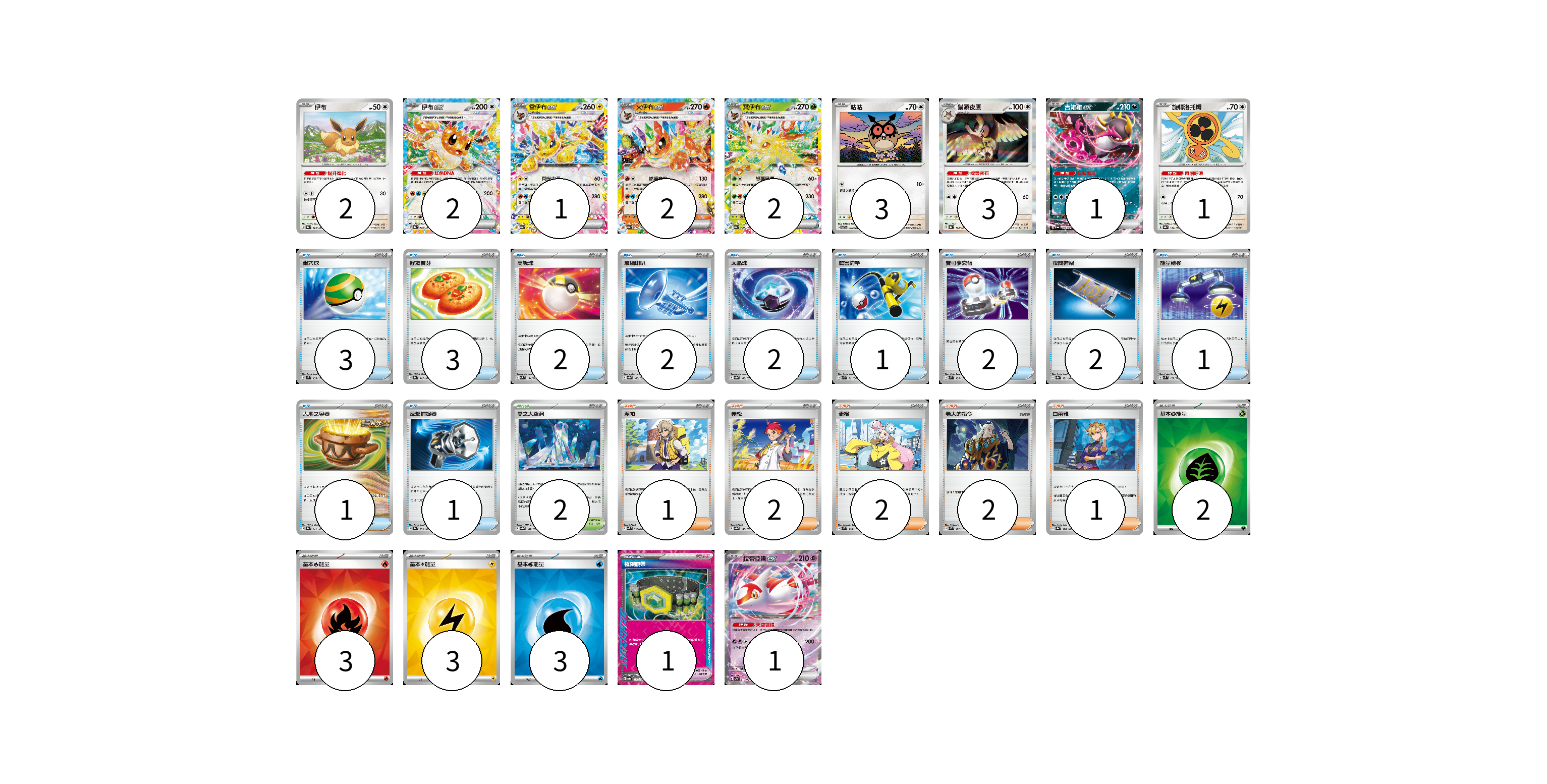 牌組構築方案 以此牌組為基礎新構築牌組 顯示卡面 顯示列表 寶可夢卡(18) 2 2 1 2 2 3 3 1 1 1 寶可夢道具(1) 1 物品卡(20) 3 3 2 2 2 1 2 2 1 1 1 支援者卡(8) 1 2 2 2 1 競技場卡(2) 2 能量卡(11) 2 3 3 3 寶可夢卡(18) 卡牌名稱 張數 卡牌名稱 張數 伊布 SV8a 125/187 02 伊布ex SV8a 126/187 02 雷伊布ex SV8a 052/187 01 火伊布ex SV8a 022/187 02 葉伊布ex SV8a 003/187 02 咕咕 SV7 076/102 03 貓頭夜鷹 SV8a 128/187 03 吉雉雞ex SV6a 038/064 01 旋轉洛托姆 SV8a 131/187 01 拉帝亞斯ex SV7a 019/064 01 寶可夢道具(1) 卡牌名稱 張數 卡牌名稱 張數 極限腰帶 SV8a 159/187 01 物品卡(20) 卡牌名稱 張數 卡牌名稱 張數 巢穴球 SVM 133/175 03 好友寶芬 SV8a 147/187 03 高級球 SVM 134/175 02 玻璃喇叭 SV8a 140/187 02 太晶珠 SV8a 145/187 02 厲害釣竿 SVK 011/042 01 寶可夢交替 SVM 136/175 02 夜間擔架 SV8a 151/187 02 能量轉移 SVM 127/175 01 大地之容器 SV8a 143/187 01 反擊捕捉器 SV8a 139/187 01 支援者卡(8) 卡牌名稱 張數 卡牌名稱 張數 派帕 SVK 035/042 01 赤松 SV8a 163/187 02 奇樹 SVM 160/175 02 老大的指令 SVM 172/175 02 白蕾雅 SV8a 176/187 01 競技場卡(2) 卡牌名稱 張數 卡牌名稱 張數 零之大空洞 SV8a 182/187 02 能量卡(11) 卡牌名稱 張數 卡牌名稱 張數 基本【草】能量 SVK GRA 02 基本【火】能量 SVK FIR 03 基本【雷】能量 SVK LIG 03 基本【水】能量 SVK WAT 03 以此牌組為基礎新構築牌組 牌組編碼 OjryLS-eWTiuJ-yHopSk copy 列印牌組單 牌組編碼已複製 分享至SNS