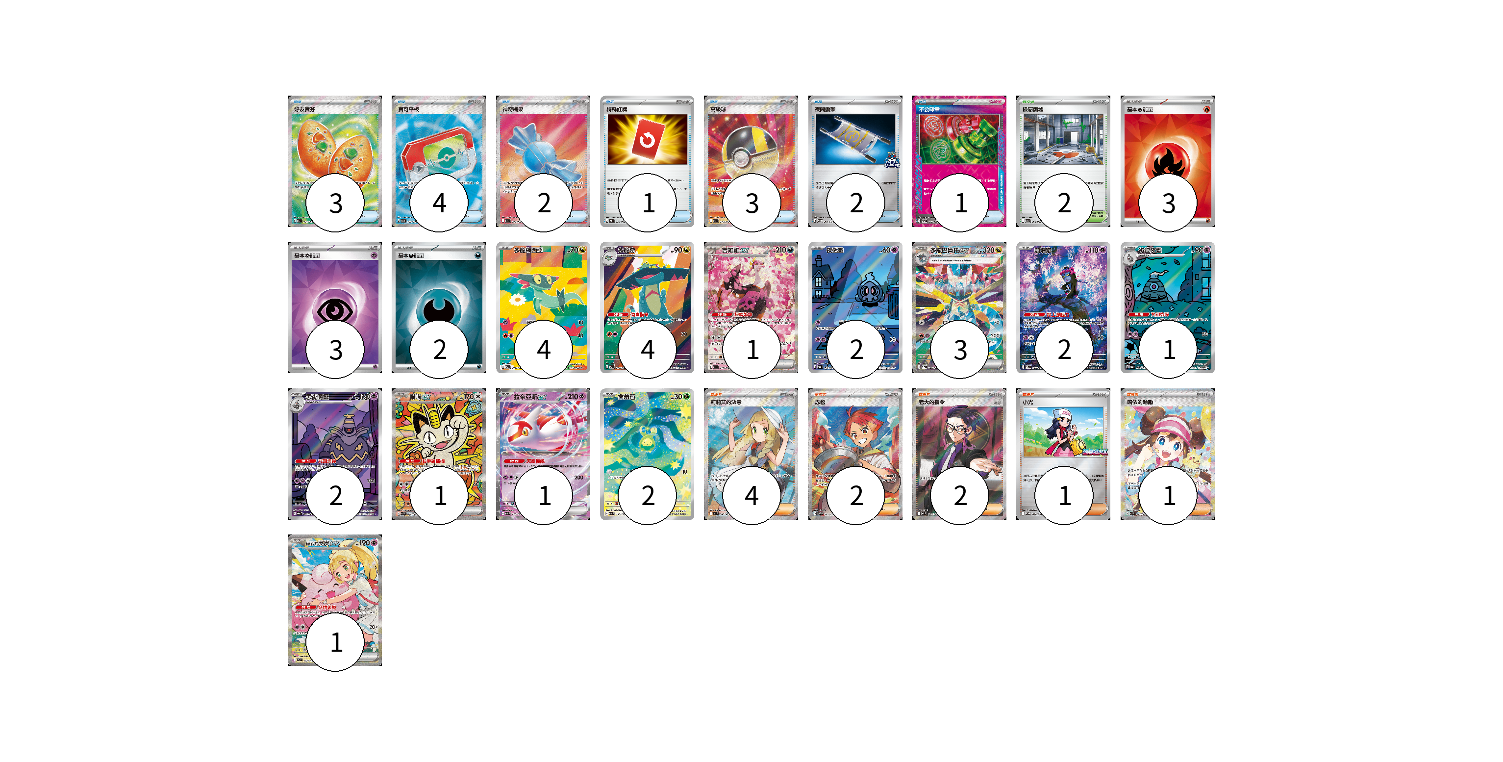 牌組構築方案 以此牌組為基礎新構築牌組 顯示卡面 顯示列表 寶可夢卡(24) 4 4 1 2 3 2 1 2 1 1 2 1 物品卡(16) 3 4 2 1 3 2 1 支援者卡(10) 4 2 2 1 1 競技場卡(2) 2 能量卡(8) 3 3 2 寶可夢卡(24) 卡牌名稱 張數 卡牌名稱 張數 多龍梅西亞 M2a 211/193 04 多龍奇 M2a 212/193 04 吉雉雞ex M2a 244/193 01 夜巡靈 SV6a 068/064 02 多龍巴魯托ex SV8a 221/187 03 願增猿 SV6 107/101 02 彷徨夜靈 SV6a 069/064 01 黑夜魔靈 SV6a 070/064 02 喵喵ex M3 114/080 01 拉帝亞斯ex M2a 075/193 01 含羞苞 M2a 196/193 02 莉莉艾的皮皮ex MC 765/742 01 物品卡(16) 卡牌名稱 張數 卡牌名稱 張數 好友寶芬 M1S 081/063 03 寶可平板 M3 103/080 04 神奇糖果 M1S 082/063 02 特殊紅牌 M4 072/083 01 高級球 M2a 216/193 03 夜間擔架 SV-P 204/SV-P 02 不公印章 SV5a 053/066 01 支援者卡(10) 卡牌名稱 張數 卡牌名稱 張數 莉莉艾的決意 M1L 086/063 04 赤松 SV7 123/102 02 老大的指令(烏羽) MC 760/742 02 小光 M-P 028/M-P 01 鳴依的勉勵 M3 115/080 01 競技場卡(2) 卡牌名稱 張數 卡牌名稱 張數 險惡廢墟 M1L 063/063 02 能量卡(8) 卡牌名稱 張數 卡牌名稱 張數 基本【火】能量 SVM FIR 03 基本【超】能量 SVM PSY 03 基本【惡】能量 SVM DAR 02 以此牌組為基礎新構築牌組 牌組編碼 OkSeWk-eksaPZ-bFMHxC copy 列印牌組單 牌組編碼已複製 分享至SNS