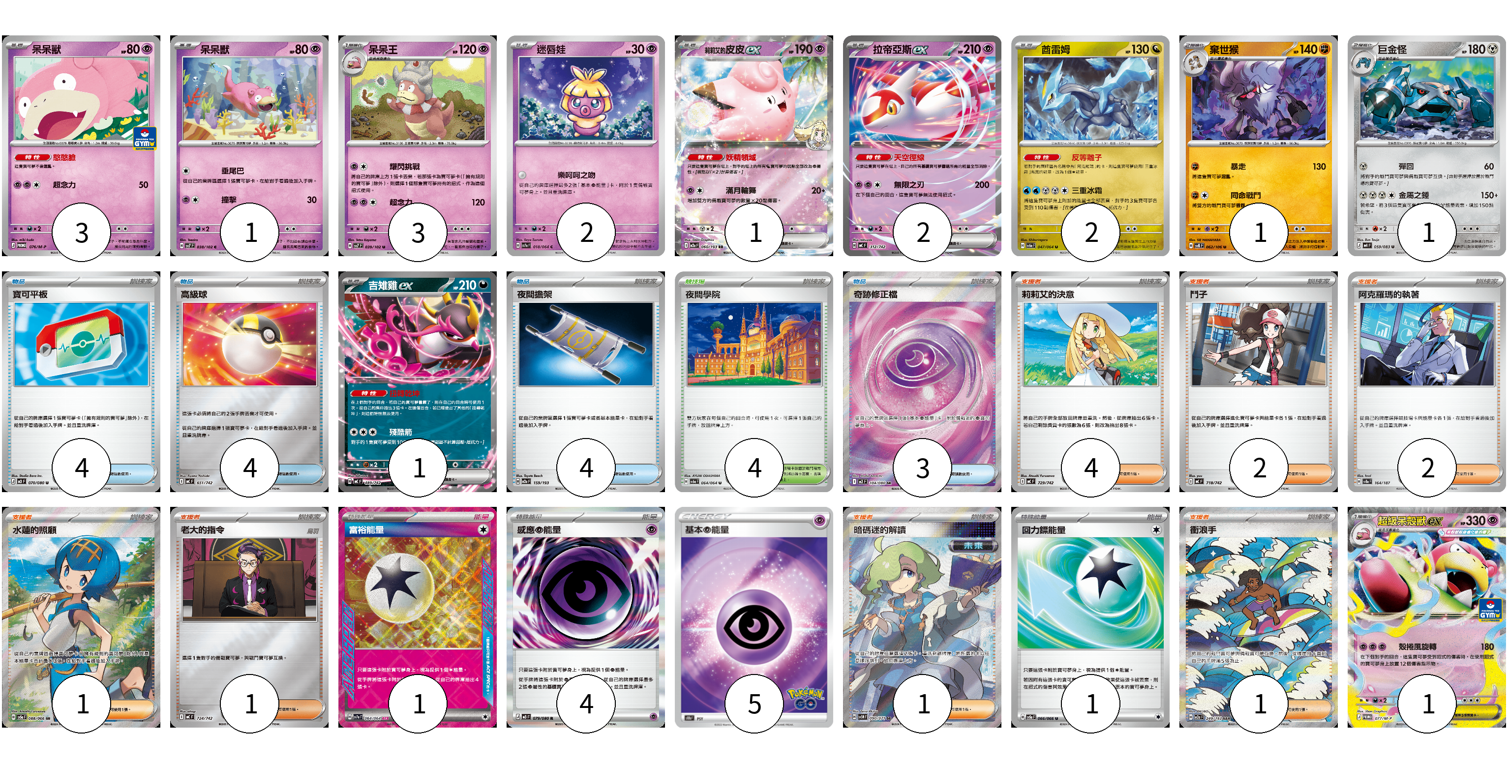 牌組構築方案 以此牌組為基礎新構築牌組 顯示卡面 顯示列表 寶可夢卡(18) 3 1 3 2 1 2 2 1 1 1 1 物品卡(15) 4 4 4 3 支援者卡(12) 4 2 2 1 1 1 1 競技場卡(4) 4 能量卡(11) 1 4 5 1 寶可夢卡(18) 卡牌名稱 張數 卡牌名稱 張數 呆呆獸 M-P 076/M-P 03 呆呆獸 SV7 038/102 01 呆呆王 SV7 039/102 03 迷唇娃 SV7a 018/064 02 莉莉艾的皮皮ex M2a 060/193 01 拉帝亞斯ex MC 312/742 02 酋雷姆 SV6a 047/064 02 棄世猴 SV8 062/106 01 巨金怪 M4 059/083 01 吉雉雞ex MC 489/742 01 超級呆殼獸ex M-P 077/M-P 01 物品卡(15) 卡牌名稱 張數 卡牌名稱 張數 寶可平板 M3 070/080 04 高級球 MC 651/742 04 夜間擔架 M2a 159/193 04 奇跡修正檔 M3 104/080 03 支援者卡(12) 卡牌名稱 張數 卡牌名稱 張數 莉莉艾的決意 MC 729/742 04 鬥子 MC 718/742 02 阿克羅瑪的執著 SV8a 164/187 02 水蓮的照顧 SV5a 088/066 01 老大的指令 MC 724/742 01 暗碼迷的解讀 SV5M 090/071 01 衝浪手 M2a 249/193 01 競技場卡(4) 卡牌名稱 張數 卡牌名稱 張數 夜間學院 SV6a 064/064 04 能量卡(11) 卡牌名稱 張數 卡牌名稱 張數 富裕能量 SV7a 064/064 01 感應【超】能量 M3 079/080 04 基本超能量 S10b PSY 05 回力鏢能量 SV5a 066/066 01 以此牌組為基礎新構築牌組 牌組編碼 OlcnKp-rEYgfZ-vXQlCm copy 列印牌組單 牌組編碼已複製 分享至SNS
