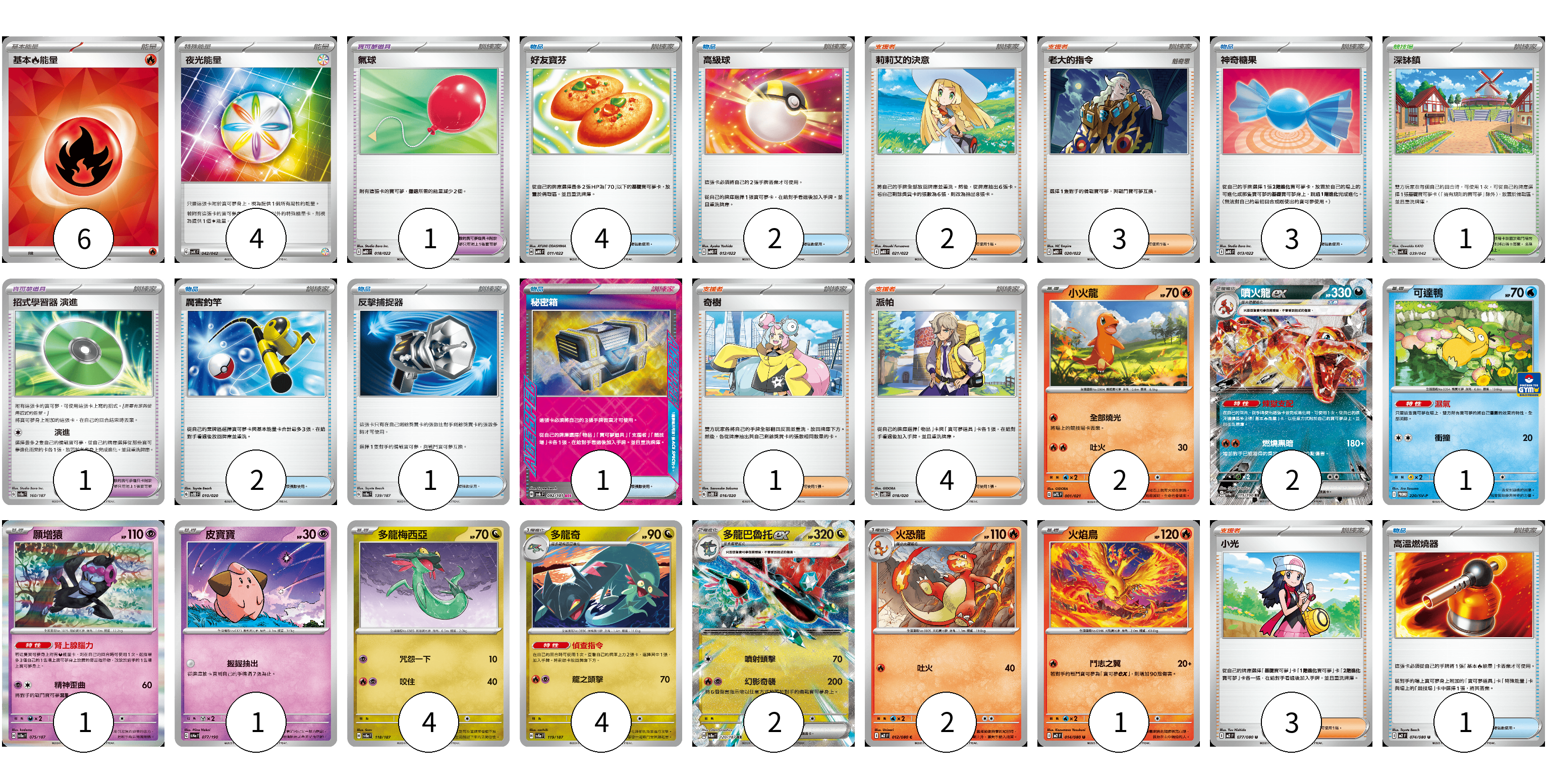 牌組構築方案 以此牌組為基礎新構築牌組 顯示卡面 顯示列表 寶可夢卡(20) 2 2 1 1 1 4 4 2 2 1 寶可夢道具(2) 1 1 物品卡(14) 4 2 3 2 1 1 1 支援者卡(13) 2 3 1 4 3 競技場卡(1) 1 能量卡(10) 6 4 寶可夢卡(20) 卡牌名稱 張數 卡牌名稱 張數 小火龍 SVTL 001/021 02 噴火龍ex SV4a 115/190 02 可達鴨 SV-P 220/SV-P 01 願增猿 SV8a 075/187 01 皮寶寶 SV4a 077/190 01 多龍梅西亞 SV8a 118/187 04 多龍奇 SV8a 119/187 04 多龍巴魯托ex SV8a 120/187 02 火恐龍 M2 012/080 02 火焰鳥 M2 014/080 01 寶可夢道具(2) 卡牌名稱 張數 卡牌名稱 張數 氣球 MBD 018/022 01 招式學習器 演進 SV8a 160/187 01 物品卡(14) 卡牌名稱 張數 卡牌名稱 張數 好友寶芬 MBG 011/022 04 高級球 MBG 012/022 02 神奇糖果 MBG 013/022 03 厲害釣竿 SVOD 010/020 02 反擊捕捉器 SV8a 139/187 01 秘密箱 SV6 092/101 01 高溫燃燒器 M2 074/080 01 支援者卡(13) 卡牌名稱 張數 卡牌名稱 張數 莉莉艾的決意 MBD 021/022 02 老大的指令 MBD 020/022 03 奇樹 SVOD 016/020 01 派帕 SVOD 018/020 04 小光 M2 077/080 03 競技場卡(1) 卡牌名稱 張數 卡牌名稱 張數 深缽鎮 SVK 039/042 01 能量卡(10) 卡牌名稱 張數 卡牌名稱 張數 基本【火】能量 SVQL FIR 06 夜光能量 SVK 042/042 04 以此牌組為基礎新構築牌組 牌組編碼 OolGDc-vxtDBC-AJpUJg copy 列印牌組單 牌組編碼已複製 分享至SNS