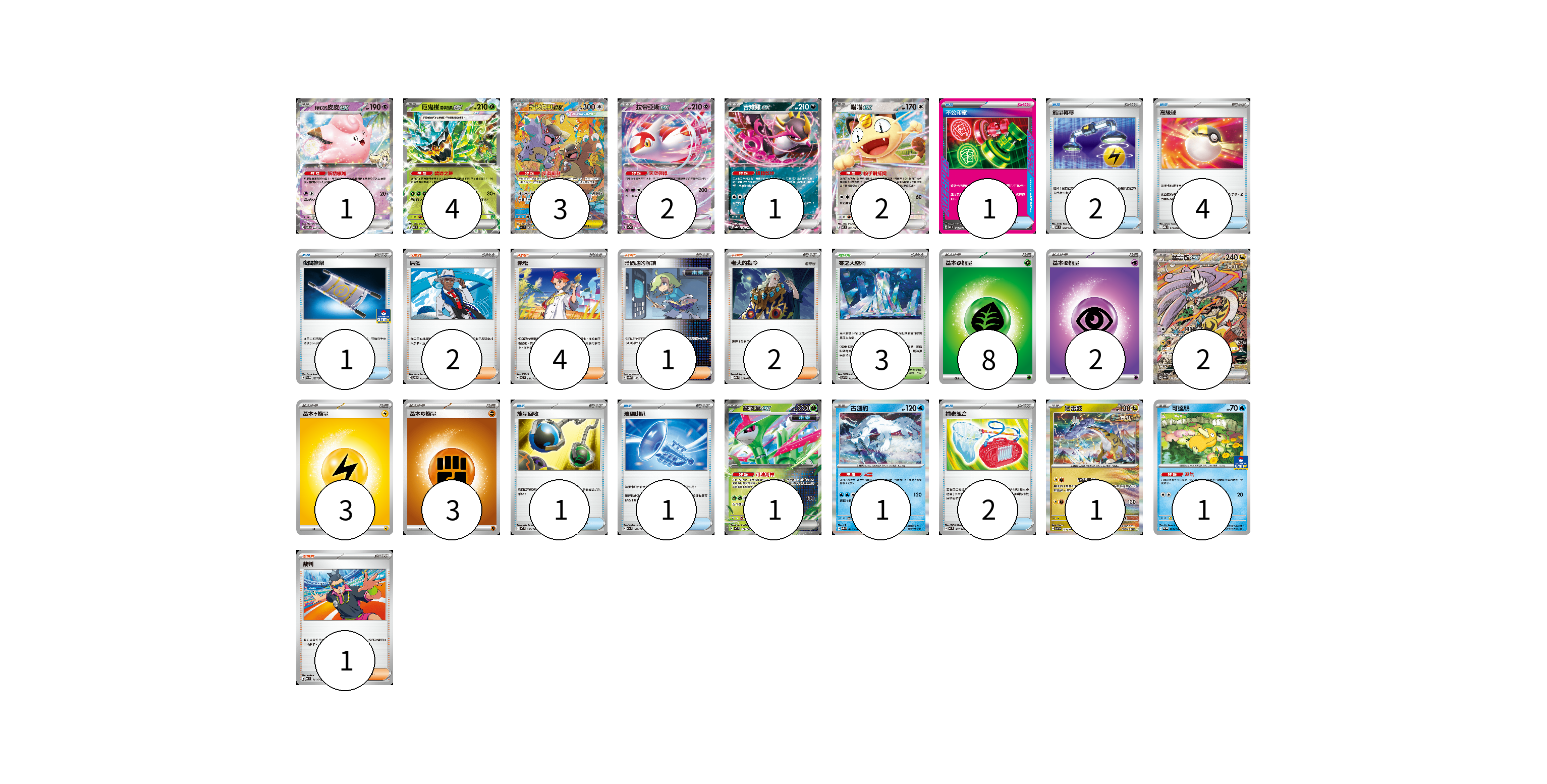牌組構築方案 以此牌組為基礎新構築牌組 顯示卡面 顯示列表 寶可夢卡(19) 1 4 3 2 1 2 2 1 1 1 1 物品卡(12) 1 2 4 1 1 1 2 支援者卡(10) 2 4 1 2 1 競技場卡(3) 3 能量卡(16) 8 2 3 3 寶可夢卡(19) 卡牌名稱 張數 卡牌名稱 張數 莉莉艾的皮皮ex SV9 033/100 01 厄鬼椪 碧草面具ex MC 082/742 04 超級袋獸ex M1S 089/063 03 拉帝亞斯ex SV7a 019/064 02 吉雉雞ex SV8a 104/187 01 喵喵ex M3 061/080 02 猛雷鼓ex SV8a 222/187 02 鐵斑葉ex MC 077/742 01 古劍豹 M2a 043/193 01 猛雷鼓 SV7 075/102 01 可達鴨 SV-P 220/SV-P 01 物品卡(12) 卡牌名稱 張數 卡牌名稱 張數 不公印章 MC 633/742 01 能量轉移 MC 638/742 02 高級球 MBG 012/022 04 夜間擔架 SV-P 227/SV-P 01 能量回收 MC 636/742 01 玻璃喇叭 M2a 149/193 01 捕蟲組合 MC 667/742 02 支援者卡(10) 卡牌名稱 張數 卡牌名稱 張數 席藍 SV8 102/106 02 赤松 SV7 097/102 04 暗碼迷的解讀 SV8a 165/187 01 老大的指令 MBG 021/022 02 裁判 MC 711/742 01 競技場卡(3) 卡牌名稱 張數 卡牌名稱 張數 零之大空洞 SV7 102/102 03 能量卡(16) 卡牌名稱 張數 卡牌名稱 張數 基本【草】能量 MJ GRA 08 基本【超】能量 M-P PSY 02 基本【雷】能量 MJ LIG 03 基本【鬥】能量 MC FIG 03 以此牌組為基礎新構築牌組 牌組編碼 OoomTs-pJPiqG-PLzSfv copy 列印牌組單 牌組編碼已複製 分享至SNS