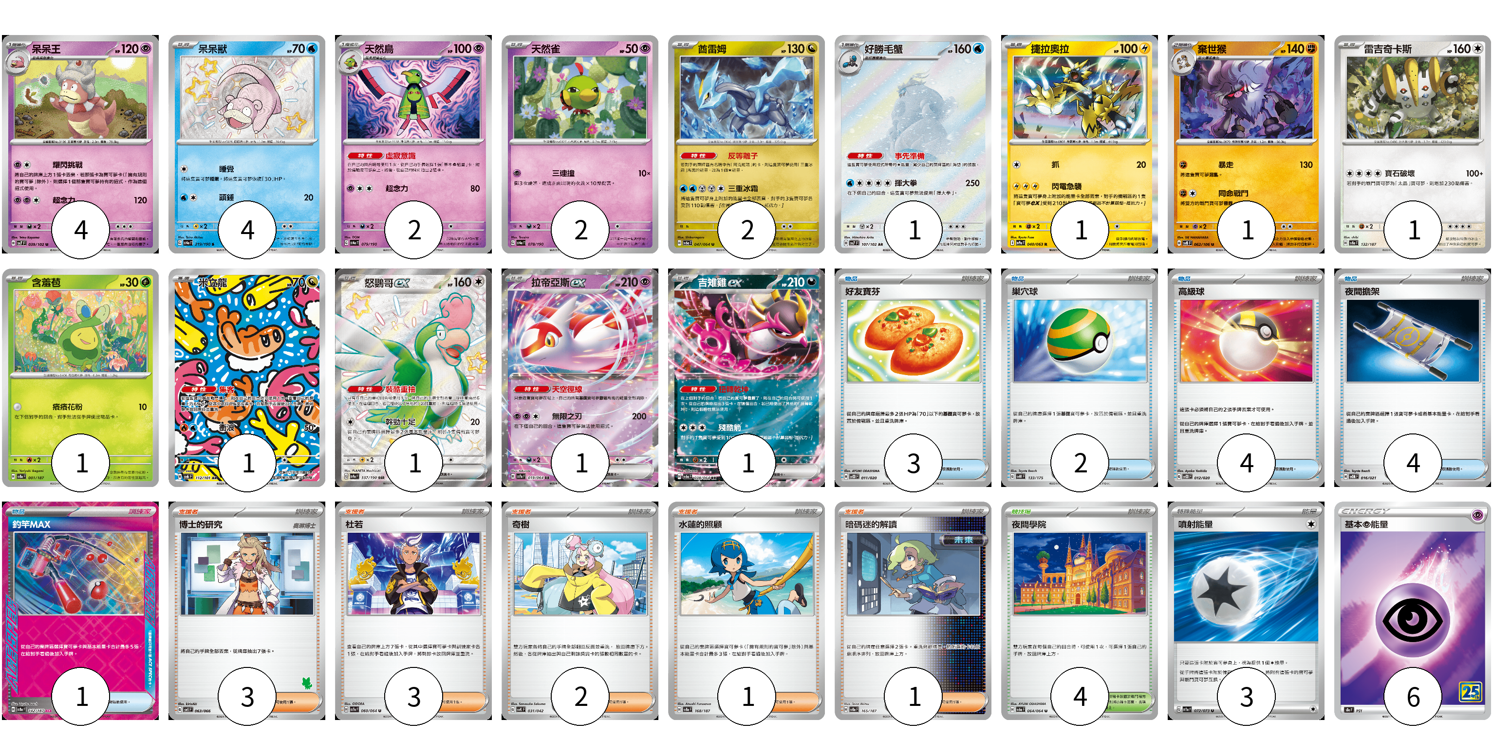 牌組構築方案 以此牌組為基礎新構築牌組 顯示卡面 顯示列表 寶可夢卡(23) 4 4 2 2 2 1 1 1 1 1 1 1 1 1 物品卡(14) 3 2 4 4 1 支援者卡(10) 3 3 2 1 1 競技場卡(4) 4 能量卡(9) 3 6 寶可夢卡(23) 卡牌名稱 張數 卡牌名稱 張數 呆呆王 SV7 039/102 04 呆呆獸 SV4a 219/190 04 天然鳥 SV4a 079/190 02 天然雀 SV4a 078/190 02 酋雷姆 SV6a 047/064 02 好勝毛蟹 SV7 107/102 01 捷拉奧拉 SV9a 040/063 01 棄世猴 SV8 062/106 01 雷吉奇卡斯 SV8a 132/187 01 含羞苞 SV8a 001/187 01 米立龍 SV6 112/101 01 怒鸚哥ex SV4a 337/190 01 拉帝亞斯ex SV7a 019/064 01 吉雉雞ex SV6a 038/064 01 物品卡(14) 卡牌名稱 張數 卡牌名稱 張數 好友寶芬 SVOD 011/020 03 巢穴球 SVM 133/175 02 高級球 SVOD 012/020 04 夜間擔架 SVOM 016/021 04 釣竿MAX SV8a 142/187 01 支援者卡(10) 卡牌名稱 張數 卡牌名稱 張數 博士的研究 SVI 063/066 03 杜若 SV7a 060/064 03 奇樹 SVK 031/042 02 水蓮的照顧 SV8a 168/187 01 暗碼迷的解讀 SV8a 165/187 01 競技場卡(4) 卡牌名稱 張數 卡牌名稱 張數 夜間學院 SV6a 064/064 04 能量卡(9) 卡牌名稱 張數 卡牌名稱 張數 噴射能量 SV1a 072/073 03 基本超能量 S8a PSY 06 以此牌組為基礎新構築牌組 牌組編碼 OprRYP-qRoYrS-TqxFSN copy 列印牌組單 牌組編碼已複製 分享至SNS