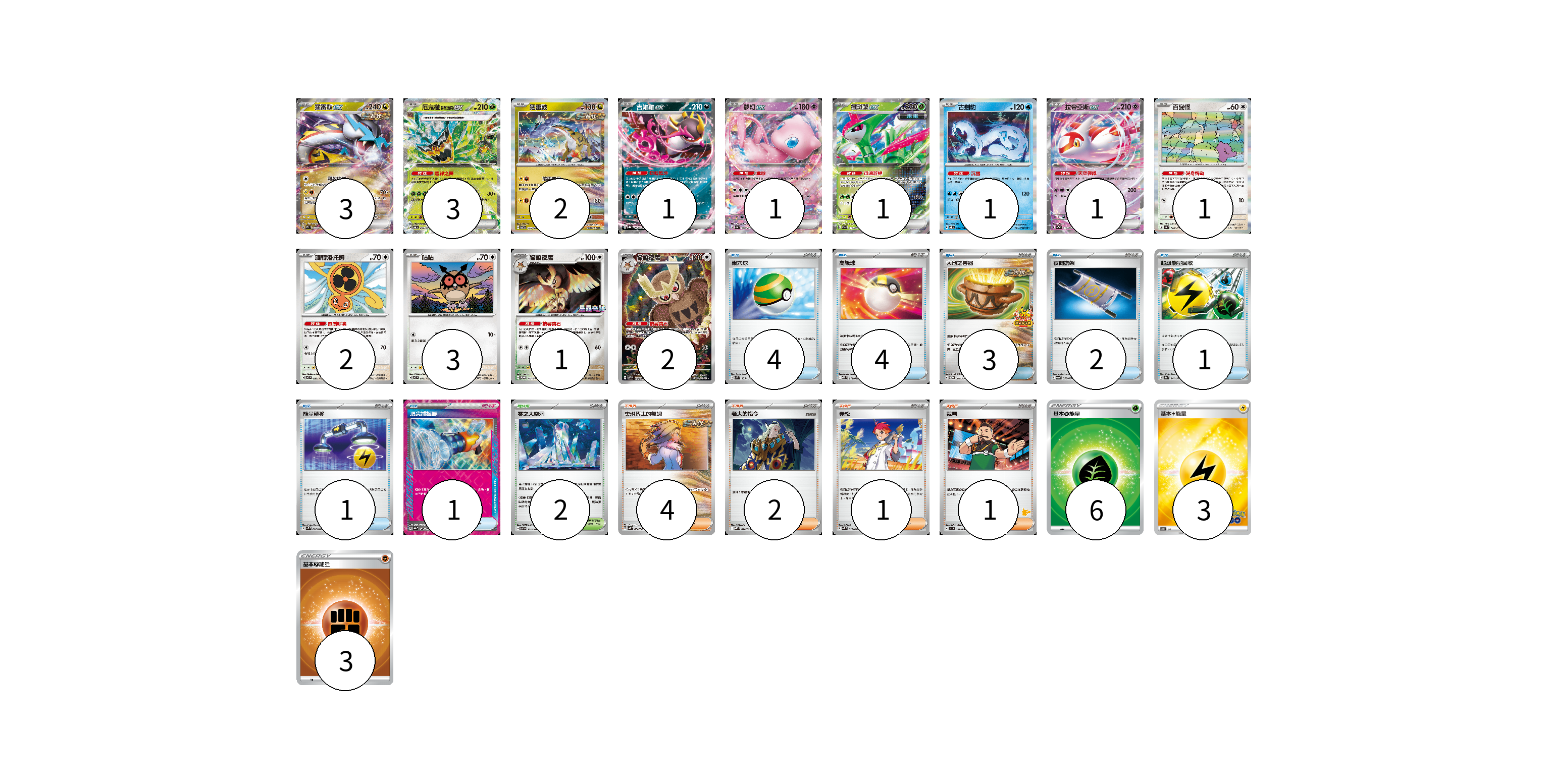 牌組構築方案 以此牌組為基礎新構築牌組 顯示卡面 顯示列表 寶可夢卡(22) 3 3 2 1 1 1 1 1 1 2 3 1 2 物品卡(16) 4 4 3 2 1 1 1 支援者卡(8) 4 2 1 1 競技場卡(2) 2 能量卡(12) 6 3 3 寶可夢卡(22) 卡牌名稱 張數 卡牌名稱 張數 猛雷鼓ex SV5K 053/071 03 厄鬼椪 碧草面具ex SV6 016/101 03 猛雷鼓 SV7 075/102 02 吉雉雞ex SV8a 104/187 01 夢幻ex SV4a 076/190 01 鐵斑葉ex SV5M 016/071 01 古劍豹 SV8 032/106 01 拉帝亞斯ex SV7a 019/064 01 百變怪 SV4a 144/190 01 旋轉洛托姆 SV7 080/102 02 咕咕 SV7 076/102 03 貓頭夜鷹 SV-P 145/SV-P 01 貓頭夜鷹 SV7 114/102 02 物品卡(16) 卡牌名稱 張數 卡牌名稱 張數 巢穴球 SVM 133/175 04 高級球 MBD 014/022 04 大地之容器 SV-P 084/SV-P 03 夜間擔架 SV6a 056/064 02 超級能量回收 SV8a 141/187 01 能量轉移 SVK 008/042 01 頂尖捕捉器 SV8a 148/187 01 支援者卡(8) 卡牌名稱 張數 卡牌名稱 張數 奧琳博士的氣魄 SV4K 064/066 04 老大的指令 MBD 020/022 02 赤松 SVK 027/042 01 裁判 SVI 059/066 01 競技場卡(2) 卡牌名稱 張數 卡牌名稱 張數 零之大空洞 SV7 102/102 02 能量卡(12) 卡牌名稱 張數 卡牌名稱 張數 基本【草】能量 SI GRA 06 基本雷能量 S10b LIG 03 基本鬥能量 SLL FIG 03 以此牌組為基礎新構築牌組 牌組編碼 OpuAxW-gzNGFU-fJVfwN copy 列印牌組單 牌組編碼已複製 分享至SNS