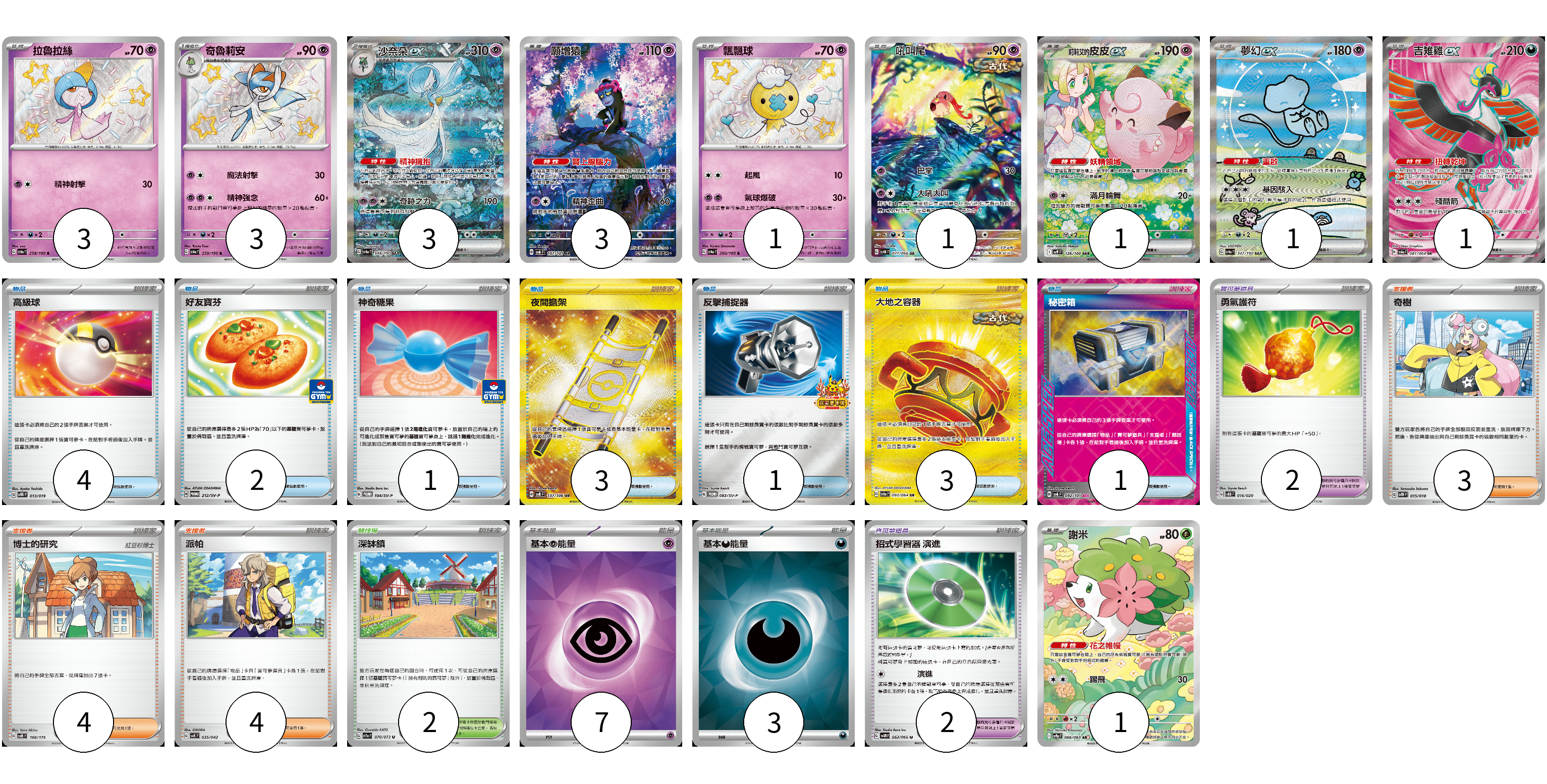 牌組構築方案 以此牌組為基礎新構築牌組 顯示卡面 顯示列表 寶可夢卡(18) 3 3 3 3 1 1 1 1 1 1 寶可夢道具(4) 2 2 物品卡(15) 4 2 1 3 1 3 1 支援者卡(11) 3 4 4 競技場卡(2) 2 能量卡(10) 7 3 寶可夢卡(18) 卡牌名稱 張數 卡牌名稱 張數 拉魯拉絲 SV4a 258/190 03 奇魯莉安 SV4a 259/190 03 沙奈朵ex SV4a 348/190 03 願增猿 SV6 107/101 03 飄飄球 SV4a 260/190 01 吼叫尾 SV4K 071/066 01 莉莉艾的皮皮ex SV9 126/100 01 夢幻ex SV4a 347/190 01 吉雉雞ex SV6a 081/064 01 謝米 SV9a 066/063 01 寶可夢道具(4) 卡牌名稱 張數 卡牌名稱 張數 勇氣護符 SVEM 016/020 02 招式學習器 演進 SV4M 063/066 02 物品卡(15) 卡牌名稱 張數 卡牌名稱 張數 高級球 SVTG 013/019 04 好友寶芬 SV-P 212/SV-P 02 神奇糖果 SV-P 104/SV-P 01 夜間擔架 SV8 137/106 03 反擊捕捉器 SV-P 083/SV-P 01 大地之容器 SV6a 093/064 03 秘密箱 SV6 092/101 01 支援者卡(11) 卡牌名稱 張數 卡牌名稱 張數 奇樹 SVTH 015/018 03 博士的研究 SVM 166/175 04 派帕 SVK 035/042 04 競技場卡(2) 卡牌名稱 張數 卡牌名稱 張數 深缽鎮 SV1a 070/073 02 能量卡(10) 卡牌名稱 張數 卡牌名稱 張數 基本【超】能量 SVOD PSY 07 基本【惡】能量 SVK DAR 03 以此牌組為基礎新構築牌組 牌組編碼 OqtFvc-efxpZO-wHQCFQ copy 列印牌組單 牌組編碼已複製 分享至SNS