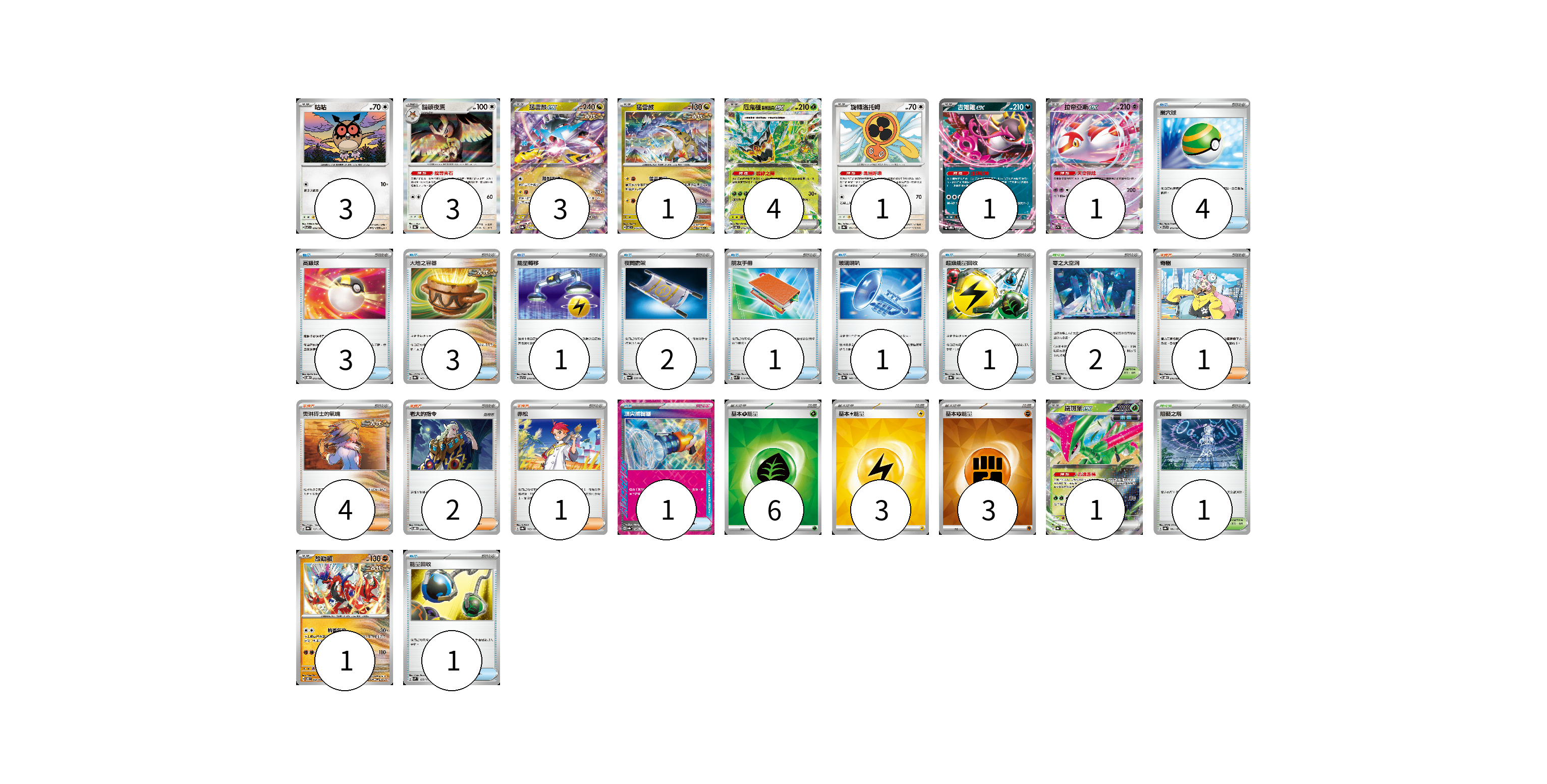 牌組構築方案 以此牌組為基礎新構築牌組 顯示卡面 顯示列表 寶可夢卡(19) 3 3 3 1 4 1 1 1 1 1 物品卡(18) 4 3 3 1 2 1 1 1 1 1 支援者卡(8) 1 4 2 1 競技場卡(3) 2 1 能量卡(12) 6 3 3 寶可夢卡(19) 卡牌名稱 張數 卡牌名稱 張數 咕咕 SV7 076/102 03 貓頭夜鷹 SV8a 128/187 03 猛雷鼓ex SV8a 124/187 03 猛雷鼓 SV7 075/102 01 厄鬼椪 碧草面具ex SV6 016/101 04 旋轉洛托姆 SV8a 131/187 01 吉雉雞ex SVOD 004/020 01 拉帝亞斯ex SV7a 019/064 01 鐵斑葉ex SV8a 016/187 01 故勒頓 SV8 069/106 01 物品卡(18) 卡牌名稱 張數 卡牌名稱 張數 巢穴球 SVTR 013/021 04 高級球 SVOD 012/020 03 大地之容器 SV8a 143/187 03 能量轉移 SVTR 010/021 01 夜間擔架 SV6a 056/064 02 朋友手冊 SVK 014/042 01 玻璃喇叭 SV8a 140/187 01 超級能量回收 SV8a 141/187 01 頂尖捕捉器 SV8a 148/187 01 能量回收 SVM 125/175 01 支援者卡(8) 卡牌名稱 張數 卡牌名稱 張數 奇樹 SVOD 016/020 01 奧琳博士的氣魄 SV8a 167/187 04 老大的指令 SVOD 019/020 02 赤松 SV8a 163/187 01 競技場卡(3) 卡牌名稱 張數 卡牌名稱 張數 零之大空洞 SV8a 182/187 02 阻礙之塔 SV8a 181/187 01 能量卡(12) 卡牌名稱 張數 卡牌名稱 張數 基本【草】能量 SVM GRA 06 基本【雷】能量 SVM LIG 03 基本【鬥】能量 SVM FIG 03 以此牌組為基礎新構築牌組 牌組編碼 OrOKln-ocYuBz-lPogDS copy 列印牌組單 牌組編碼已複製 分享至SNS