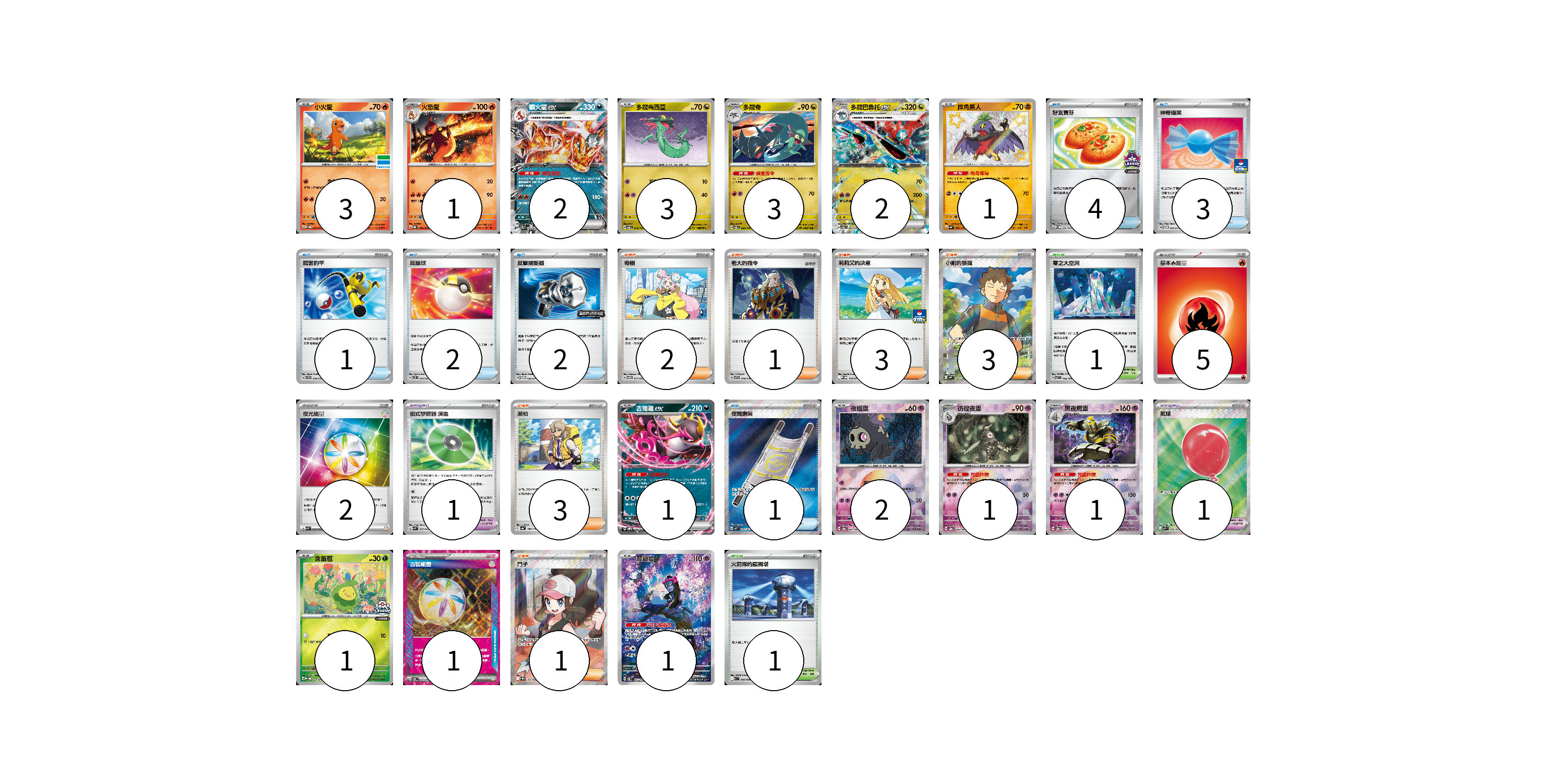 牌組構築方案 以此牌組為基礎新構築牌組 顯示卡面 顯示列表 寶可夢卡(22) 3 1 2 3 3 2 1 1 2 1 1 1 1 寶可夢道具(2) 1 1 物品卡(13) 4 3 1 2 2 1 支援者卡(13) 2 1 3 3 3 1 競技場卡(2) 1 1 能量卡(8) 5 2 1 寶可夢卡(22) 卡牌名稱 張數 卡牌名稱 張數 小火龍 SV-P 232/SV-P 03 火恐龍 SVQL 002/022 01 噴火龍ex SVTL 006/021 02 多龍梅西亞 SV6 079/101 03 多龍奇 SV6 080/101 03 多龍巴魯托ex SV6 081/101 02 摔角鷹人 SV4a 282/190 01 吉雉雞ex SVOM 009/021 01 夜巡靈 SV8a 064/187 02 彷徨夜靈 SV8a 065/187 01 黑夜魔靈 SV8a 066/187 01 含羞苞 M-P 037/M-P 01 願增猿 SV6 107/101 01 寶可夢道具(2) 卡牌名稱 張數 卡牌名稱 張數 招式學習器 演進 SVK 025/042 01 氣球 M1L 084/063 01 物品卡(13) 卡牌名稱 張數 卡牌名稱 張數 好友寶芬 SV-P 230/SV-P 04 神奇糖果 SV-P 104/SV-P 03 厲害釣竿 SVTH 008/018 01 高級球 SVTL 012/021 02 反擊捕捉器 SV-P 136/SV-P 02 夜間擔架 M1L 083/063 01 支援者卡(13) 卡牌名稱 張數 卡牌名稱 張數 奇樹 SVTM 017/022 02 老大的指令 SVTG 019/019 01 莉莉艾的決意 M-P 018/M-P 03 小剛的發掘 SV9 123/100 03 派帕 SV4a 180/190 03 鬥子 SV11W 166/086 01 競技場卡(2) 卡牌名稱 張數 卡牌名稱 張數 零之大空洞 SV7 102/102 01 火箭隊的監視塔 SV10 096/098 01 能量卡(8) 卡牌名稱 張數 卡牌名稱 張數 基本火能量 sv-p FIR 05 夜光能量 SVK 042/042 02 古舊能量 SV6 101/101 01 以此牌組為基礎新構築牌組 牌組編碼 OryKXl-fOgVnH-nZukhr copy 列印牌組單 牌組編碼已複製 分享至SNS