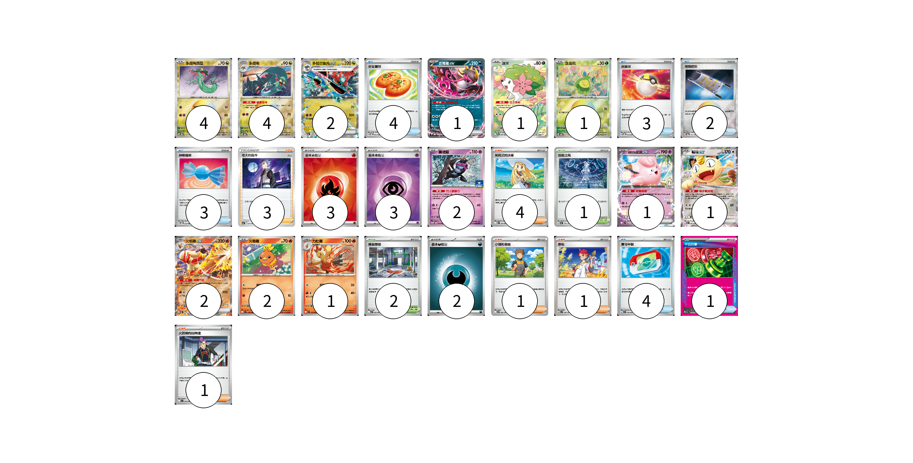 牌組構築方案 以此牌組為基礎新構築牌組 顯示卡面 顯示列表 寶可夢卡(22) 4 4 2 1 1 1 2 1 1 2 2 1 物品卡(17) 4 3 2 3 4 1 支援者卡(10) 3 4 1 1 1 競技場卡(3) 1 2 能量卡(8) 3 3 2 寶可夢卡(22) 卡牌名稱 張數 卡牌名稱 張數 多龍梅西亞 SV8a 118/187 04 多龍奇 SV8a 119/187 04 多龍巴魯托ex SV8a 120/187 02 吉雉雞ex SVOD 004/020 01 謝米 SV9a 066/063 01 含羞苞 SV8a 001/187 01 願增猿 M-P 014/M-P 02 <莉莉艾的>皮皮ex MC 287/742 01 喵喵ex M3 061/080 01 火焰雞ex SVM 016/175 02 火稚雞 SV10 018/098 02 力壯雞 SV10 019/098 01 物品卡(17) 卡牌名稱 張數 卡牌名稱 張數 好友寶芬 SVOD 011/020 04 高級球 SVOD 012/020 03 夜間擔架 SV8a 151/187 02 神奇糖果 SVOD 013/020 03 寶可平板 M3 070/080 04 不公印章 MC 633/742 01 支援者卡(10) 卡牌名稱 張數 卡牌名稱 張數 老大的指令(赤日) SVB 024/028 03 莉莉艾的決意 MBD 021/022 04 小剛的發掘 SV9 096/100 01 赤松 MC 696/742 01 火箭隊的拉姆達 SV10 094/098 01 競技場卡(3) 卡牌名稱 張數 卡牌名稱 張數 阻礙之塔 SV8a 181/187 01 險惡廢墟 M1L 063/063 02 能量卡(8) 卡牌名稱 張數 卡牌名稱 張數 基本【火】能量 SVM FIR 03 基本【超】能量 SVM PSY 03 基本【惡】能量 MC DAR 02 以此牌組為基礎新構築牌組 牌組編碼 OtKskS-pgrCBI-mXbpAt copy 列印牌組單 牌組編碼已複製 分享至SNS