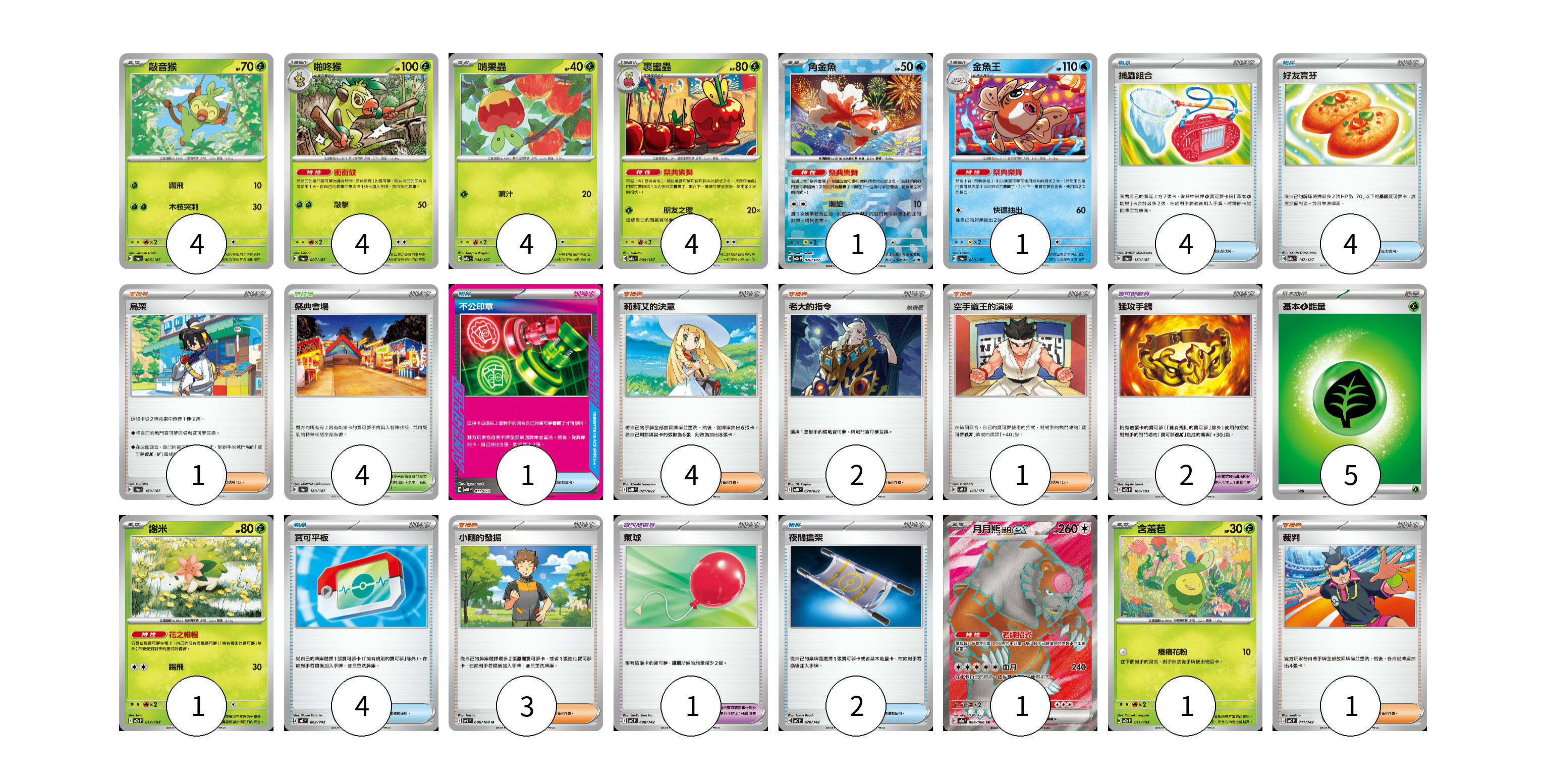 牌組構築方案 以此牌組為基礎新構築牌組 顯示卡面 顯示列表 寶可夢卡(21) 4 4 4 4 1 1 1 1 1 寶可夢道具(3) 2 1 物品卡(15) 4 4 1 4 2 支援者卡(12) 1 4 2 1 3 1 競技場卡(4) 4 能量卡(5) 5 寶可夢卡(21) 卡牌名稱 張數 卡牌名稱 張數 敲音猴 SV8a 006/187 04 啪咚猴 SV8a 007/187 04 啃果蟲 SV8a 008/187 04 裹蜜蟲 SV8a 009/187 04 角金魚 SV8a 028/187 01 金魚王 SV8a 029/187 01 謝米 M2a 012/193 01 月月熊 赫月 ex SV5a 084/066 01 含羞苞 M2a 011/193 01 寶可夢道具(3) 卡牌名稱 張數 卡牌名稱 張數 猛攻手鐲 M2a 166/193 02 氣球 MC 688/742 01 物品卡(15) 卡牌名稱 張數 卡牌名稱 張數 捕蟲組合 SV8a 150/187 04 好友寶芬 SV8a 147/187 04 不公印章 MBD 011/022 01 寶可平板 MC 662/742 04 夜間擔架 MC 670/742 02 支援者卡(12) 卡牌名稱 張數 卡牌名稱 張數 烏栗 SV8a 169/187 01 莉莉艾的決意 MBD 021/022 04 老大的指令 MBD 020/022 02 空手道王的演練 SVM 143/175 01 小剛的發掘 SV9 096/100 03 裁判 MC 711/742 01 競技場卡(4) 卡牌名稱 張數 卡牌名稱 張數 祭典會場 SV8a 180/187 04 能量卡(5) 卡牌名稱 張數 卡牌名稱 張數 基本【草】能量 M-P GRA 05 以此牌組為基礎新構築牌組 牌組編碼 OxlloY-MuAhNm-lGOYUb copy 列印牌組單 牌組編碼已複製 分享至SNS