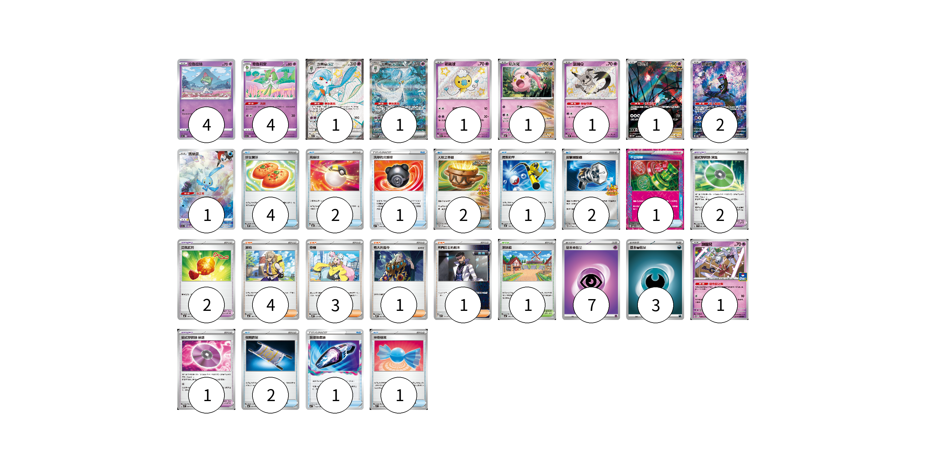 牌組構築方案 以此牌組為基礎新構築牌組 顯示卡面 顯示列表 寶可夢卡(18) 4 4 1 1 1 1 1 1 2 1 1 寶可夢道具(5) 2 2 1 物品卡(17) 4 2 1 2 1 2 1 2 1 1 支援者卡(9) 4 3 1 1 競技場卡(1) 1 能量卡(10) 7 3 寶可夢卡(18) 卡牌名稱 張數 卡牌名稱 張數 拉魯拉絲 S9a 032/067 04 奇魯莉安 S11a 037/068 04 沙奈朵ex SV4a 328/190 01 沙奈朵ex SV4a 348/190 01 飄飄球 SV4a 260/190 01 吼叫尾 SV4K 032/066 01 謎擬Q SV4a 265/190 01 振翼髮 SV5K 076/071 01 願增猿 SV6 107/101 02 瑪納霏 S12a 178/172 01 鑰圈兒 SV-P 089/SV-P 01 寶可夢道具(5) 卡牌名稱 張數 卡牌名稱 張數 招式學習器 演進 SV4M 063/066 02 勇氣護符 SV4a 169/190 02 招式學習器 衰退 SVK 026/042 01 物品卡(17) 卡牌名稱 張數 卡牌名稱 張數 好友寶芬 SV5K 063/071 04 高級球 SVHK 013/022 02 洗翠的沉重球 SVF 019/038 01 大地之容器 SV-P 084/SV-P 02 厲害釣竿 SV4a 158/190 01 反擊捕捉器 SV-P 083/SV-P 02 不公印章 SV5a 053/066 01 夜間擔架 SV6a 056/064 02 放逐吸塵器 SVF 023/038 01 神奇糖果 SVK 019/042 01 支援者卡(9) 卡牌名稱 張數 卡牌名稱 張數 派帕 SV4a 180/190 04 奇樹 SVHK 019/022 03 老大的指令 SVHK 022/022 01 弗圖博士的劇本 SVHM 021/022 01 競技場卡(1) 卡牌名稱 張數 卡牌名稱 張數 深缽鎮 SV4a 185/190 01 能量卡(10) 卡牌名稱 張數 卡牌名稱 張數 基本【超】能量 SVHM PSY 07 基本【惡】能量 SVF DAR 03 以此牌組為基礎新構築牌組 牌組編碼 Oynqbc-cSePPy-ItHCwK copy 列印牌組單 牌組編碼已複製 分享至SNS