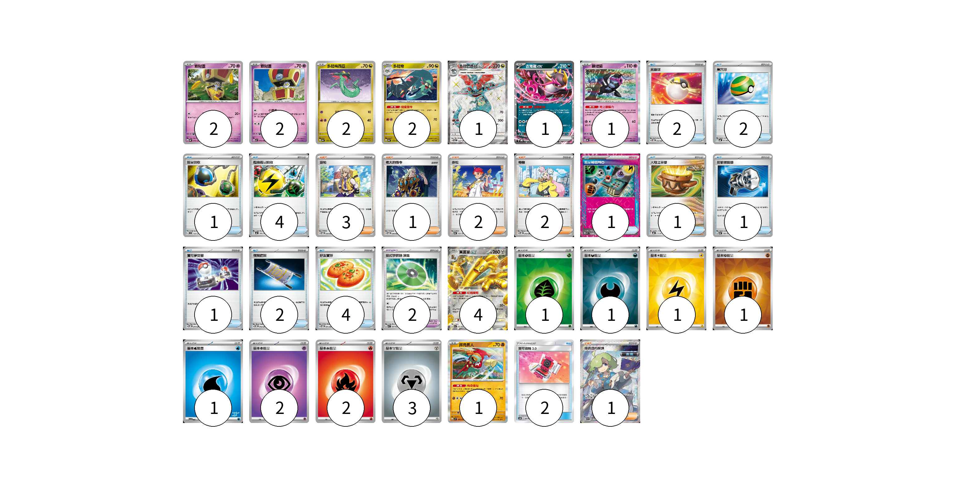 牌組構築方案 以此牌組為基礎新構築牌組 顯示卡面 顯示列表 寶可夢卡(16) 2 2 2 2 1 1 1 4 1 寶可夢道具(2) 2 物品卡(21) 2 2 1 4 1 1 1 1 2 4 2 支援者卡(9) 3 1 2 2 1 能量卡(12) 1 1 1 1 1 2 2 3 寶可夢卡(16) 卡牌名稱 張數 卡牌名稱 張數 索財靈 SV8a 073/187 02 索財靈 SV7a 024/064 02 多龍梅西亞 SV8a 118/187 02 多龍奇 SV8a 119/187 02 多龍巴魯托ex SV6 120/101 01 吉雉雞ex SVOD 004/020 01 願增猿 SV8a 075/187 01 賽富豪ex SV3a 050/062 04 摔角鷹人 SV1S 045/078 01 寶可夢道具(2) 卡牌名稱 張數 卡牌名稱 張數 招式學習器 演進 SVK 025/042 02 物品卡(21) 卡牌名稱 張數 卡牌名稱 張數 高級球 SVOD 012/020 02 巢穴球 SVHK 012/022 02 能量回收 SVD 110/139 01 超級能量回收 SV4a 157/190 04 能量輸送PRO SV7a 052/064 01 大地之容器 SVHK 011/022 01 反擊捕捉器 SV8a 139/187 01 寶可夢交替 SVOD 014/020 01 夜間擔架 SVOM 016/021 02 好友寶芬 SVOD 011/020 04 寶可齒輪3.0 AS6b 190/194 02 支援者卡(9) 卡牌名稱 張數 卡牌名稱 張數 派帕 SVOD 018/020 03 老大的指令 SVOD 019/020 01 赤松 SV8a 163/187 02 奇樹 SVOD 016/020 02 暗碼迷的解讀 SV5M 090/071 01 能量卡(12) 卡牌名稱 張數 卡牌名稱 張數 基本【草】能量 SVK GRA 01 基本【惡】能量 SVK DAR 01 基本【雷】能量 SVK LIG 01 基本【鬥】能量 SVK FIG 01 基本【水】能量 SVI WAT 01 基本【超】能量 SVTS PSY 02 基本【火】能量 SVHK FIR 02 基本【鋼】能量 SVTH MET 03 以此牌組為基礎新構築牌組 牌組編碼 PBhRTP-hLMEOK-KRtYZF copy 列印牌組單 牌組編碼已複製 分享至SNS