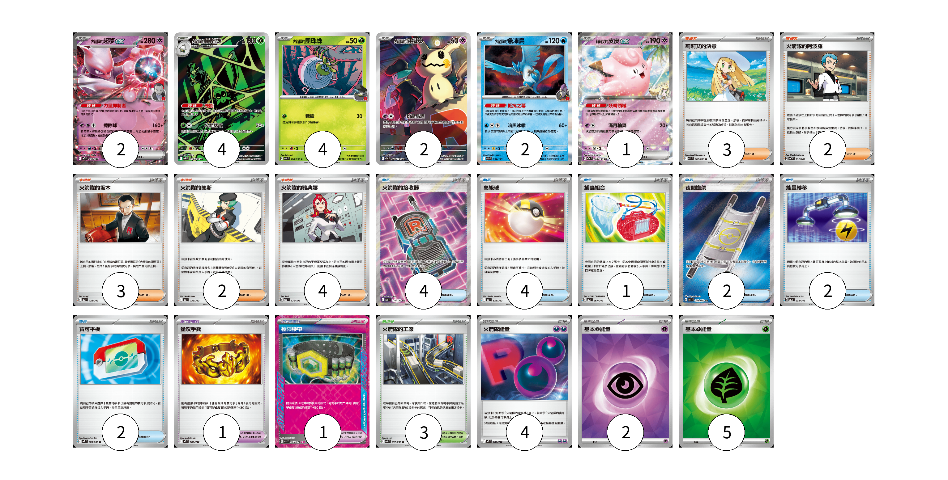 牌組構築方案 以此牌組為基礎新構築牌組 顯示卡面 顯示列表 寶可夢卡(15) 2 4 4 2 2 1 寶可夢道具(2) 1 1 物品卡(15) 4 4 1 2 2 2 支援者卡(14) 3 2 3 2 4 競技場卡(3) 3 能量卡(11) 4 2 5 寶可夢卡(15) 卡牌名稱 張數 卡牌名稱 張數 <火箭隊的>超夢ex MC 290/742 02 <火箭隊的>操陷蛛 SV10 099/098 04 <火箭隊的>團珠蛛 SV10 008/098 04 <火箭隊的>謎擬Q M2a 205/193 02 <火箭隊的>急凍鳥 M2a 034/193 02 莉莉艾的皮皮ex M2a 060/193 01 寶可夢道具(2) 卡牌名稱 張數 卡牌名稱 張數 猛攻手鐲 MC 689/742 01 極限腰帶 SV5K 066/071 01 物品卡(15) 卡牌名稱 張數 卡牌名稱 張數 火箭隊的接收器 M2a 217/193 04 高級球 MC 651/742 04 捕蟲組合 MC 667/742 01 夜間擔架 M1L 083/063 02 能量轉移 MC 638/742 02 寶可平板 M3 070/080 02 支援者卡(14) 卡牌名稱 張數 卡牌名稱 張數 莉莉艾的決意 M1L 062/063 03 火箭隊的阿波羅 MC 732/742 02 火箭隊的坂木 MC 733/742 03 火箭隊的蘭斯 MC 735/742 02 火箭隊的雅典娜 M2a 176/193 04 競技場卡(3) 卡牌名稱 張數 卡牌名稱 張數 火箭隊的工廠 SV10 097/098 03 能量卡(11) 卡牌名稱 張數 卡牌名稱 張數 火箭隊能量 MC 742/742 04 基本【超】能量 SVOD PSY 02 基本【草】能量 SVM GRA 05 以此牌組為基礎新構築牌組 牌組編碼 PCpuRE-WQLcLr-tzcXkR copy 列印牌組單 牌組編碼已複製 分享至SNS