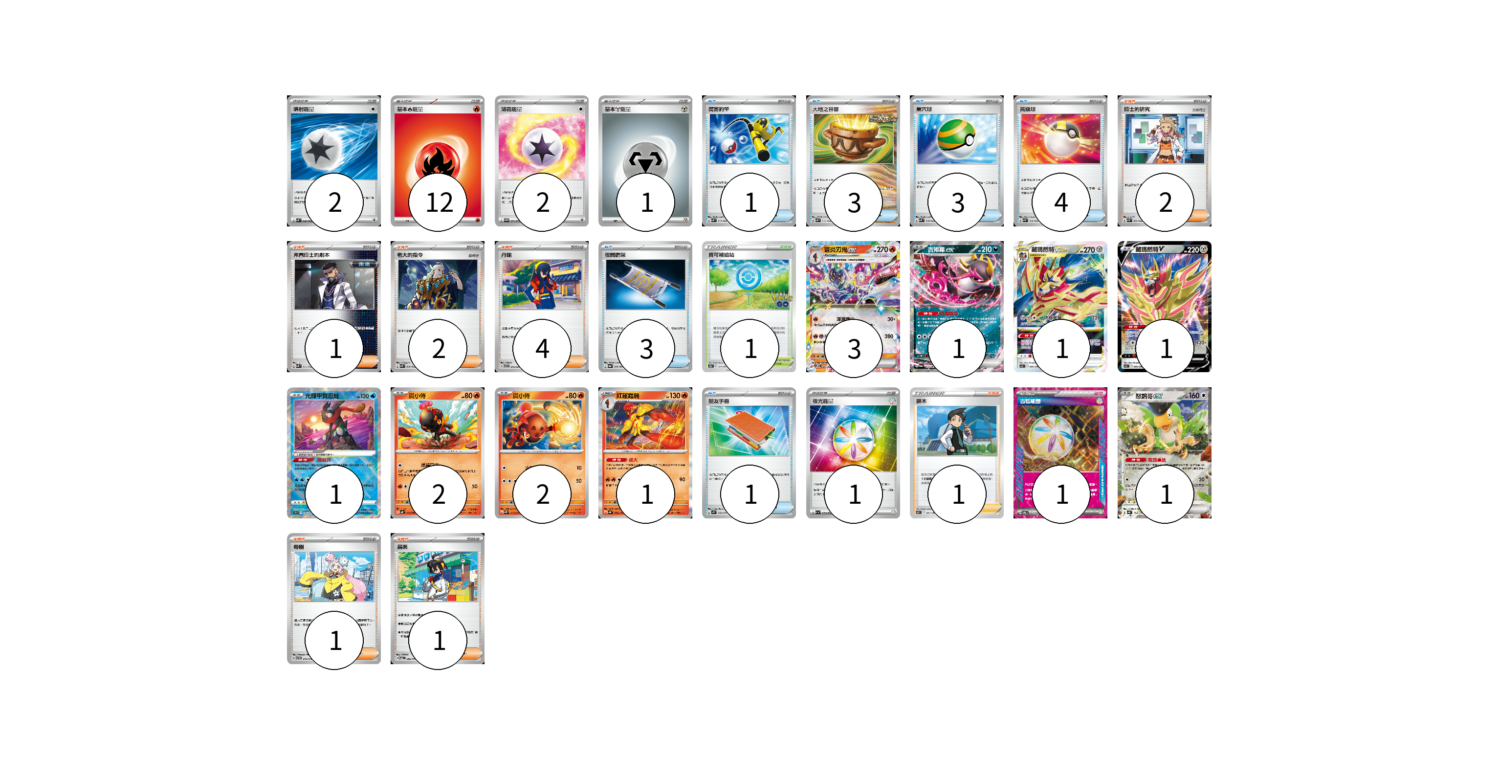 牌組構築方案 以此牌組為基礎新構築牌組 顯示卡面 顯示列表 寶可夢卡(13) 3 1 1 1 1 2 2 1 1 物品卡(15) 1 3 3 4 3 1 支援者卡(12) 2 1 2 4 1 1 1 競技場卡(1) 1 能量卡(19) 2 12 2 1 1 1 寶可夢卡(13) 卡牌名稱 張數 卡牌名稱 張數 蒼炎刃鬼ex SVPS 006/008 03 吉雉雞ex SV6a 038/064 01 藏瑪然特VSTAR SP6 006/006 01 藏瑪然特V SP6 005/006 01 光輝甲賀忍蛙 S9a 026/067 01 炭小侍 SV4K 014/066 02 炭小侍 SV2D 015/071 02 紅蓮鎧騎 SV4a 034/190 01 怒鸚哥ex SV4a 154/190 01 物品卡(15) 卡牌名稱 張數 卡牌名稱 張數 厲害釣竿 SVK 011/042 01 大地之容器 SVK 012/042 03 巢穴球 SVK 016/042 03 高級球 SVK 018/042 04 夜間擔架 SV6a 056/064 03 朋友手冊 SV1S 069/078 01 支援者卡(12) 卡牌名稱 張數 卡牌名稱 張數 博士的研究 SVK 032/042 02 弗圖博士的劇本 SVK 034/042 01 老大的指令 SVK 036/042 02 丹瑜 SVTR 016/021 04 捩木 S11 097/100 01 奇樹 SVTH 015/018 01 烏栗 SV6 096/101 01 競技場卡(1) 卡牌名稱 張數 卡牌名稱 張數 寶可補給站 S10b 071/071 01 能量卡(19) 卡牌名稱 張數 卡牌名稱 張數 噴射能量 SVK 040/042 02 基本【火】能量 SVTL FIR 12 薄霧能量 SV5M 071/071 02 基本【鋼】能量 SVTH MET 01 夜光能量 SV1a 073/073 01 古舊能量 SV6 101/101 01 以此牌組為基礎新構築牌組 牌組編碼 PExLvE-shgfst-XYfKRL copy 列印牌組單 牌組編碼已複製 分享至SNS